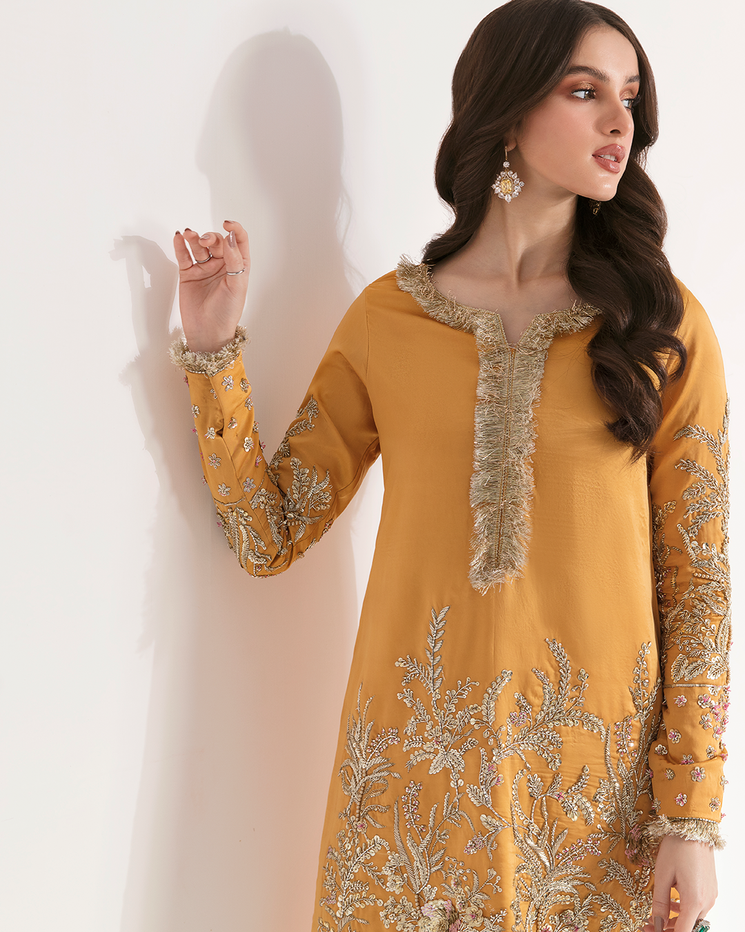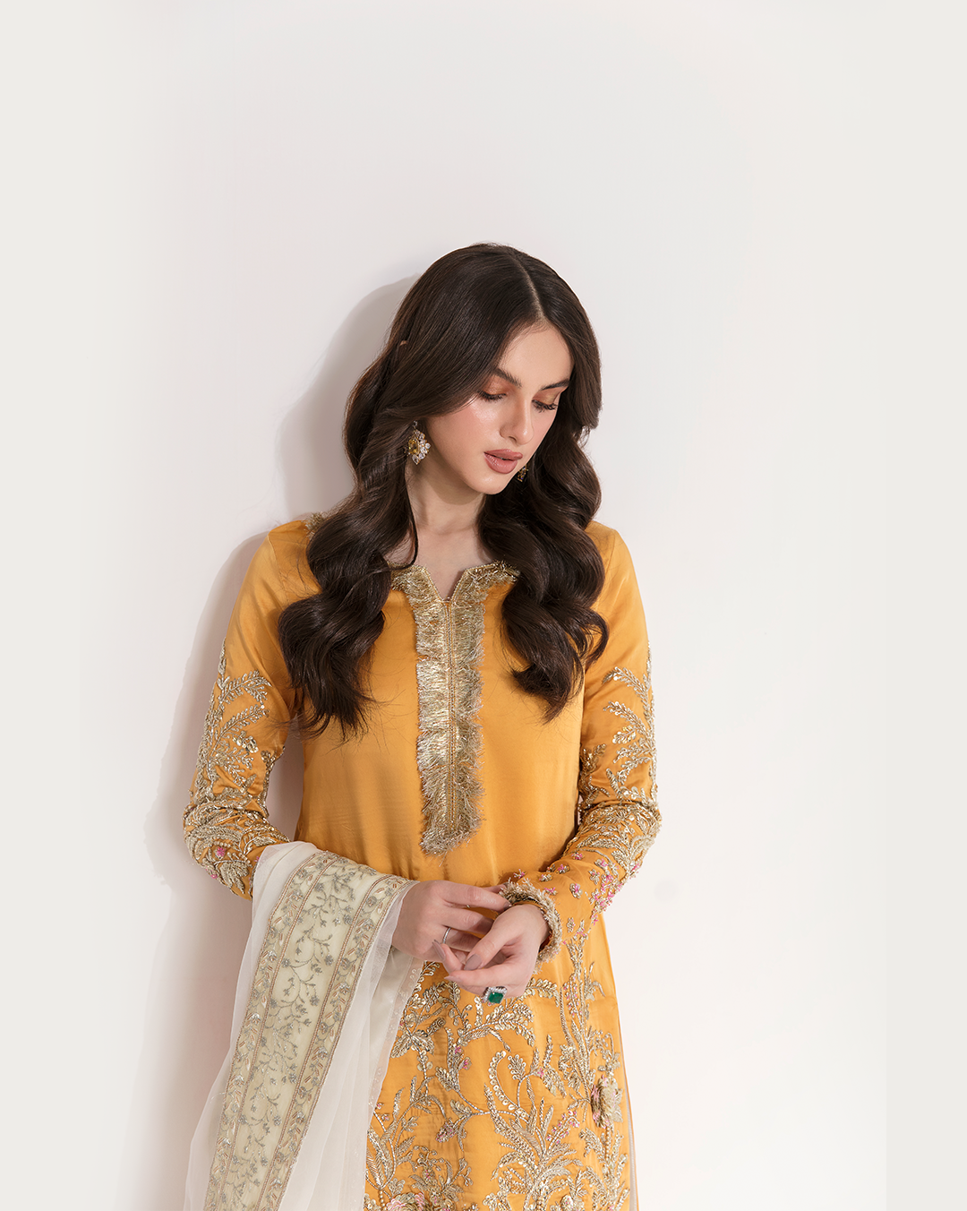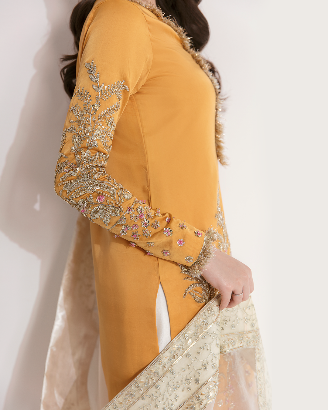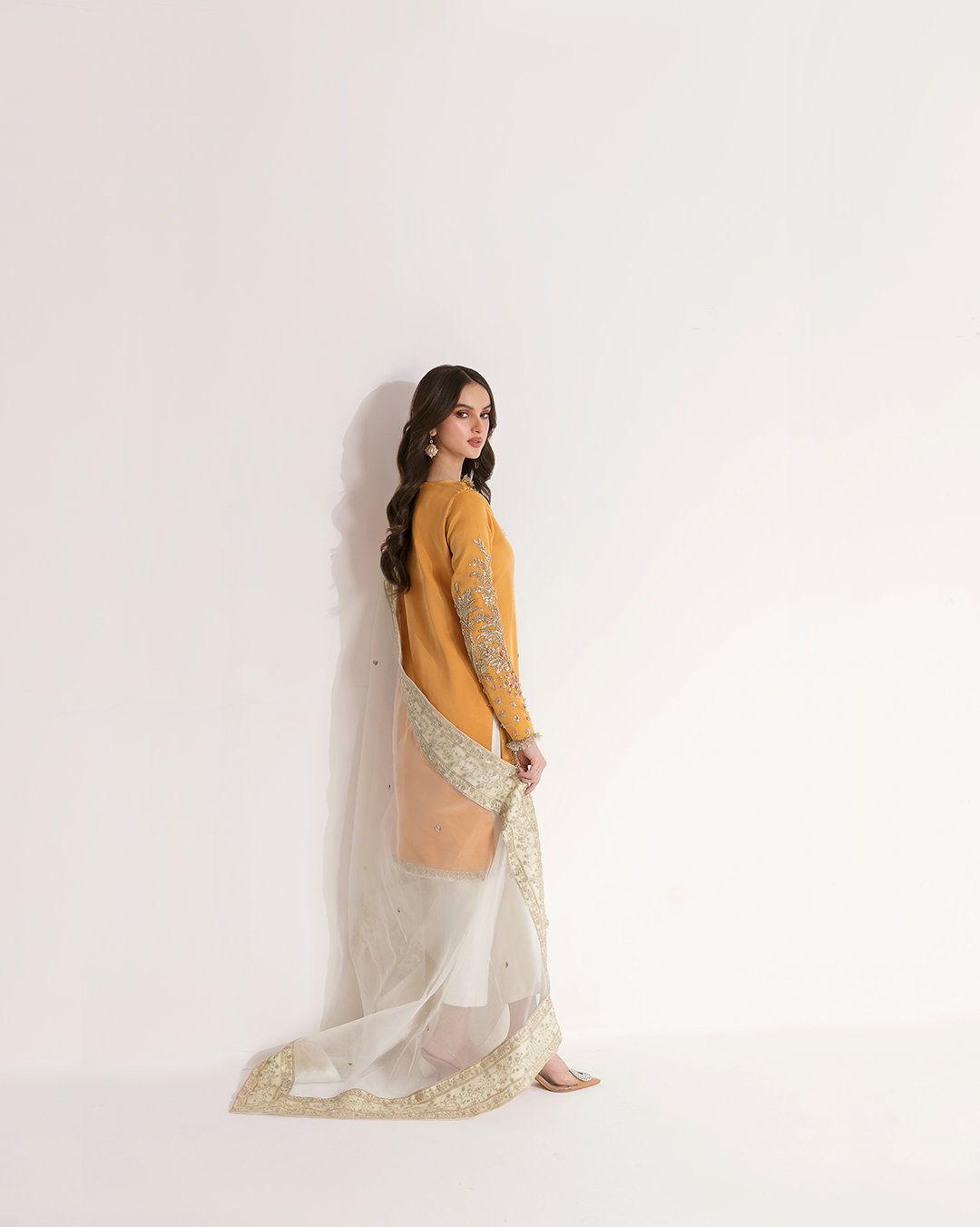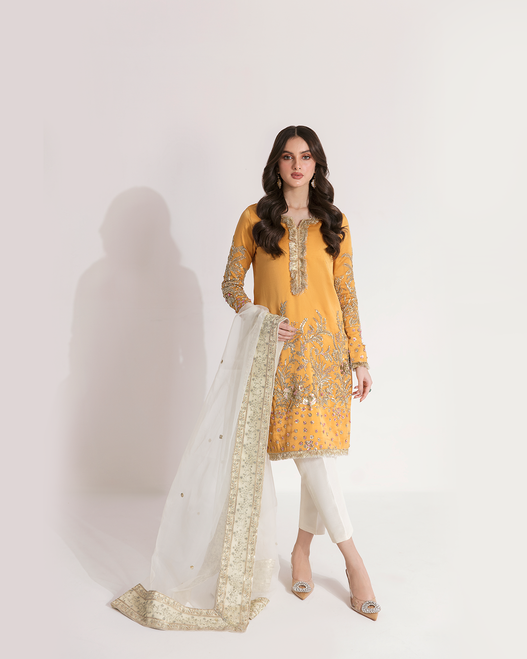 This breathtaking mustard knee-length shirt is adorned with intricate gold embellishments, further accentuated by the delicate kiran lace detailing on the neckline and sleeves. It is perfectly paired with white cigarette pants, creating a seamless balance of contrasting tones. The organza dupatta adds a touch of elegance with its four-sided embellished border and delicate spray.
