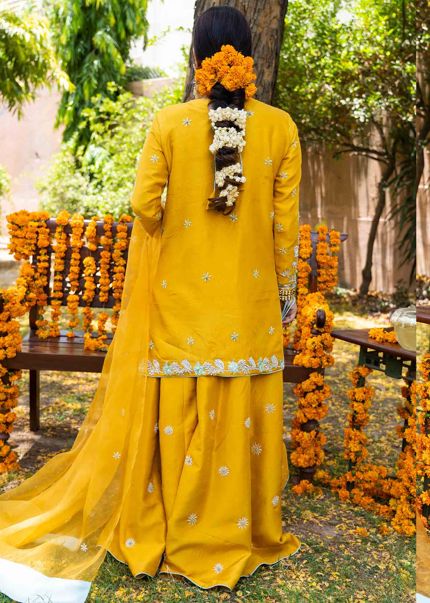 Description: Weaving the tinkling dreams within the shades of amorous sunshine, masakali basks in the reverie of golden hour wearing the chimera of mustard shades glazed with crystals and subtle embellishments oozing the aura of maverick nature.MADE IN PURE 80 GMS RAW SILK WHICH IS FUSED USING TURKISH NET FUSING AND PURE ORGANZA TOTALLY HAND EMBELLISHED AND ORGANZA DUPATTA EMBELLISHED.