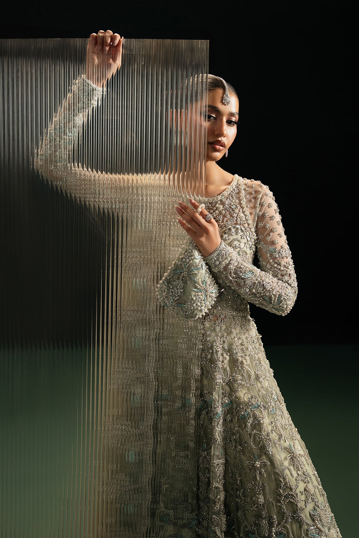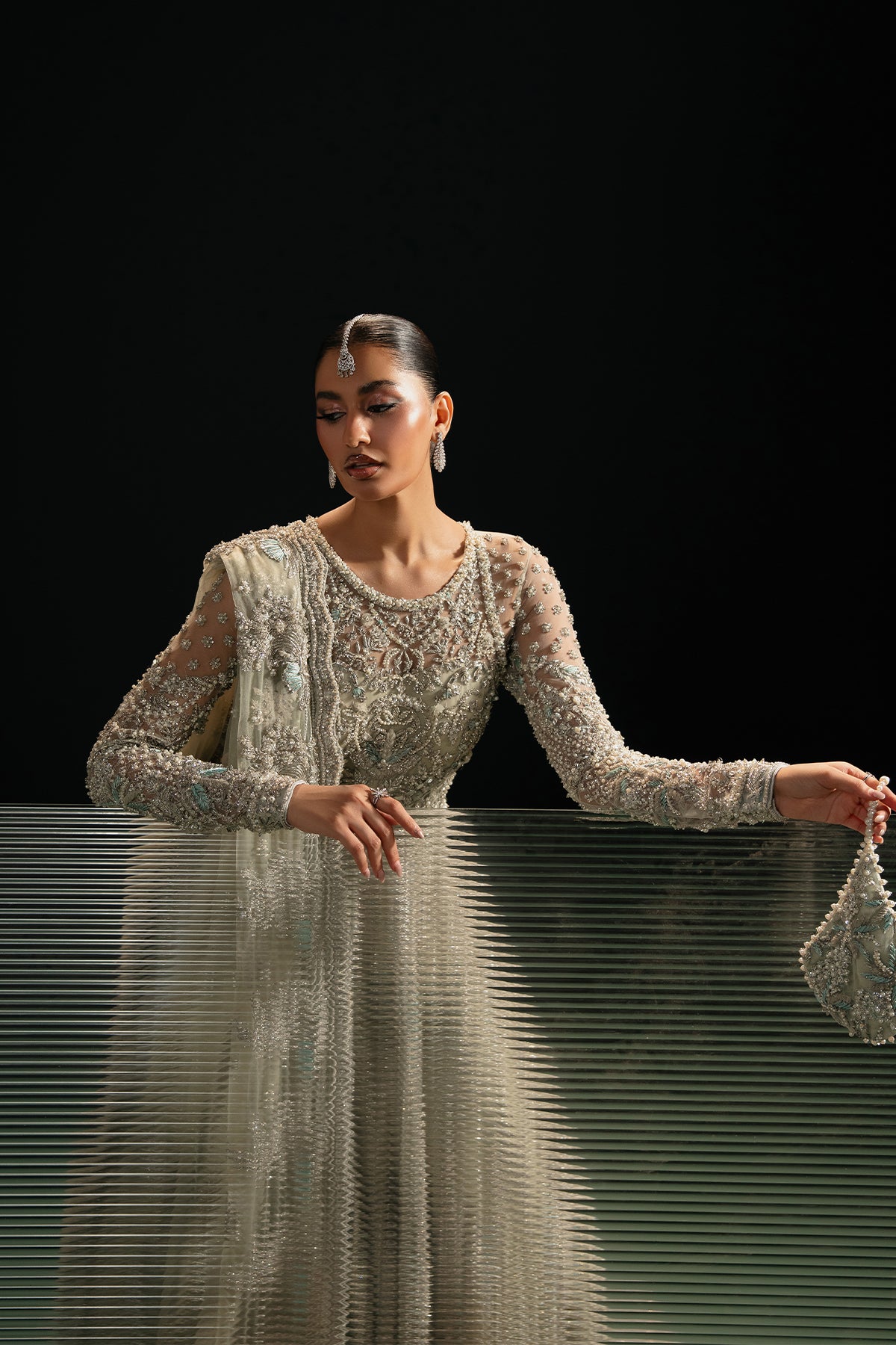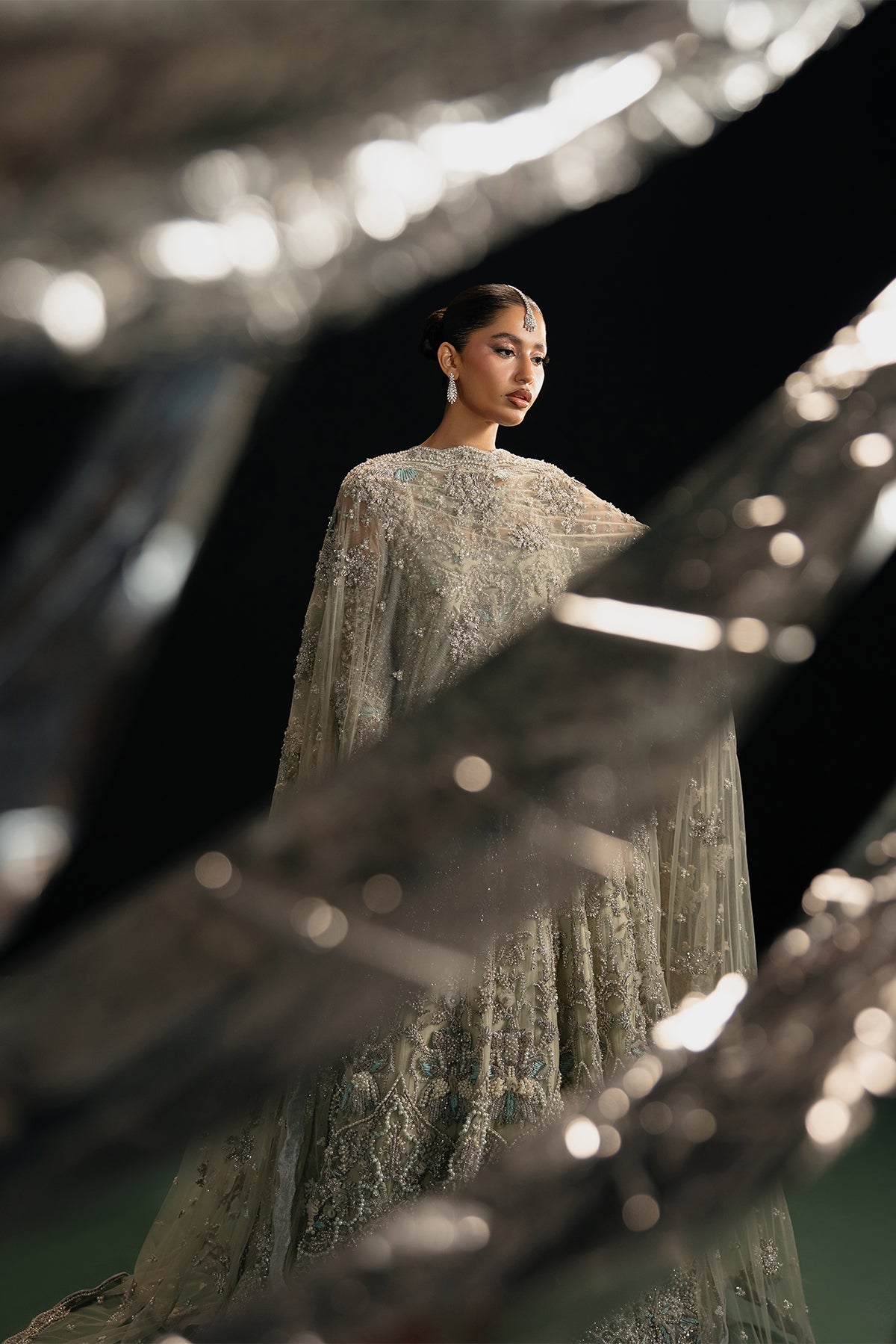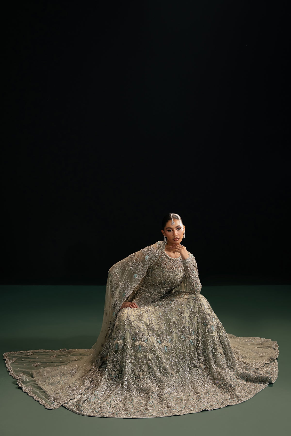 A bridal masterpiece in sage green. The ethereal net gown, ornamented in intricate 3D handwork, shimmers with a medley of naqshi, dabka, delicate threadwork, and diamanté accents. It is gracefully paired with a plain satin silk lehenga. A scalloped net dupatta, exquisitely embellished along the borders and scattered with a sumptuous spray of ornate motifs, drapes the look in an aura of elegance.