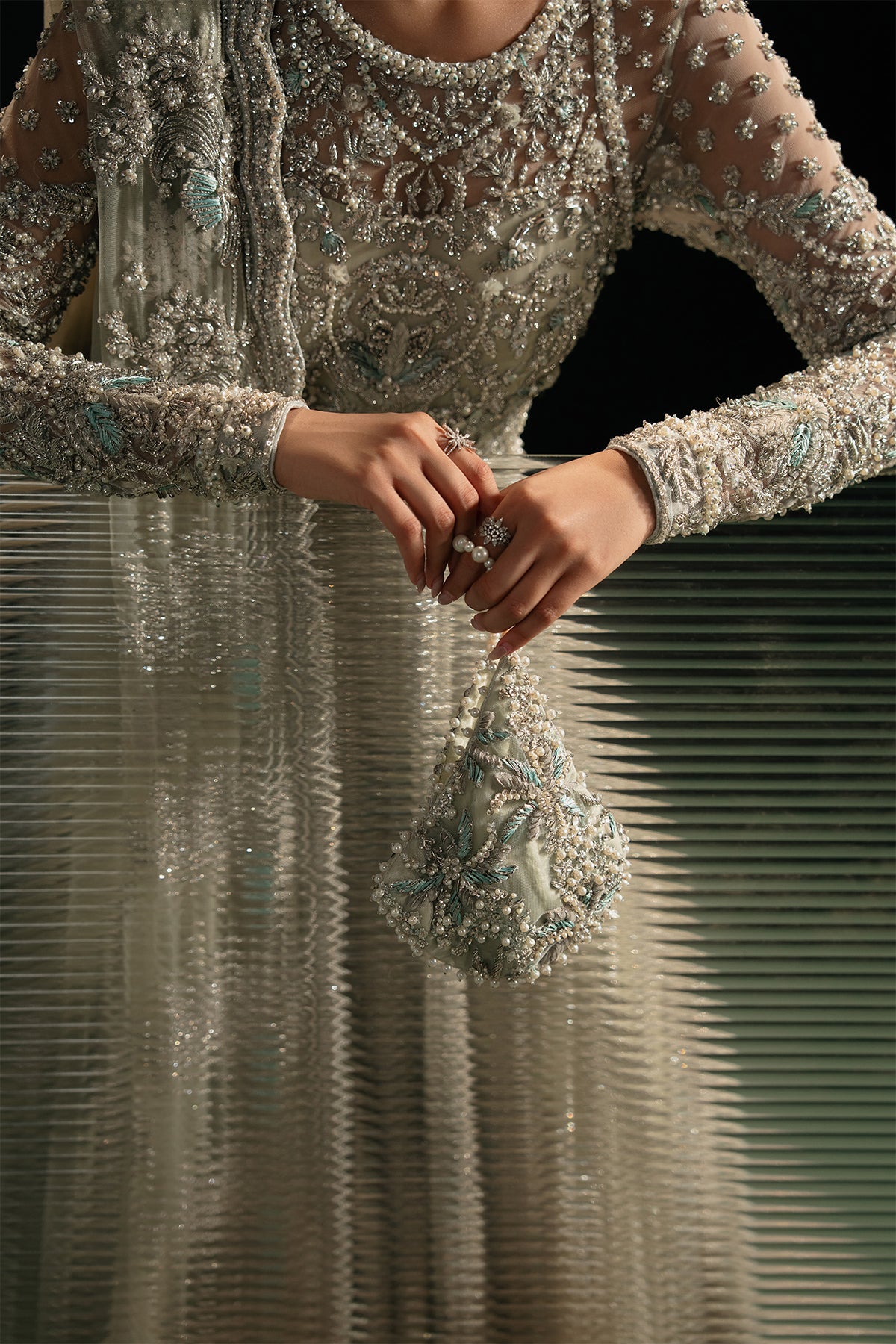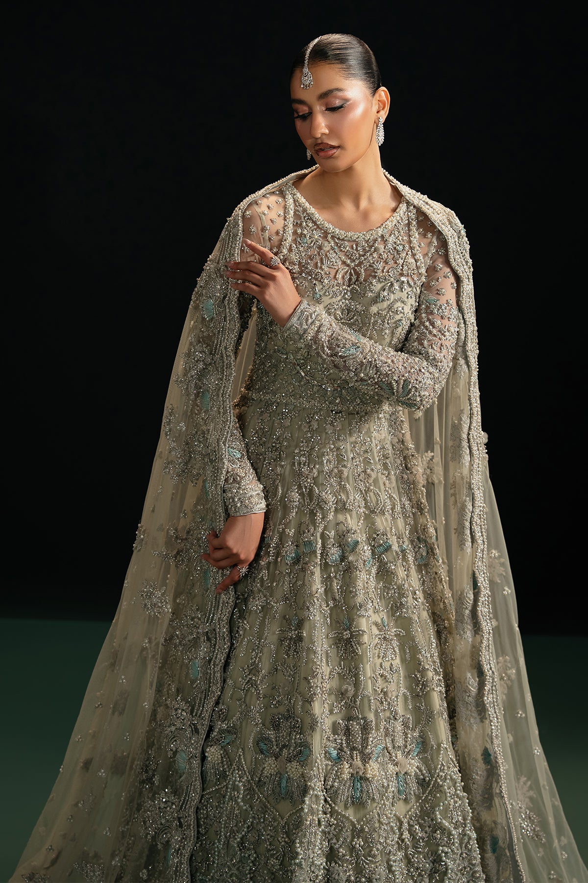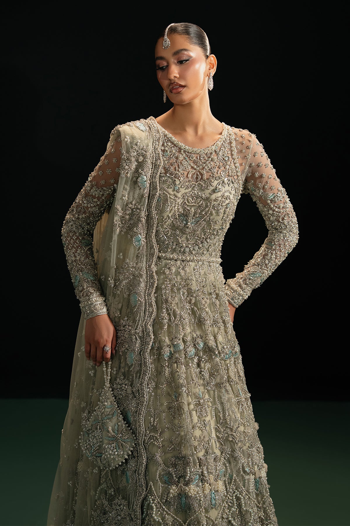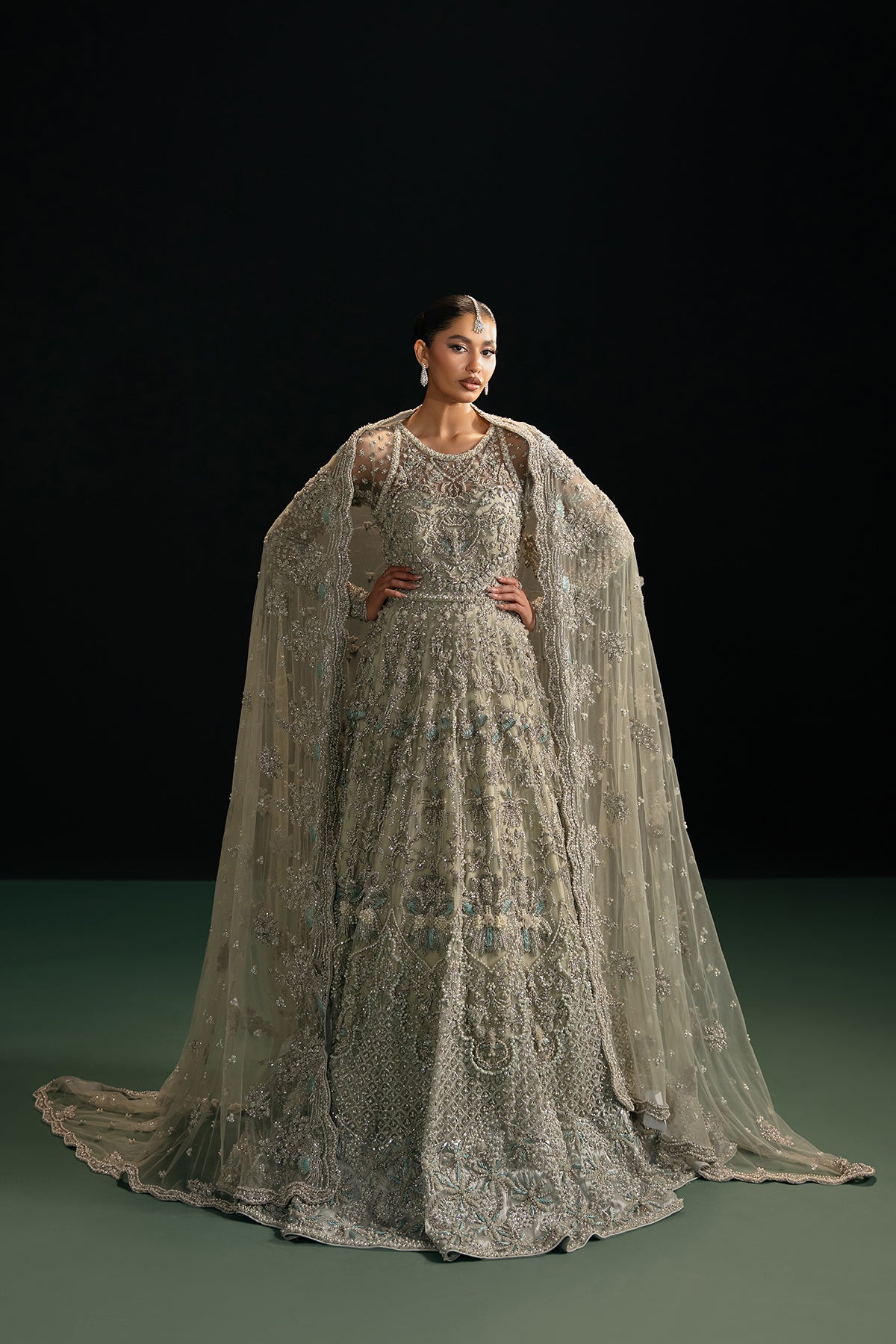 A bridal masterpiece in sage green. The ethereal net gown, ornamented in intricate 3D handwork, shimmers with a medley of naqshi, dabka, delicate threadwork, and diamanté accents. It is gracefully paired with a plain satin silk lehenga. A scalloped net dupatta, exquisitely embellished along the borders and scattered with a sumptuous spray of ornate motifs, drapes the look in an aura of elegance.