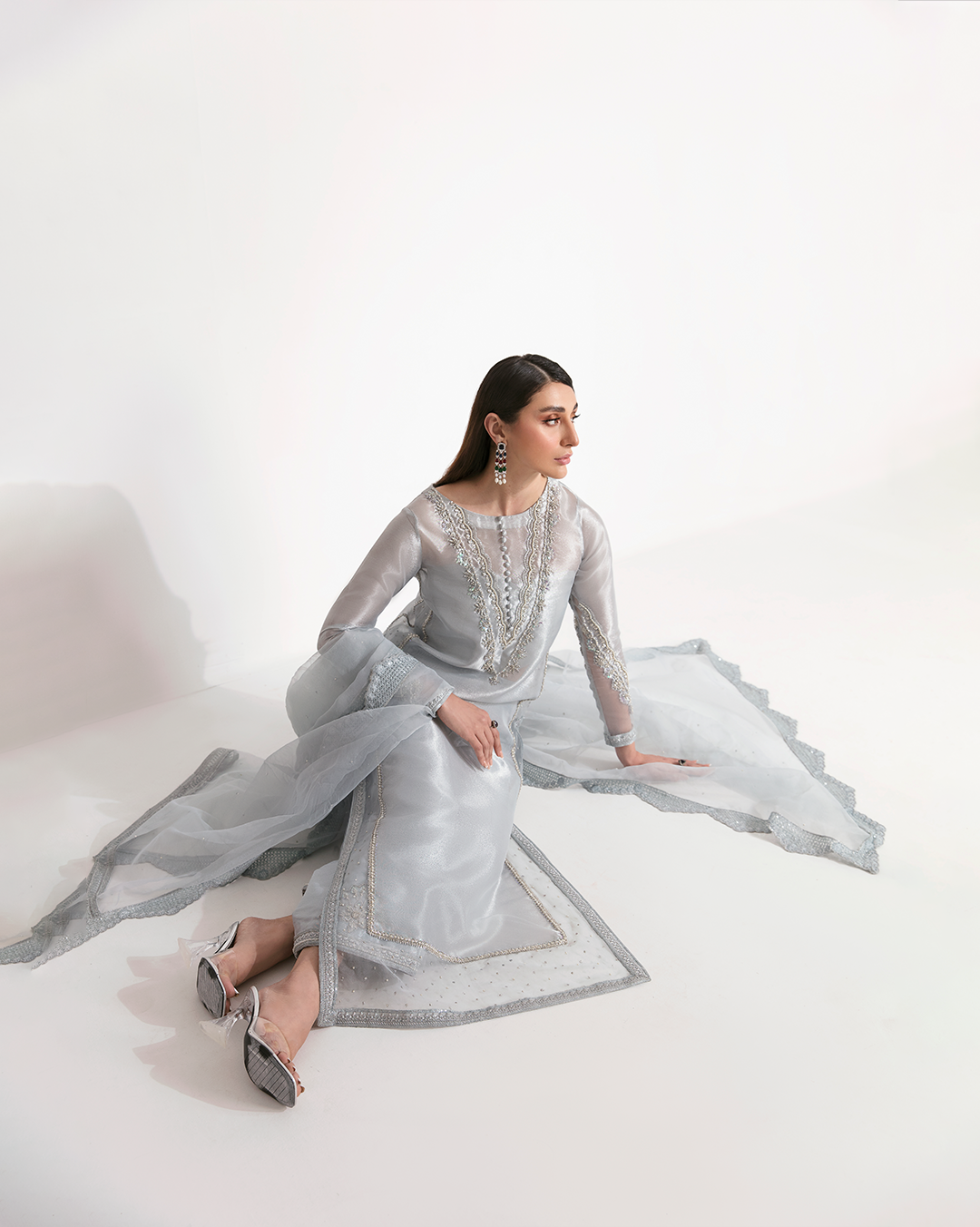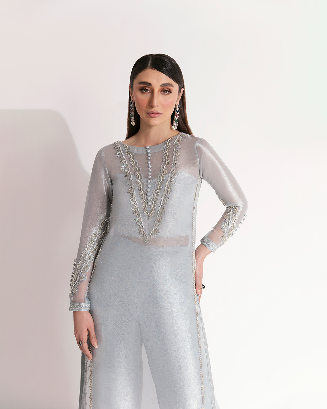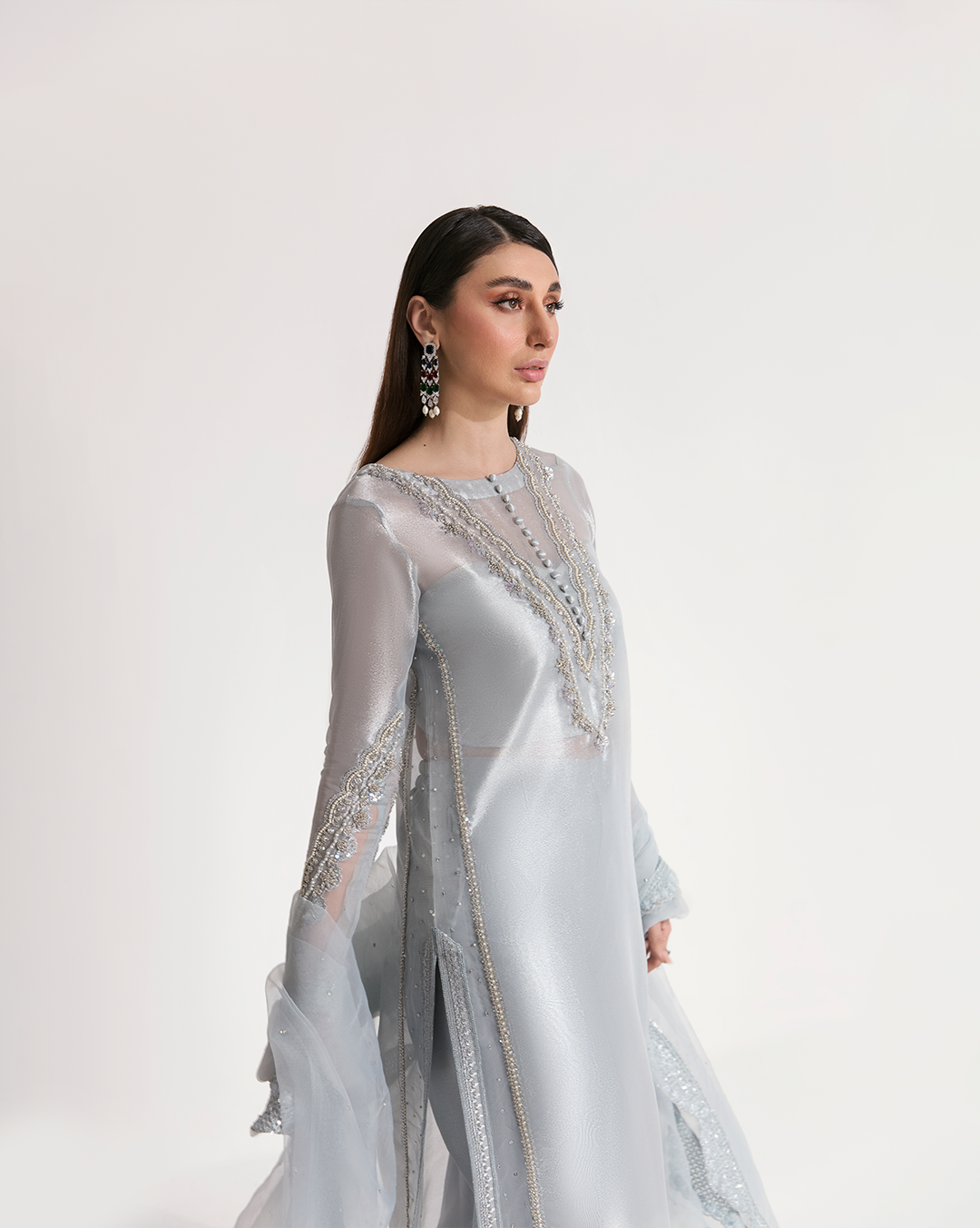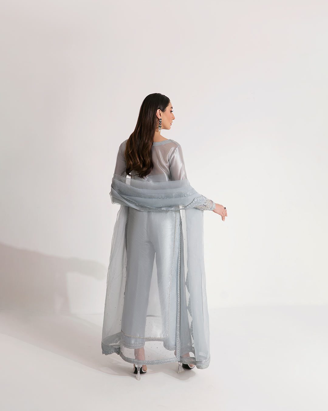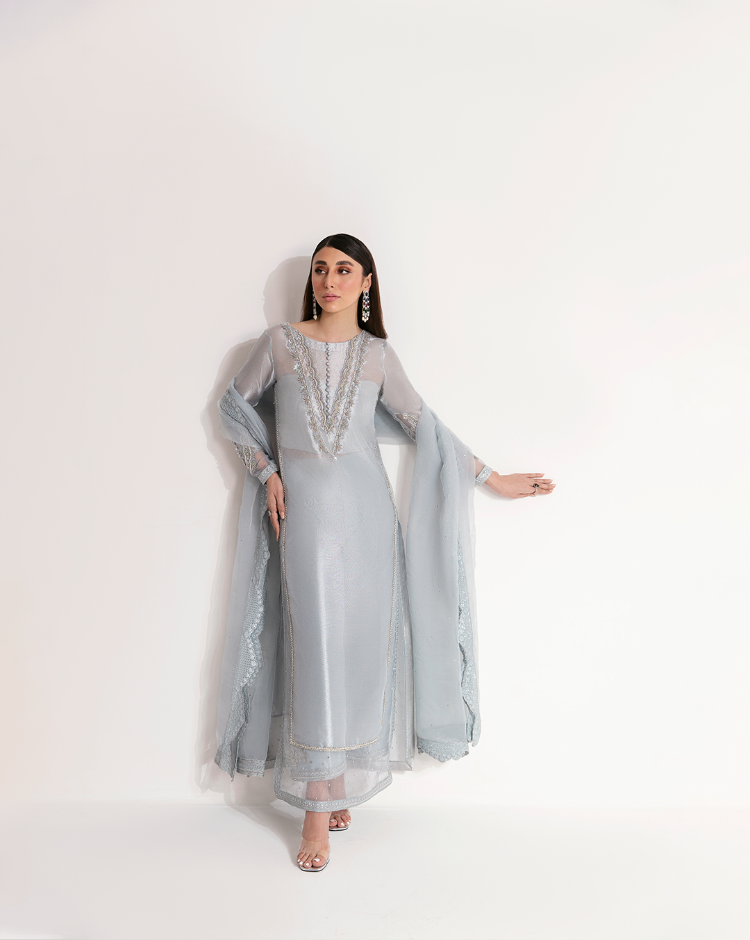 A fabulous celeste blue organza shirt featuring delicate handwork on the neckline, hemline, and sleeves. Paired with wide-bottom pants adorned with a matching embroidered border and an organza dupatta with multi-head scalloped borders gives a finishing touch to this enchanting outfit.