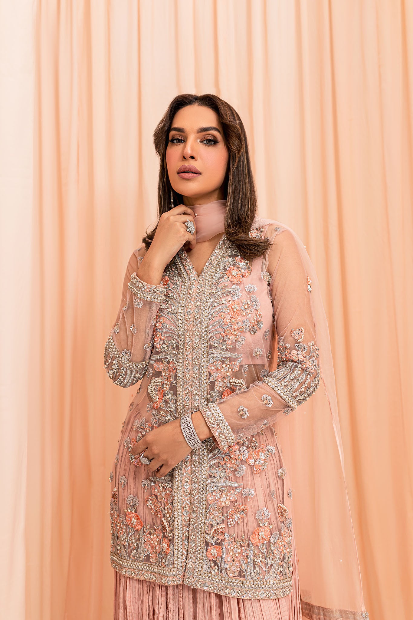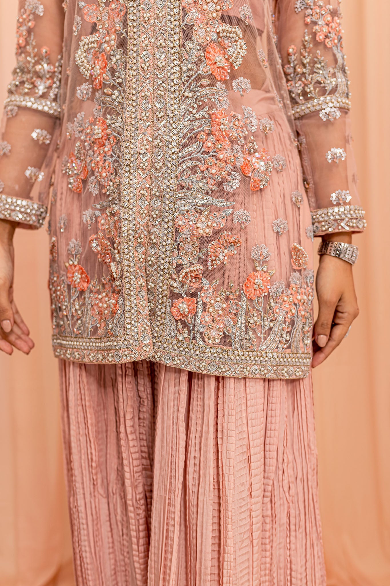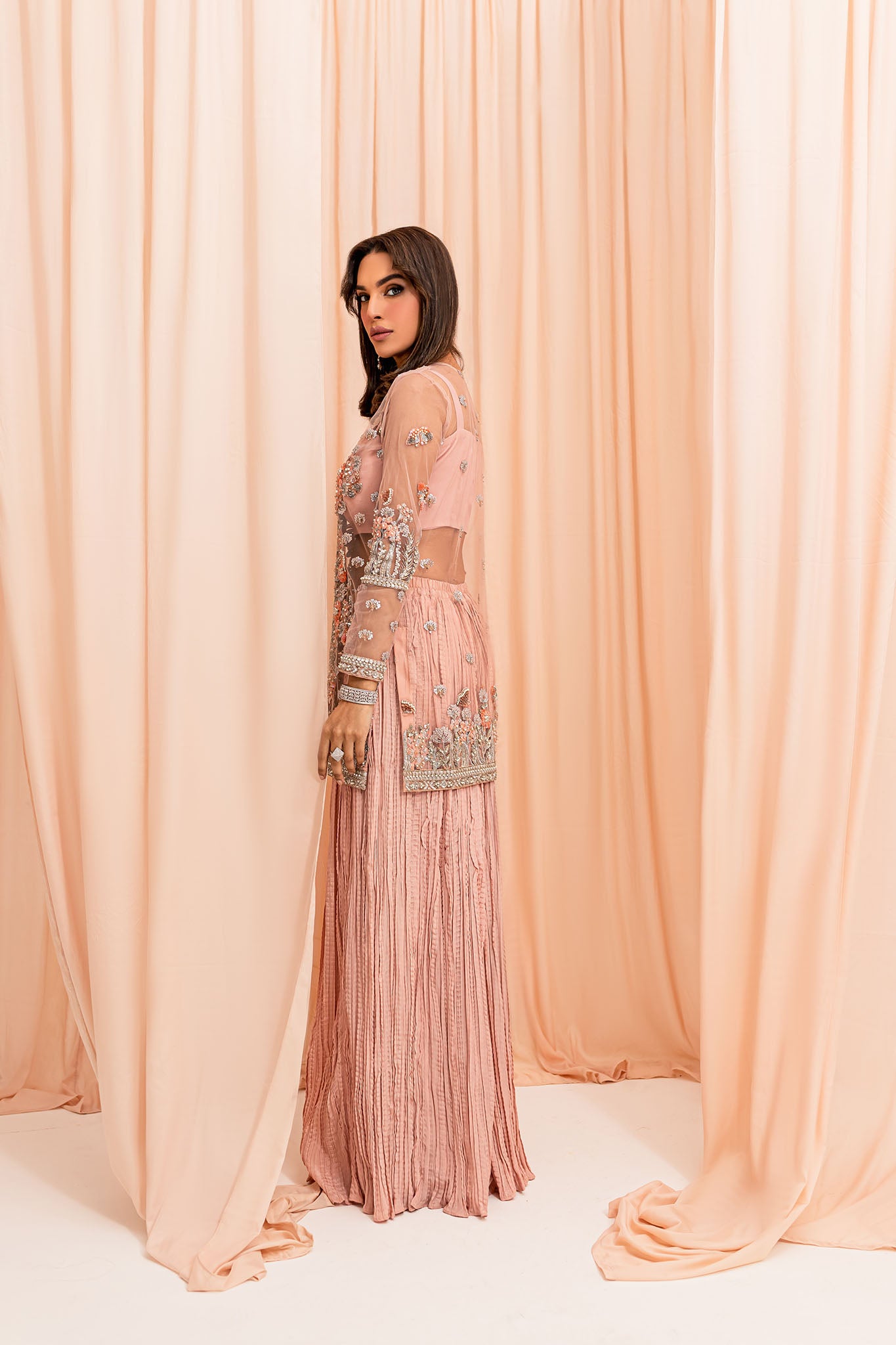Description: Enthralling rose peach jacket crafted on luxuriant net along with crushed sharara.