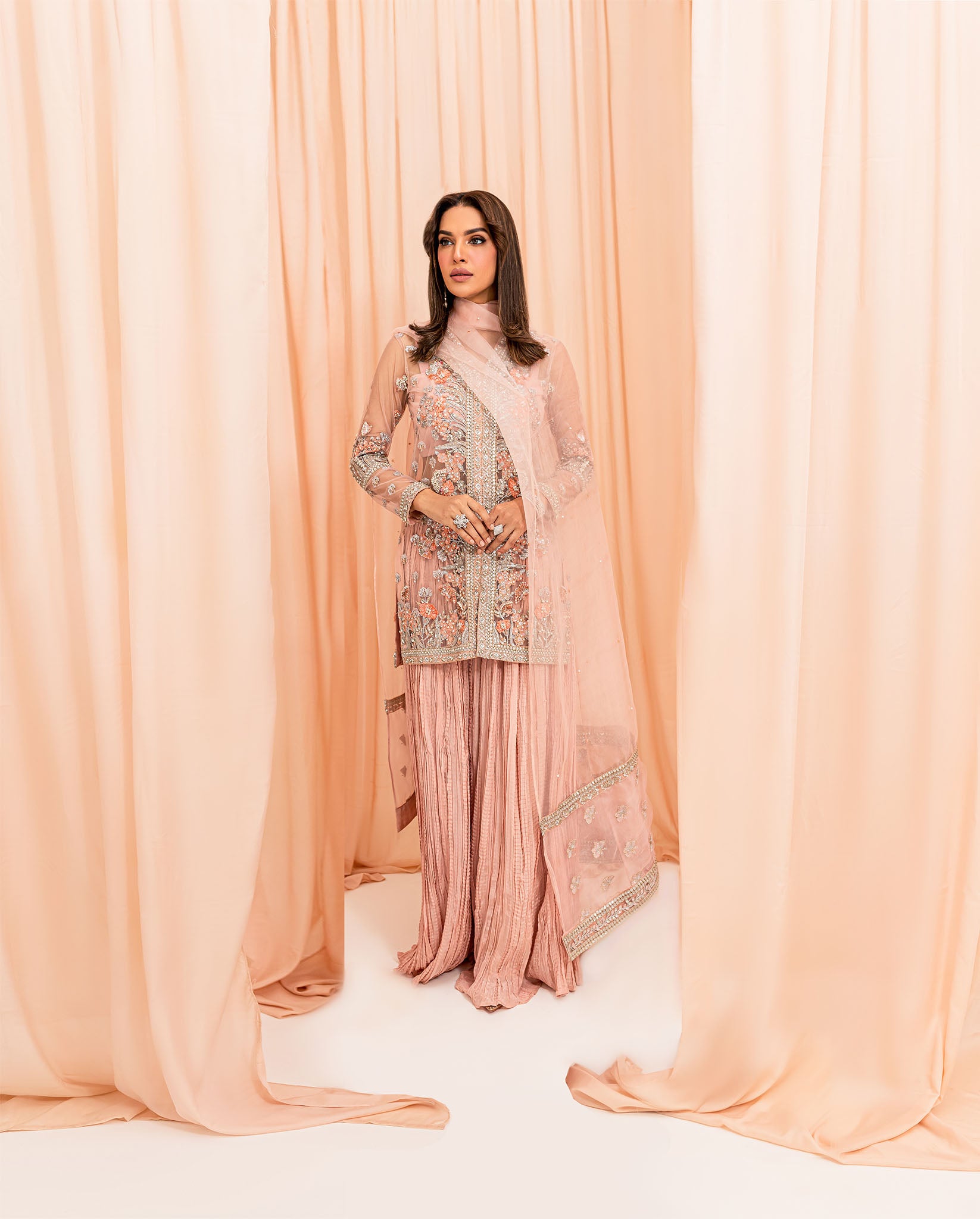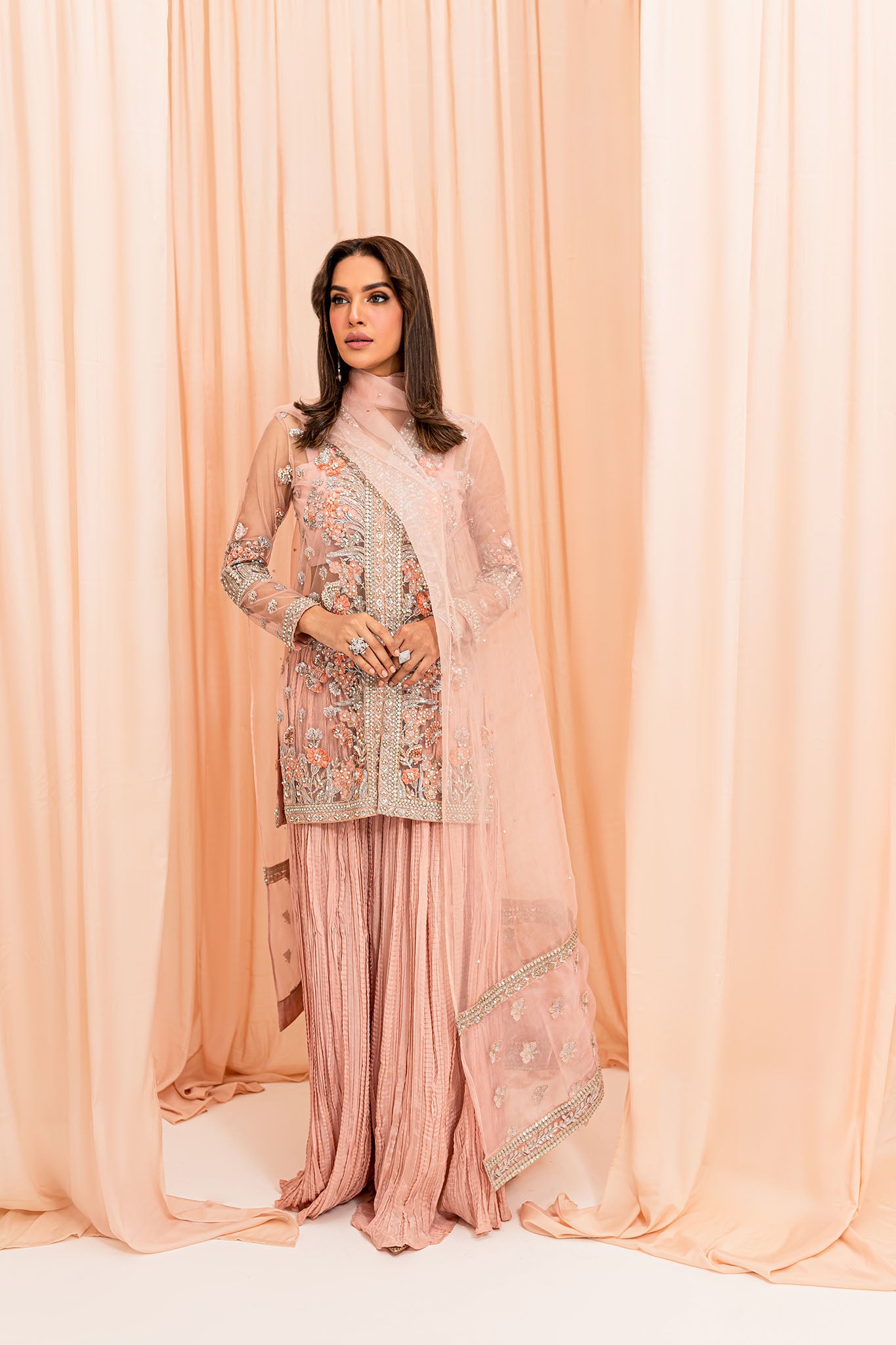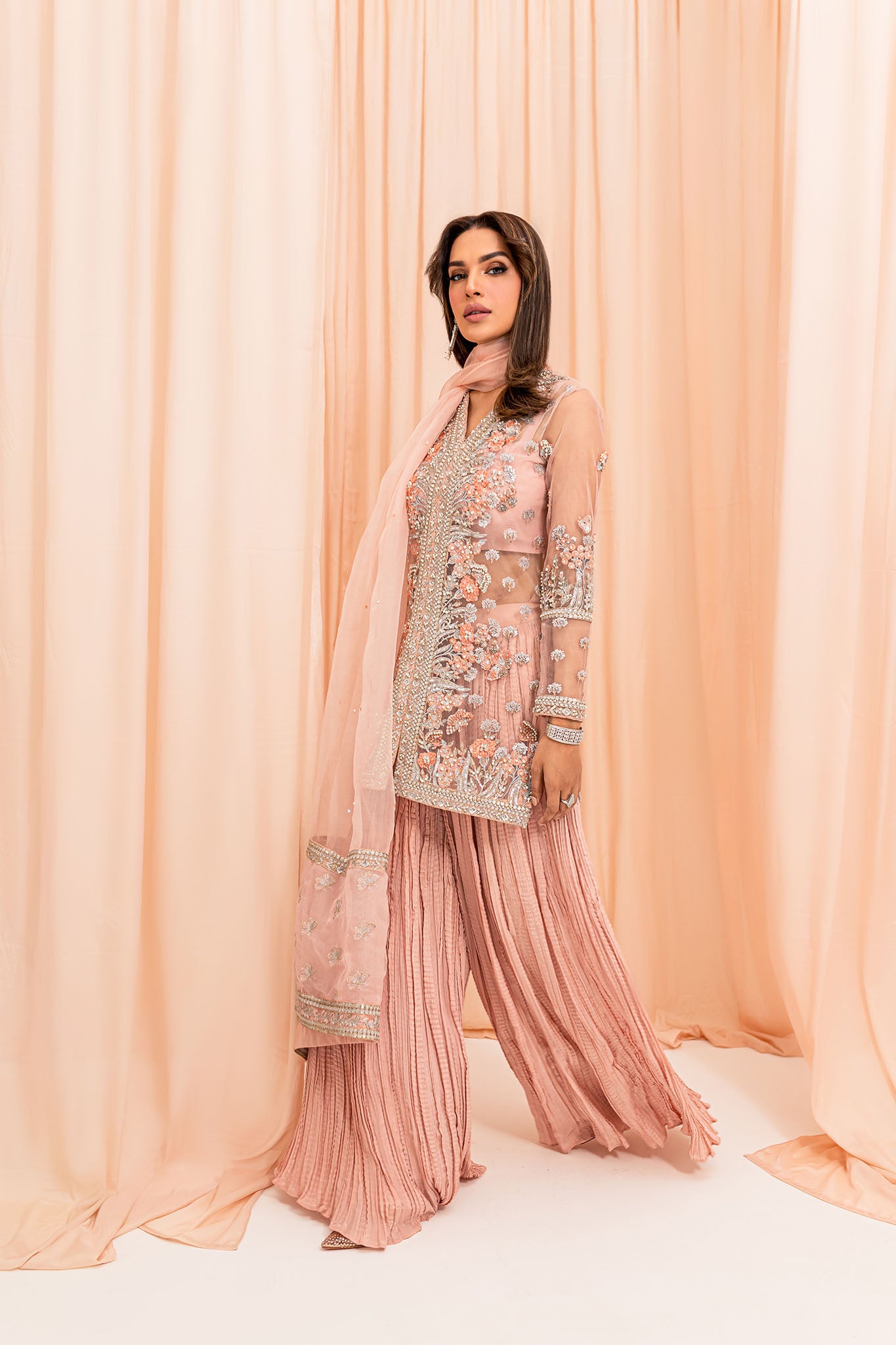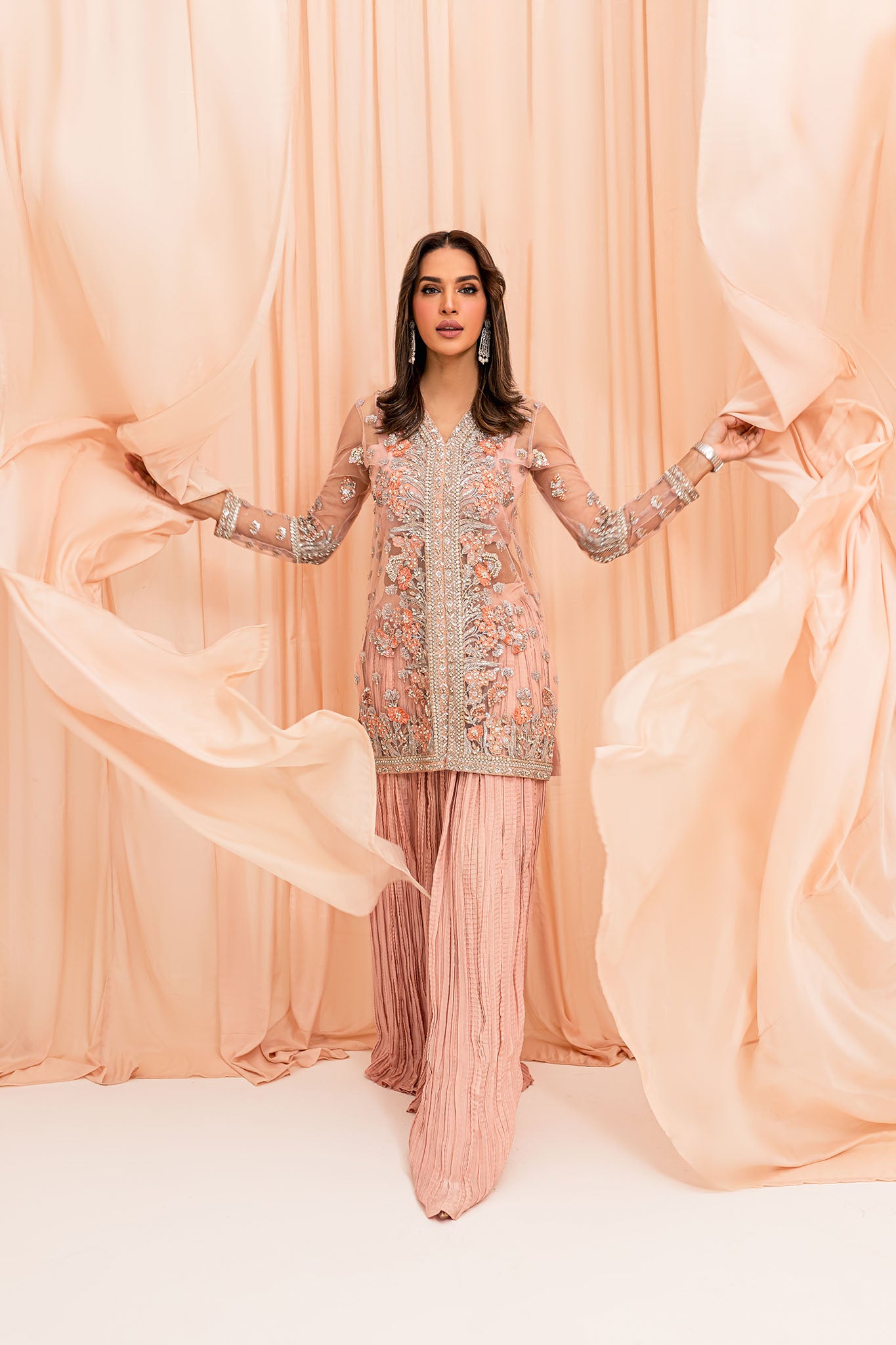Description: Enthralling rose peach jacket crafted on luxuriant net along with crushed sharara.