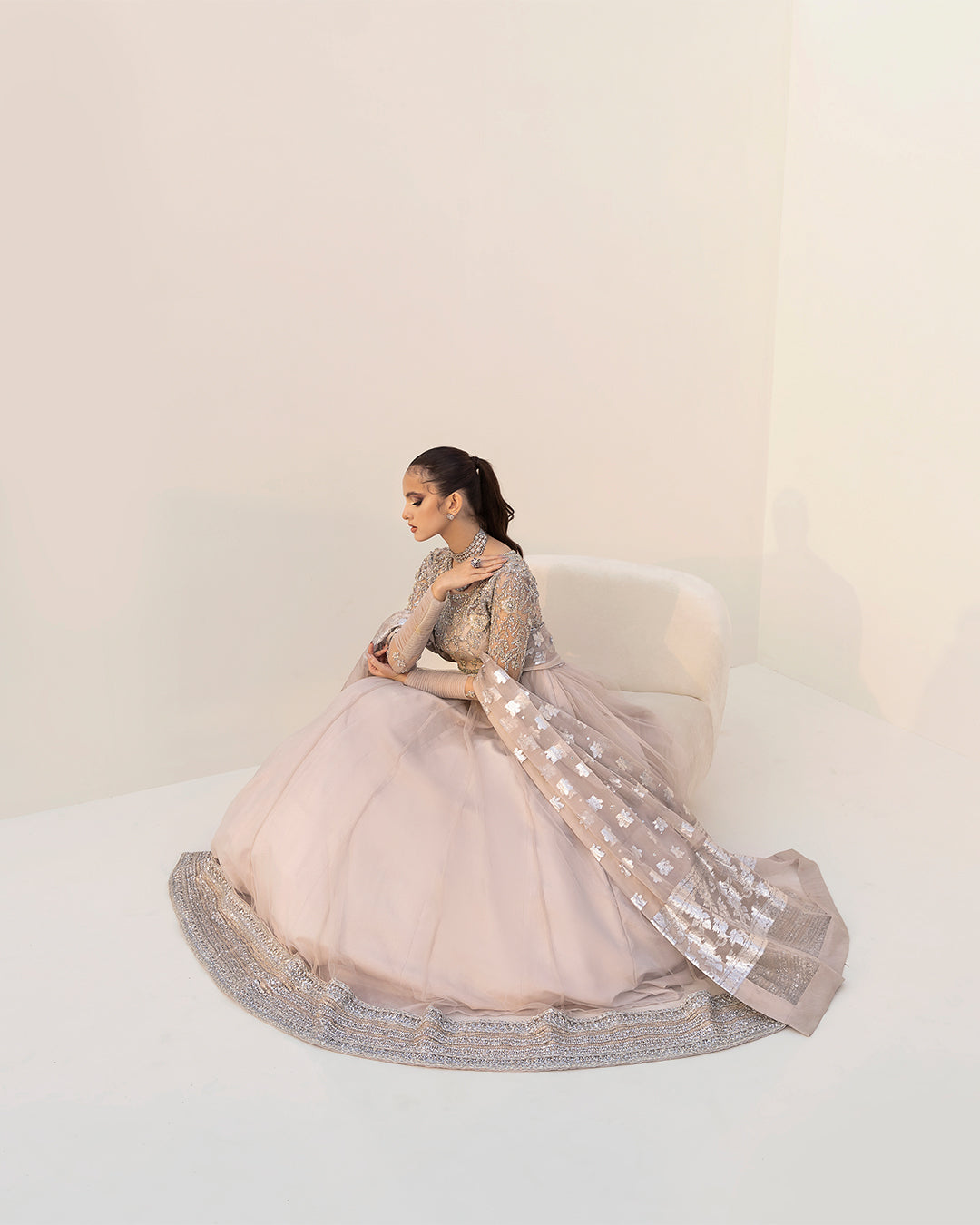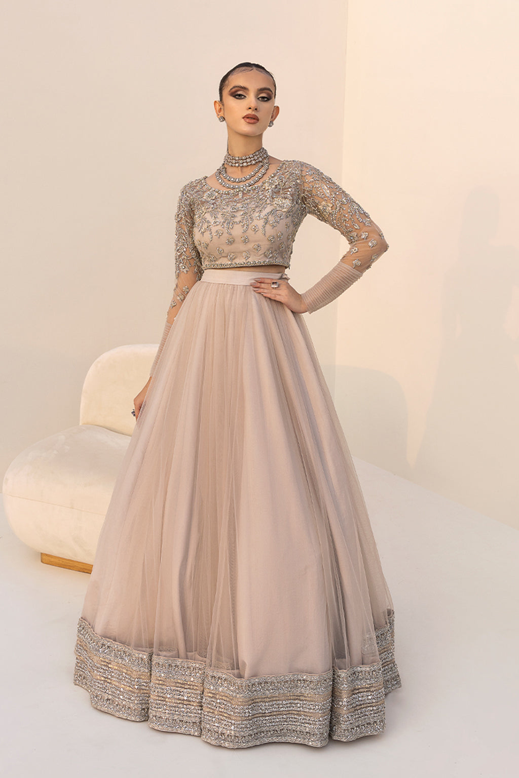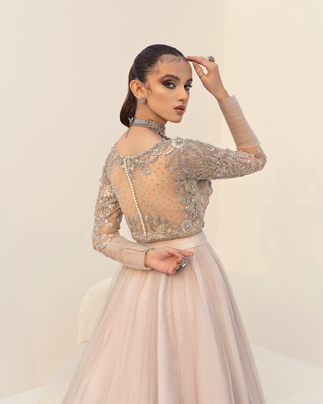 This stand-out earthy tones lehnga choli is embedded with quintessential embroideries. The exquisite choli is adorned with 3D silver hand embellishments on a beautiful net canvas. It comes with a flared net lehnga finished with heavy border. The ethereal chanderi dupatta gives it a marvellous look for a traditional attire.