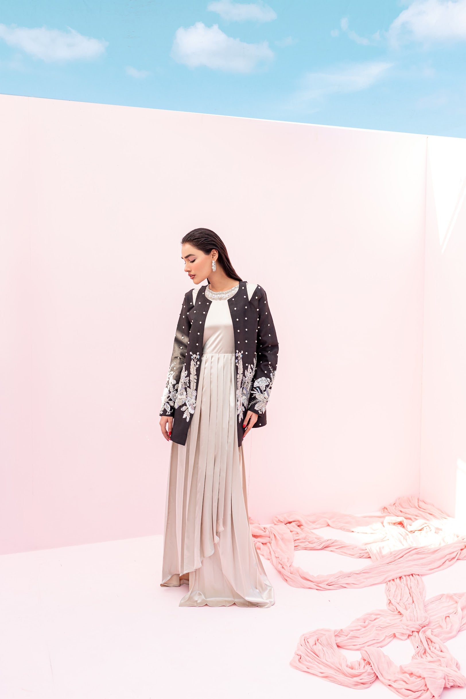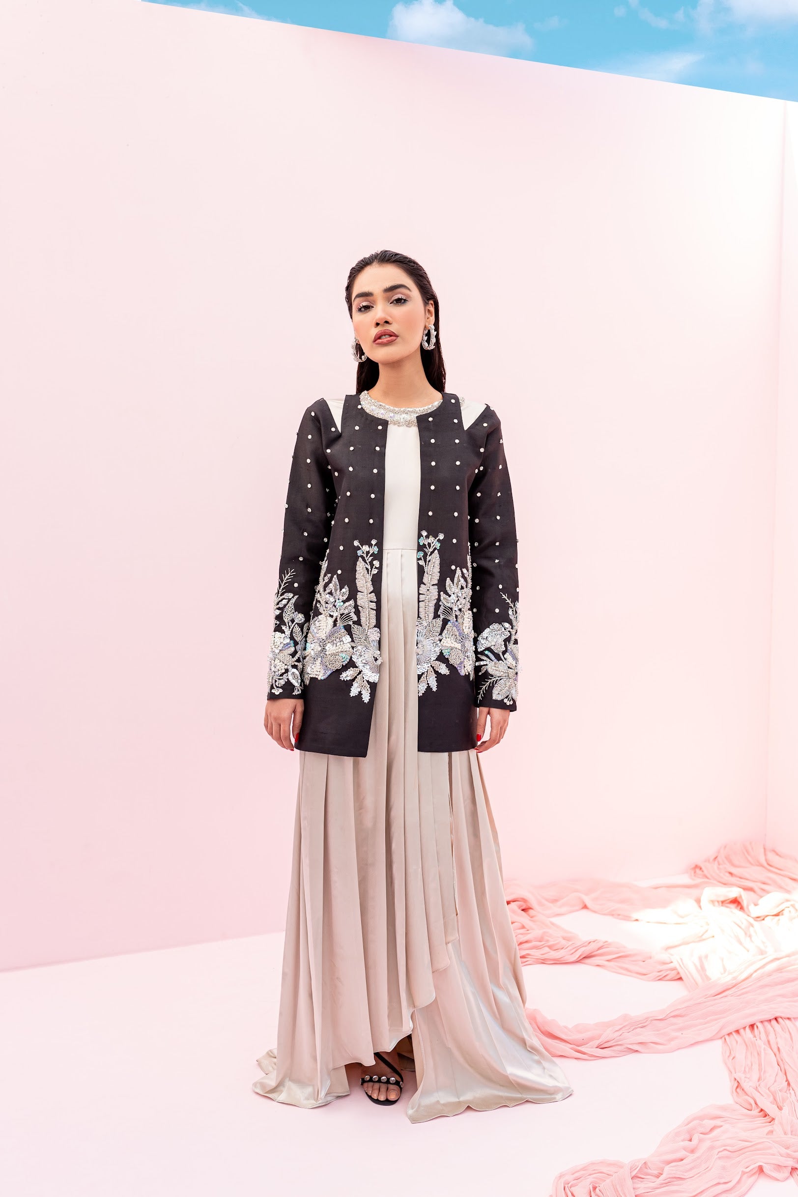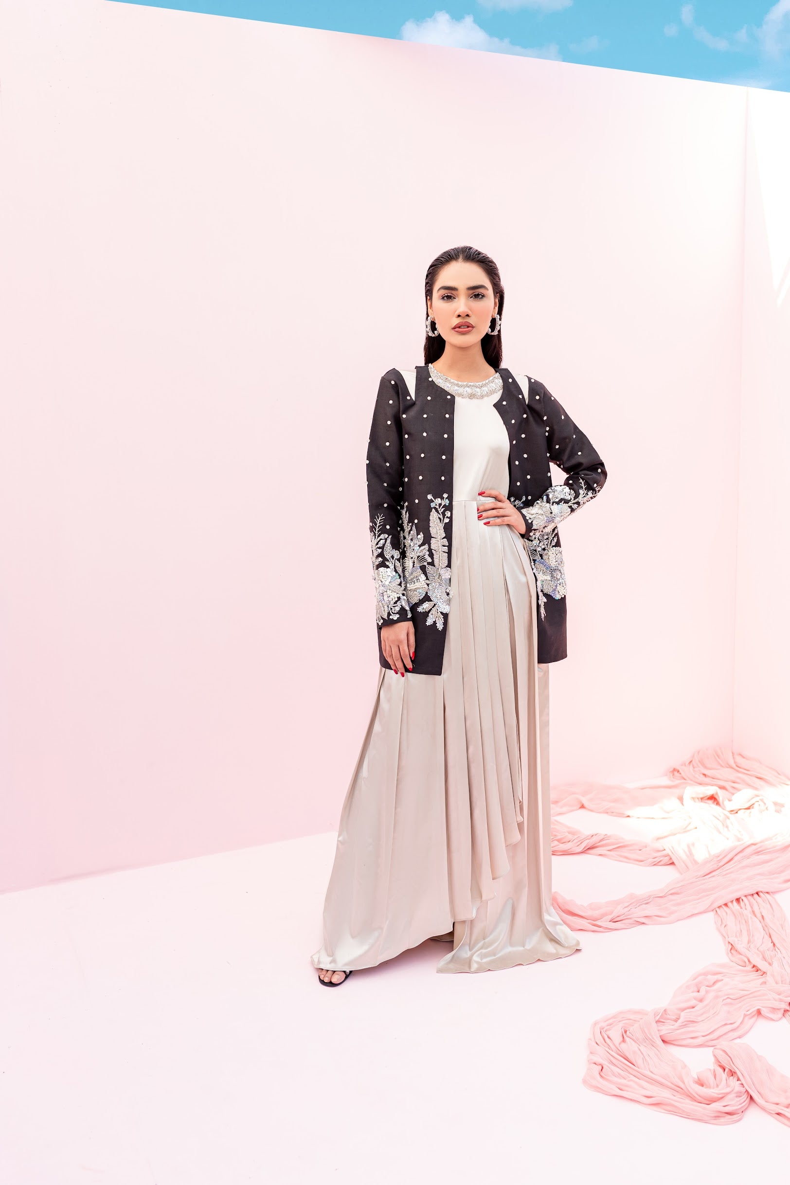 Description: JACKET IS MADE IN PURE RAW SILK AND LONG GOWN WITH GATHERS IS MADE IN RAW SILK, COMPOSED INTRICATED MOTIF IS TOTALLY HAND EMBELLISHED.
