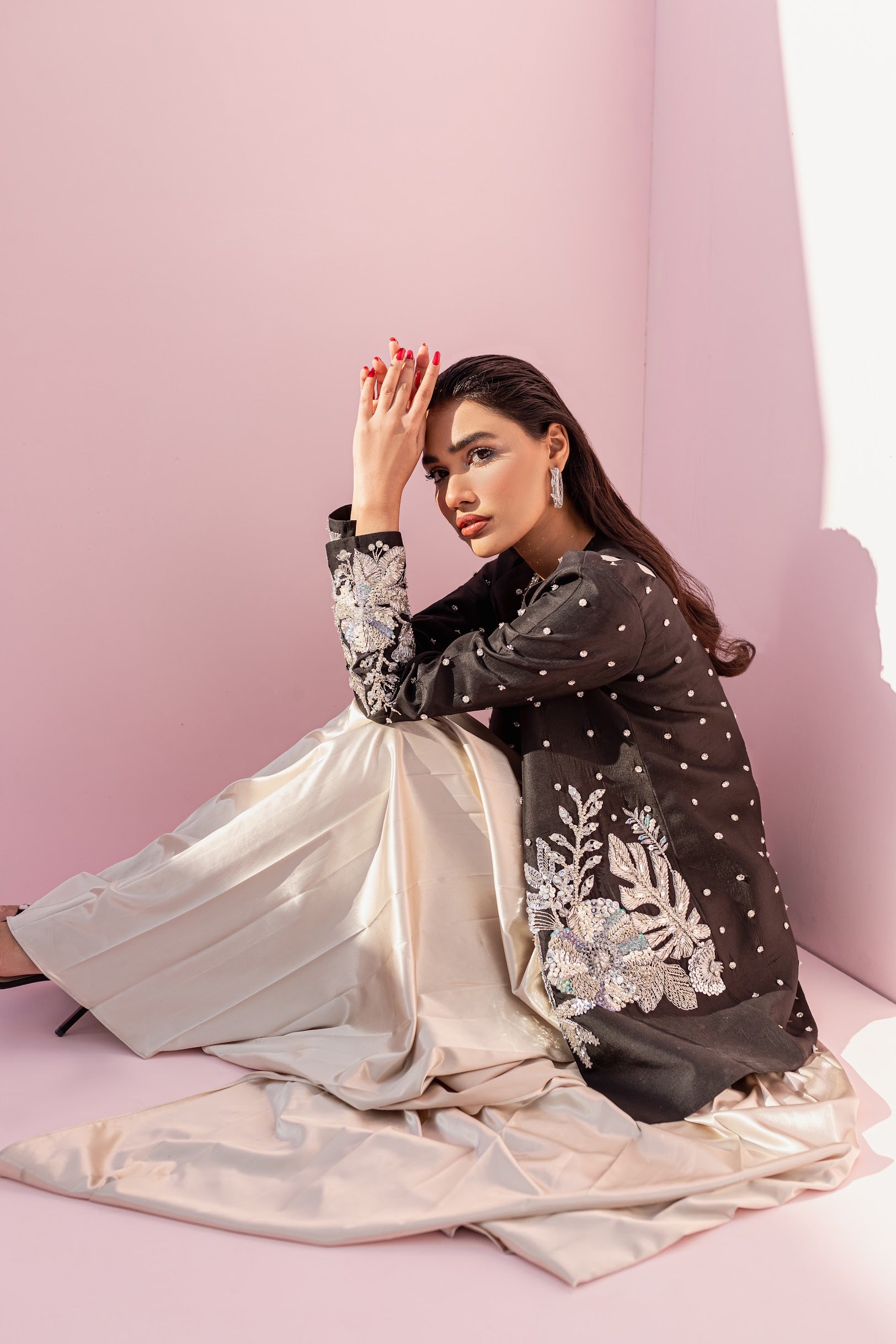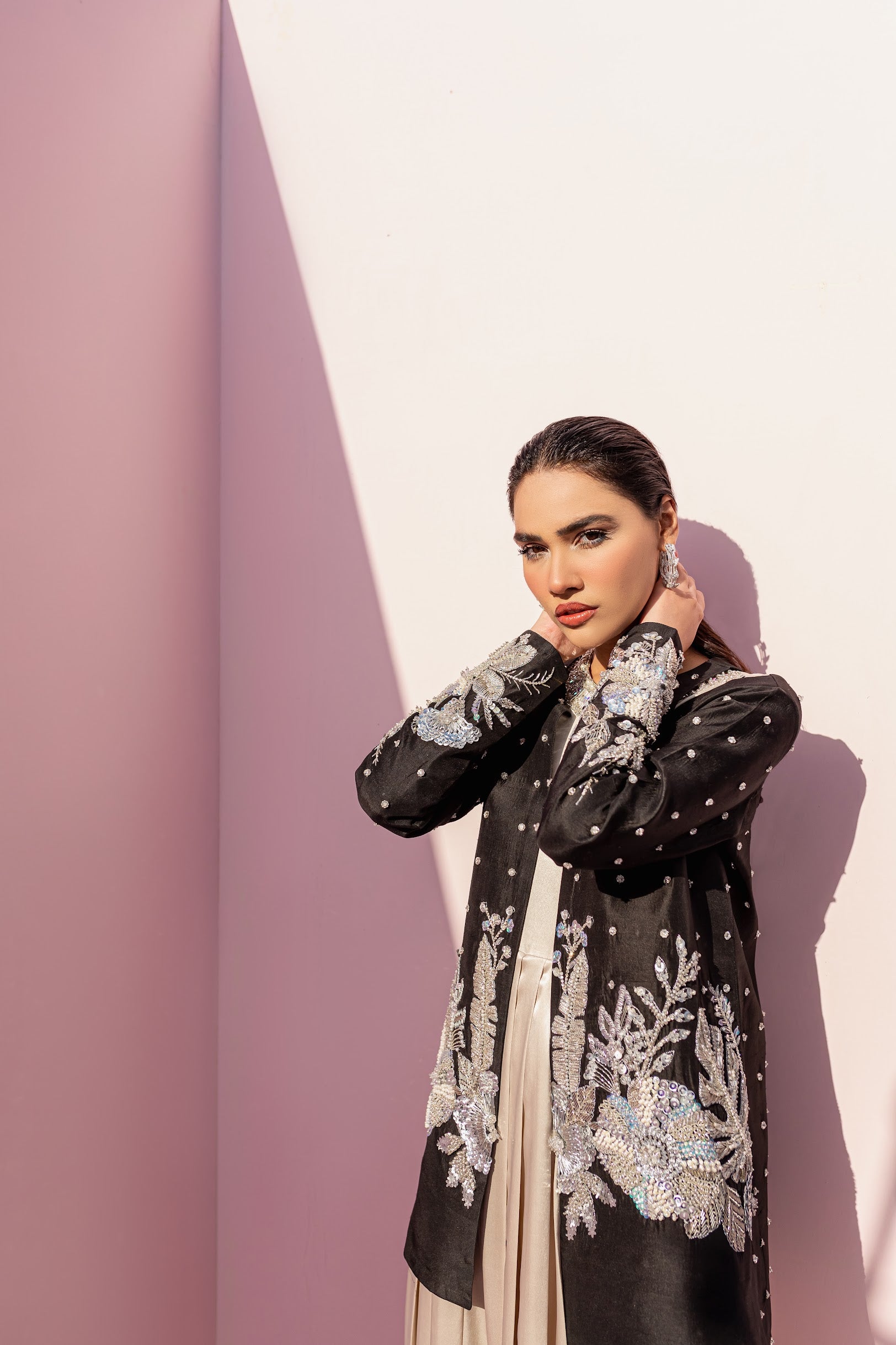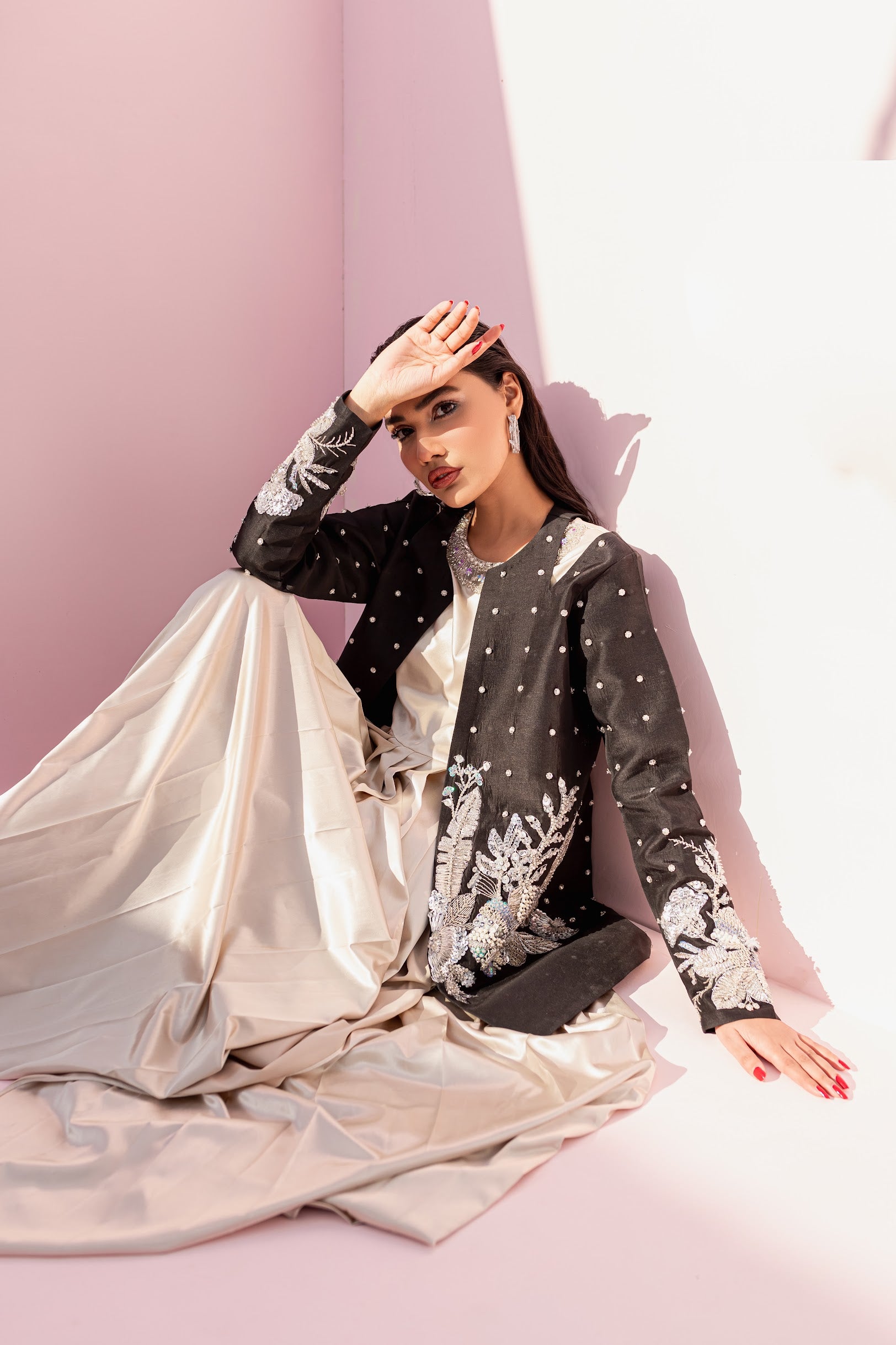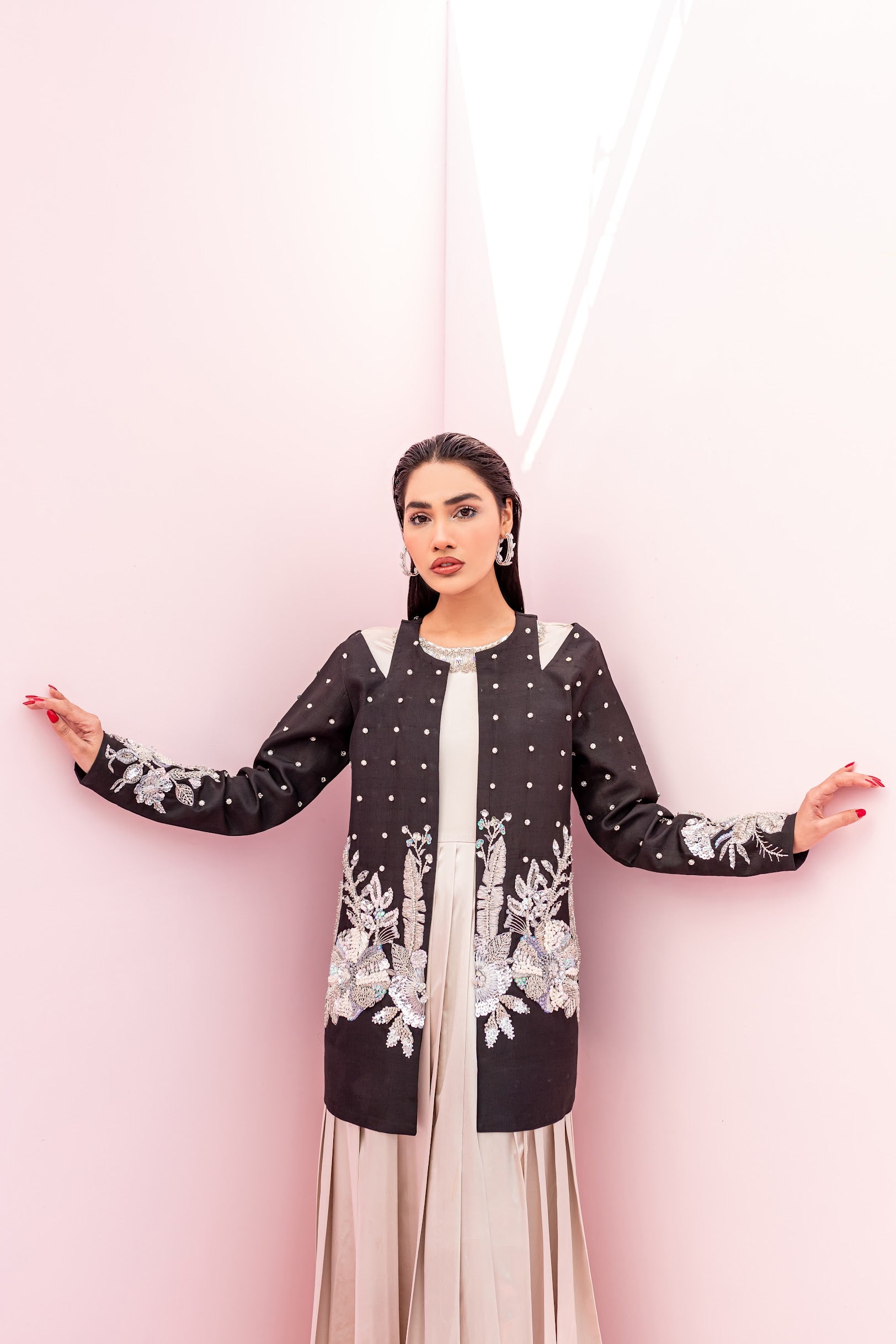 Description: JACKET IS MADE IN PURE RAW SILK AND LONG GOWN WITH GATHERS IS MADE IN RAW SILK, COMPOSED INTRICATED MOTIF IS TOTALLY HAND EMBELLISHED.