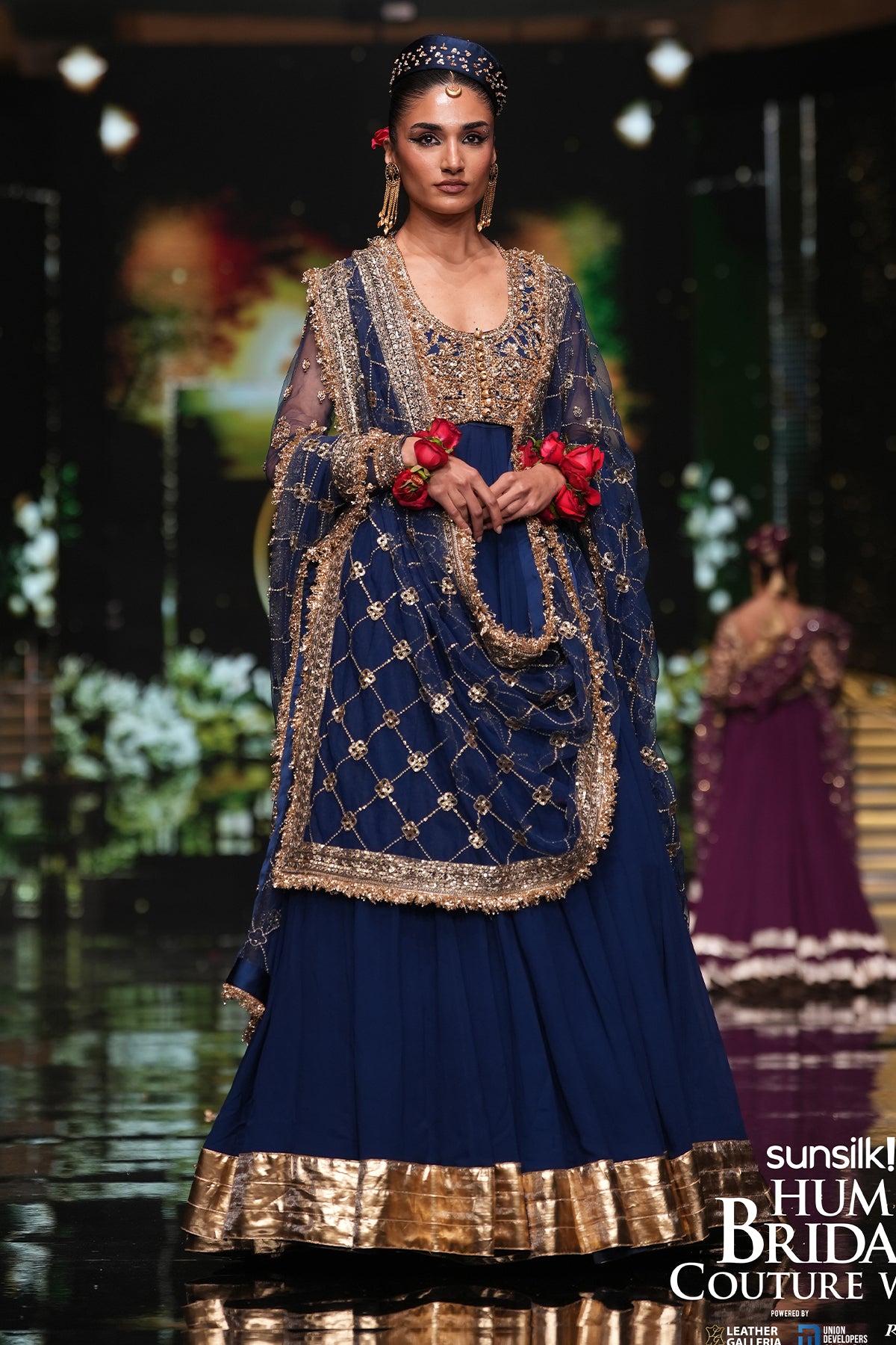 Featuring a gorgeous dark blue chiffon peshwas, adorned with intricate golden handwork on the bodice and sleeves, exquisitely finished with delicate lappa on the borders. The ensemble is paired with a sheer net dupatta showcasing a mesmerizing jaal pattern, and a classic churidar bottom, radiating timeless elegance and regal charm.