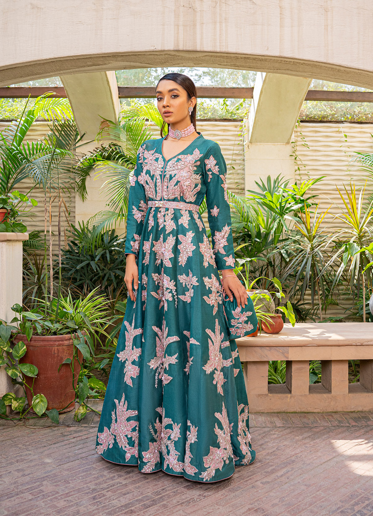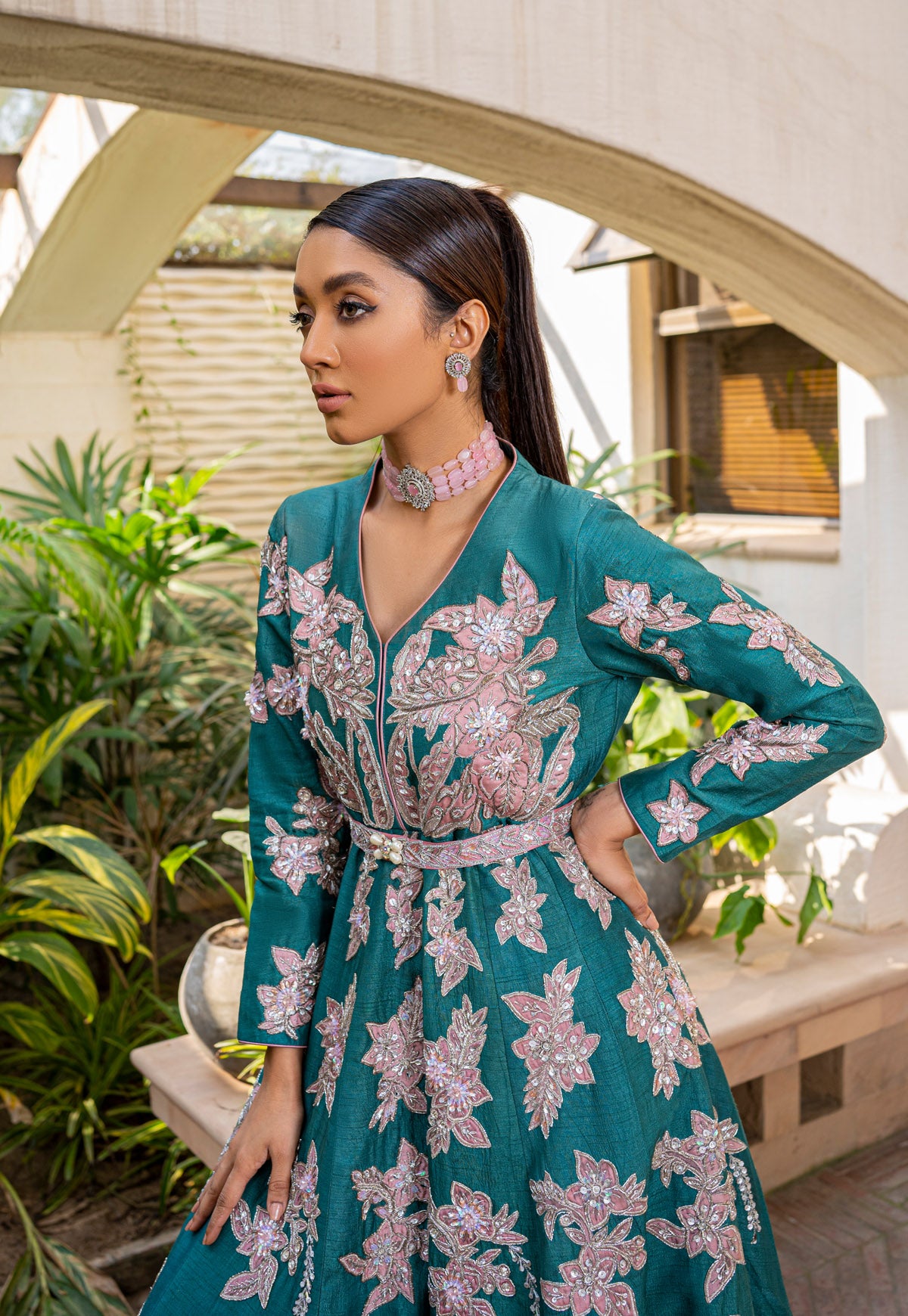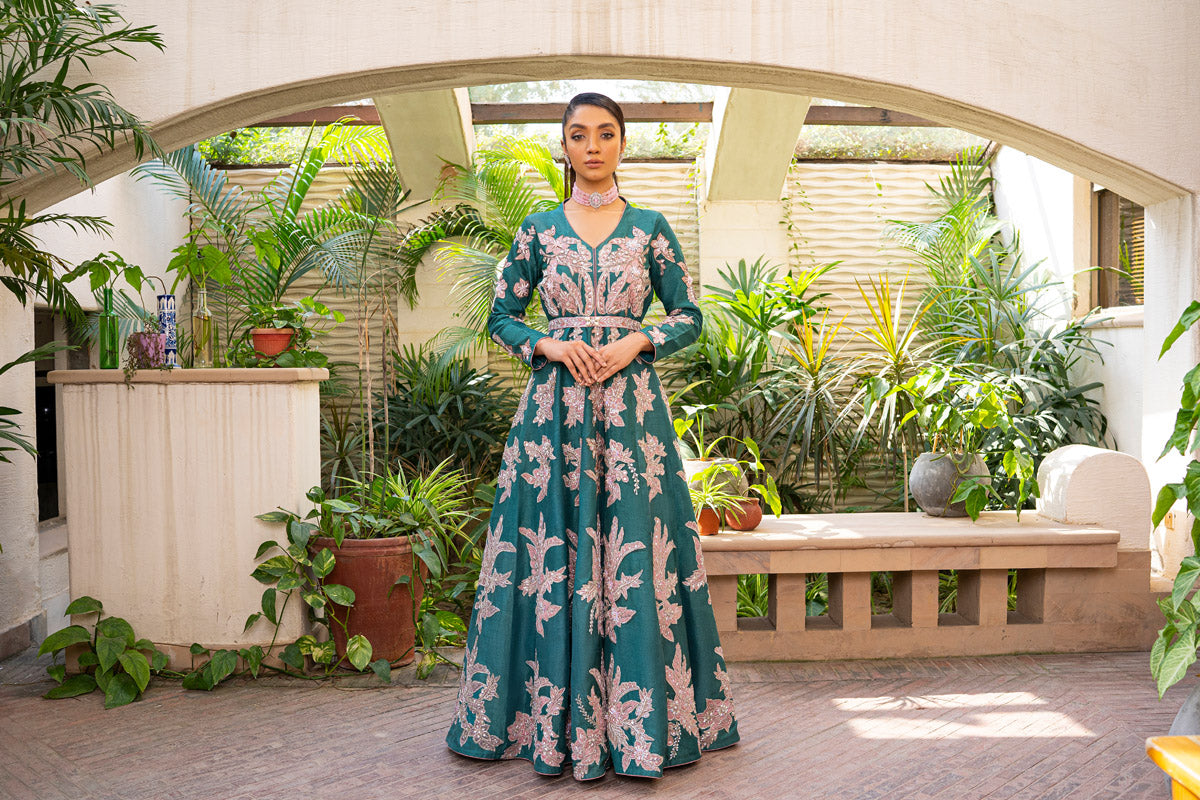 Description: Adorned with vast silver lining motifs enclosed within a striking dark green canvas highlighted without signature cut work and intricate designs. MADE IN RAW SILK, MOTIFS ARE HAND APPLIQUED WITH HAND EMBELLISHMENTS, BELT IS HAND EMBELLISHED.