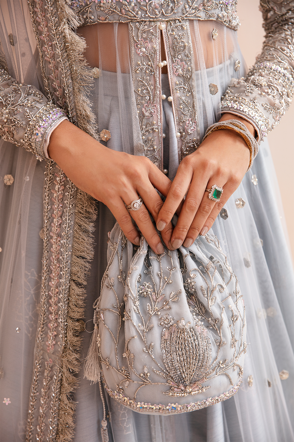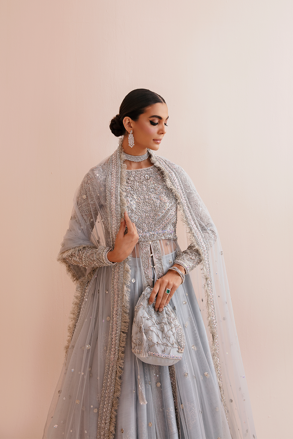 This resplendent front open ice blue net pishwas features a heavily embroidered bodice with intricate details, complemented by its opulent borders adorned with dazzling embellishments of silver dabka, naqshi, and sequins, creating a breathtaking masterpiece. It comes with a block-printed lehenga, which adds a touch of traditional elegance to the outfit. The four-sided heavily embroidered net dupatta with spray all over enhances the allure and makes a lasting impression on everyone around you.
