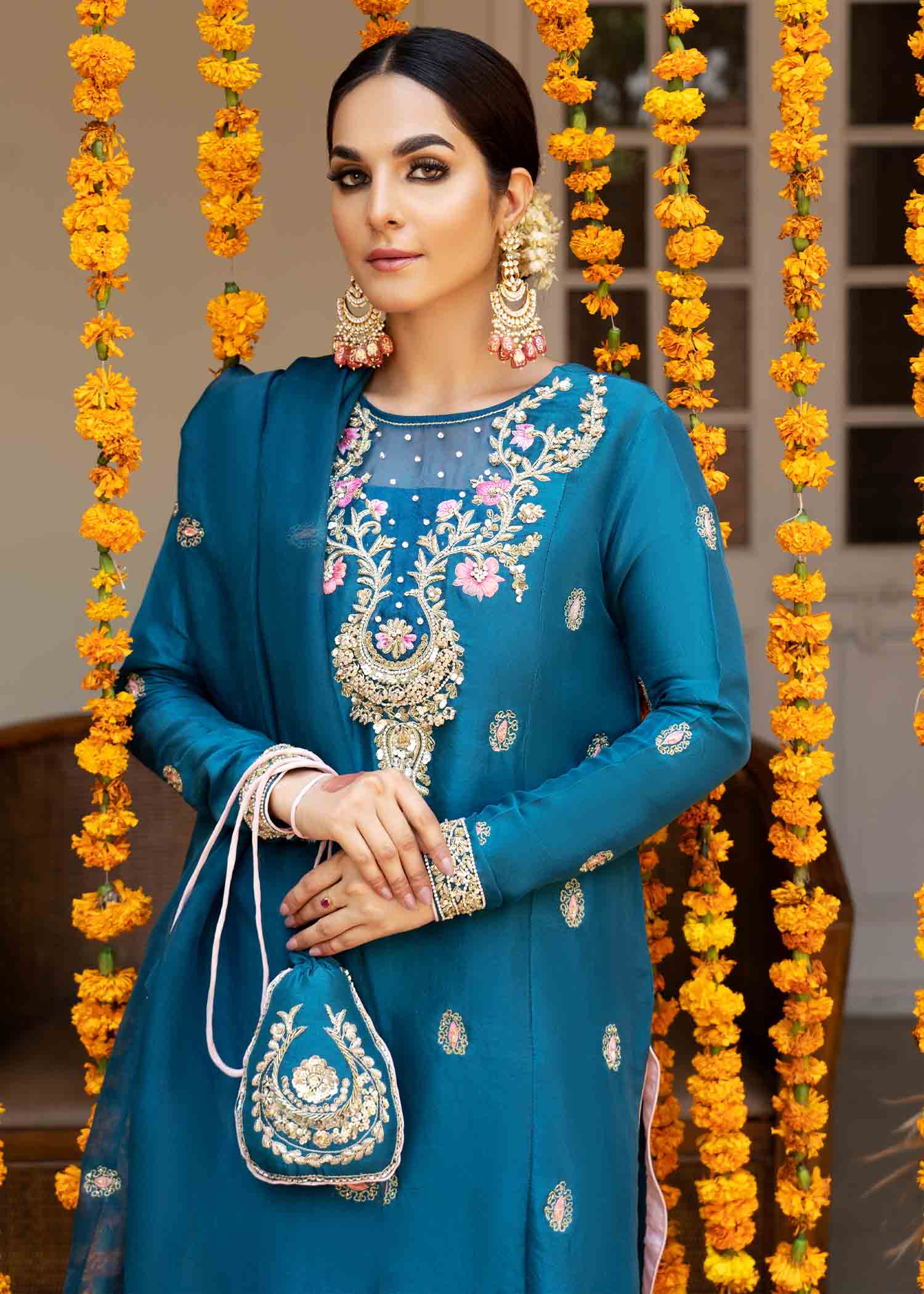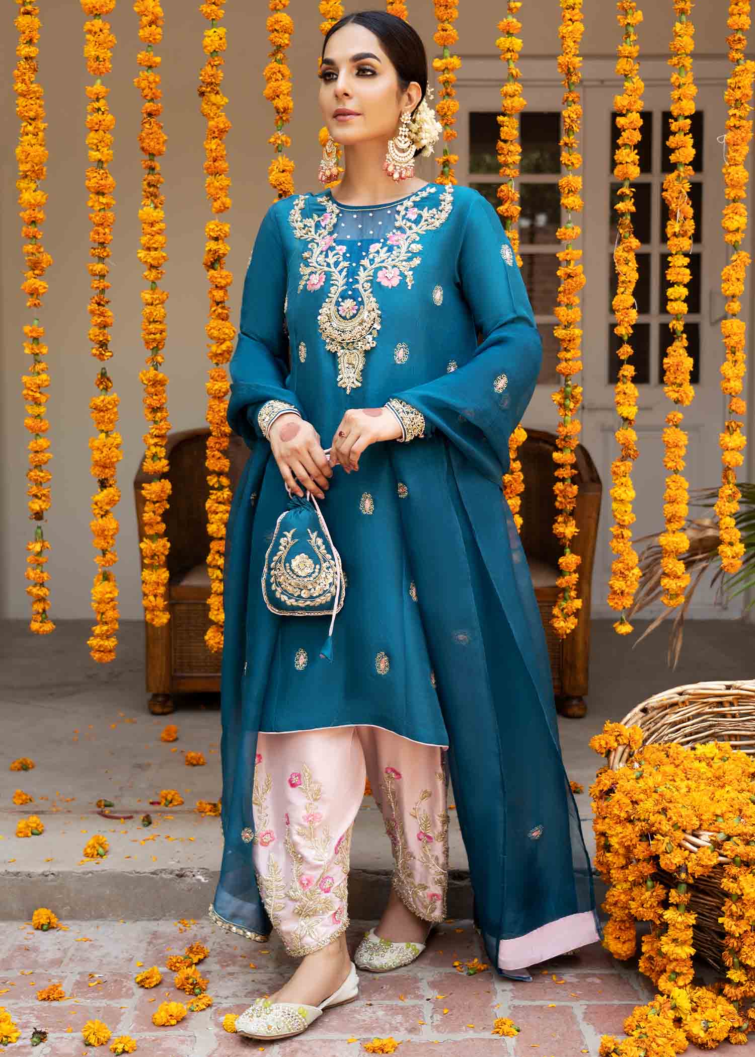 Description: Celebrating the essence of our cultural festivities in an alluring composition of teal and powder pink that symbolizes the beauty of mystic flowers depicting the glittering magic unraveled on our canvas. MADE IN PURE 80 GMS RAW SILK. HAND EMBELLISHED.