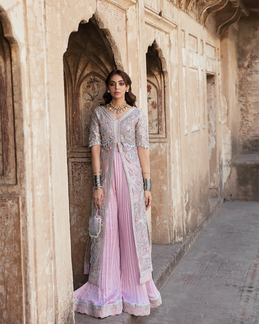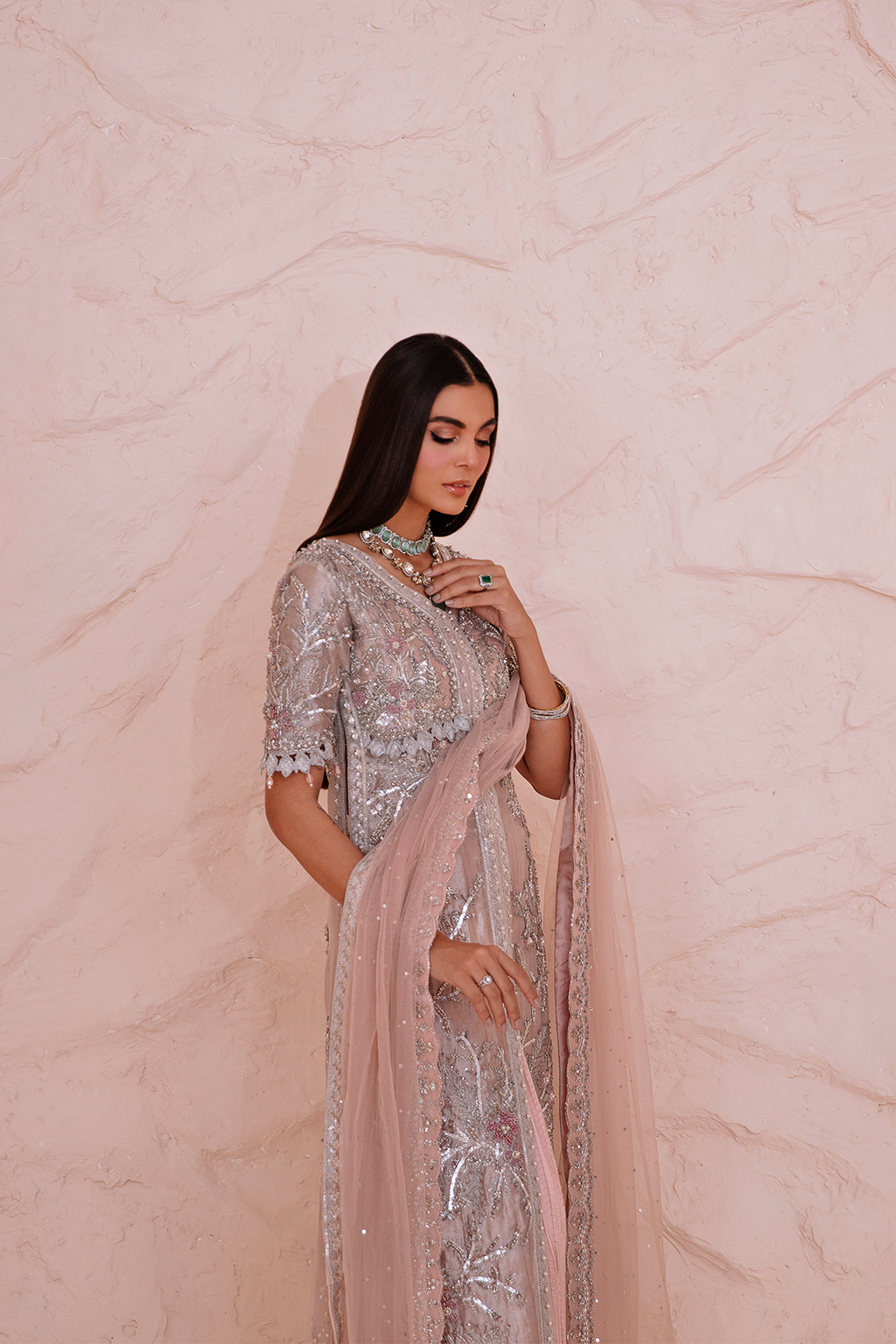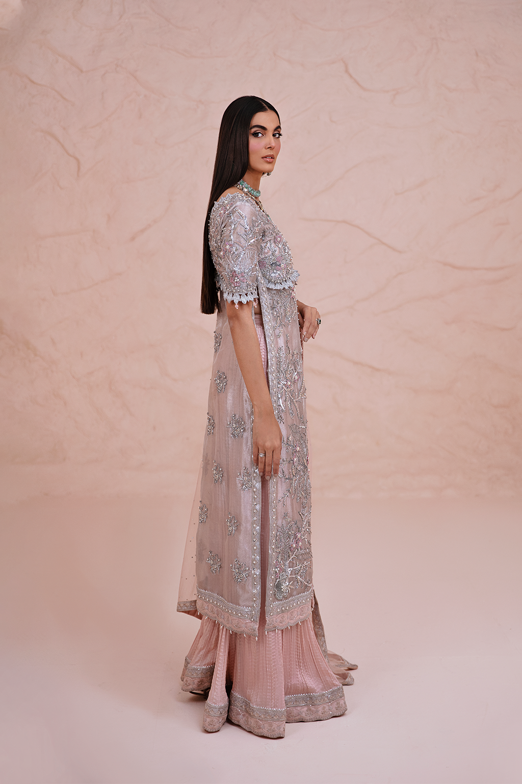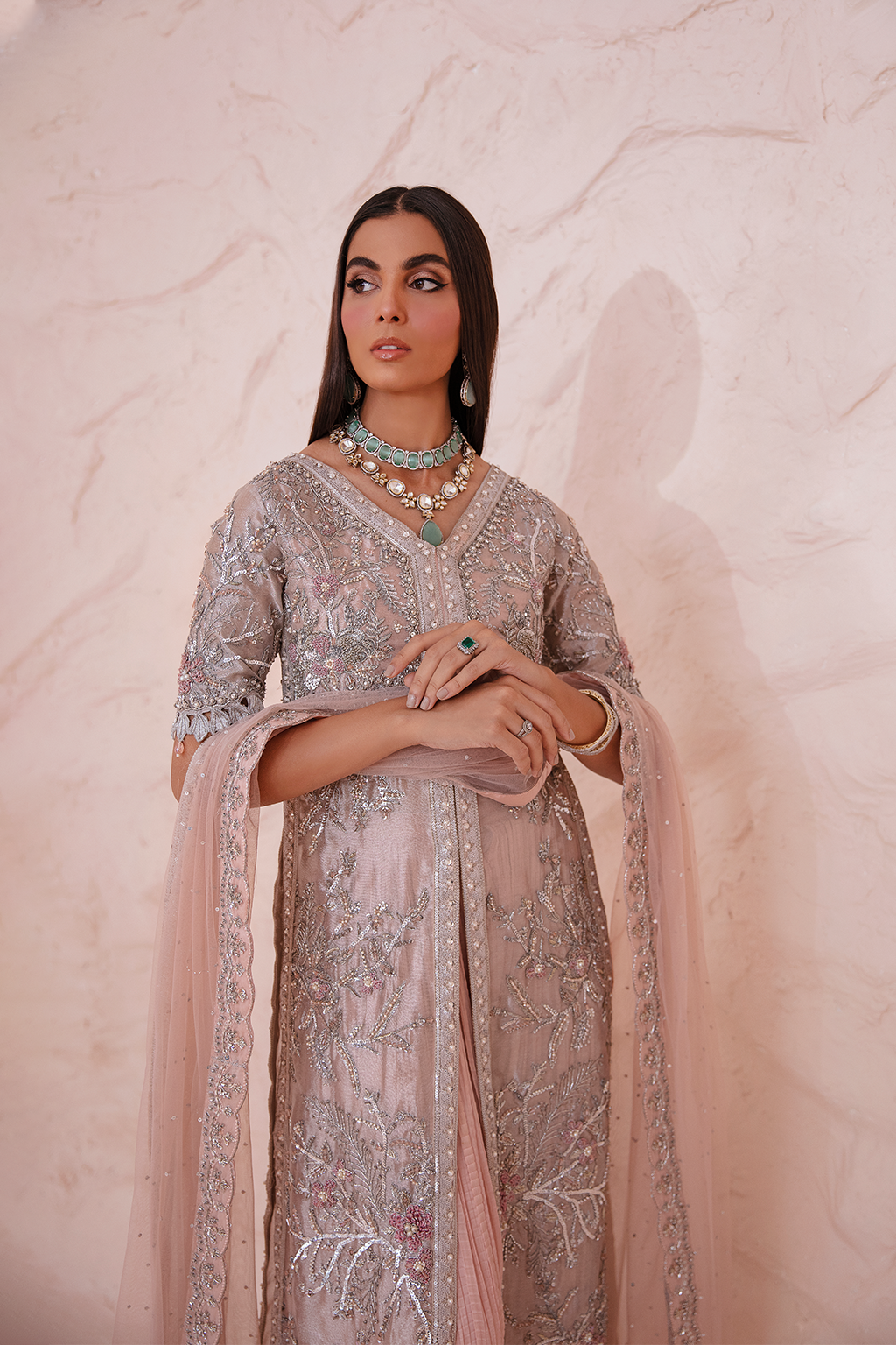 A sumptuous tea pink front open organza jacket, lavishly adorned with silver kora, dabka, naqshi, and crystals, adding a mesmerising depth and dimension to the jacket. Paired with crushed silk pants featuring a scalloped embroidered hemline, and net dupatta, with a four-sided border and delicate spray all over, completes the look with an ethereal grace. This ensemble truly embody the essence of timeless grace and sophistication.