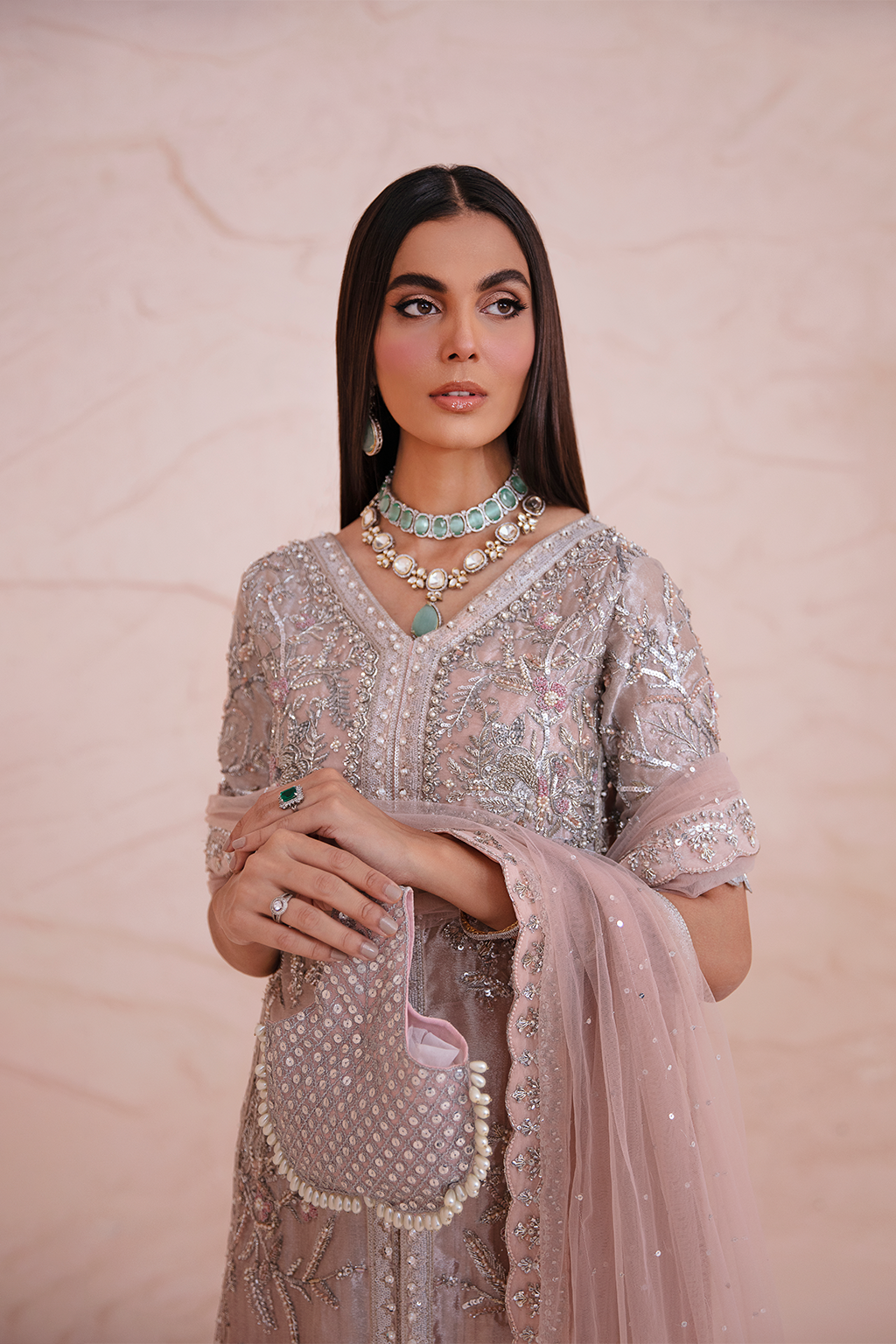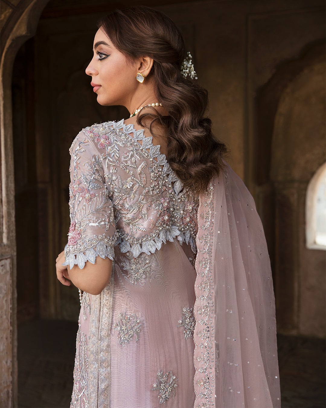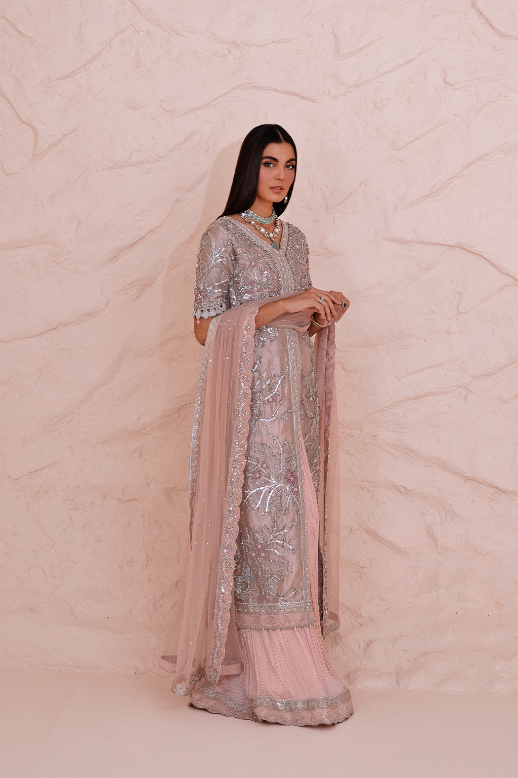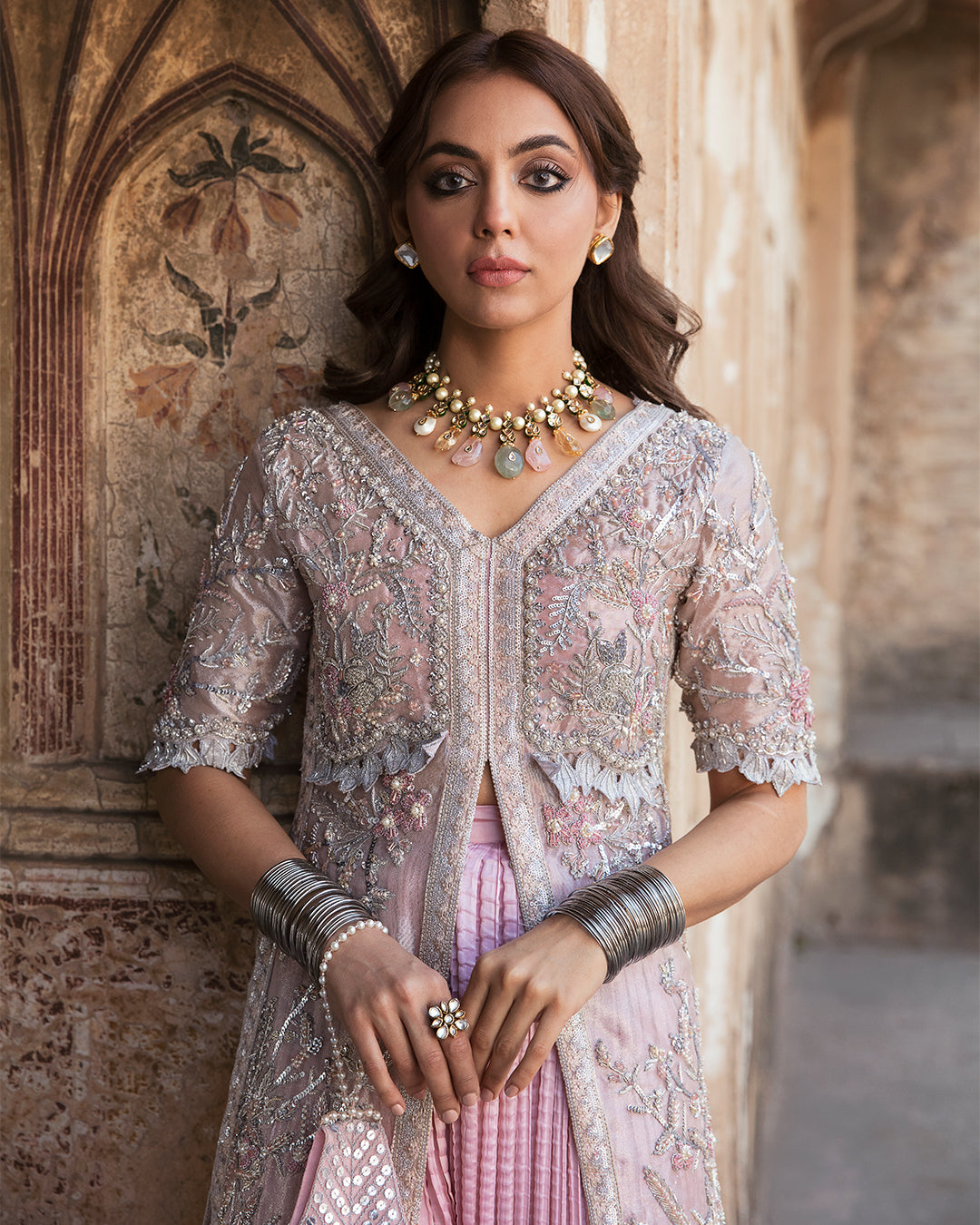 A sumptuous tea pink front open organza jacket, lavishly adorned with silver kora, dabka, naqshi, and crystals, adding a mesmerising depth and dimension to the jacket. Paired with crushed silk pants featuring a scalloped embroidered hemline, and net dupatta, with a four-sided border and delicate spray all over, completes the look with an ethereal grace. This ensemble truly embody the essence of timeless grace and sophistication.