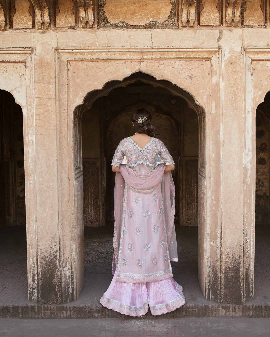 Fabric: Jacket in Tissue - Crushed Sharara in Satin - Organza Dupatta - Grip Silk Inner