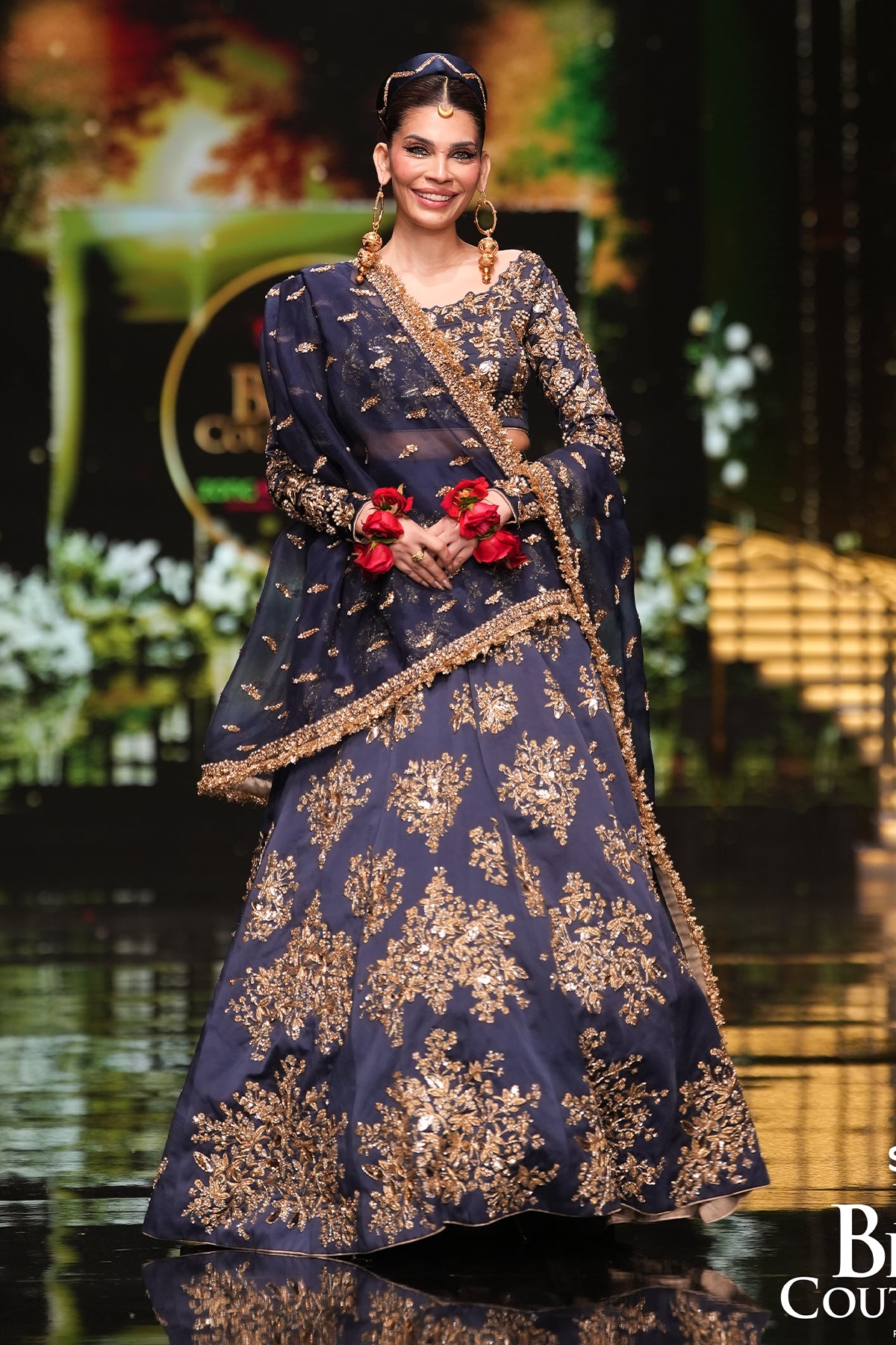 This regal bridal ensemble is rendered in a beautiful shade of navy blue, composed of a richly adorned satin silk blouse and lehenga, both lavishly worked on the front and back with delicate hand embellishments. The craftsmanship features a luxurious mix of naqshi, dabka, pearls, and shimmering diamantes, coming together to create a masterpiece of opulence and finesse. Paired with an ethereal organza dupatta, framed with a heavily embellished four-sided border, adorned with a delicate spray and finished with a traditional kiran lace, the look exudes timeless grandeur. Completing the ensemble, a gracefully adorned pouch featuring handworked motifs adds the final touch of regal charm.
