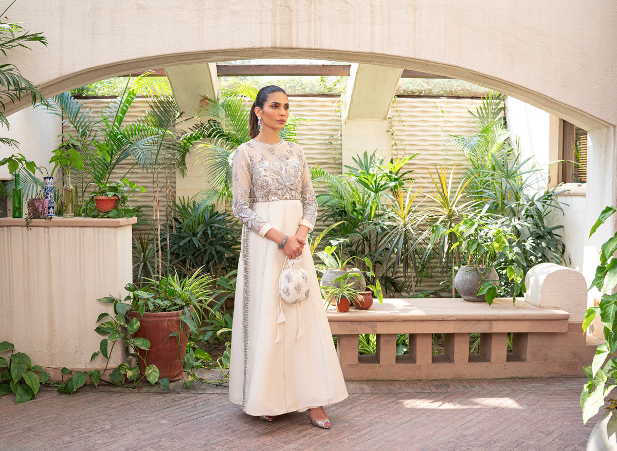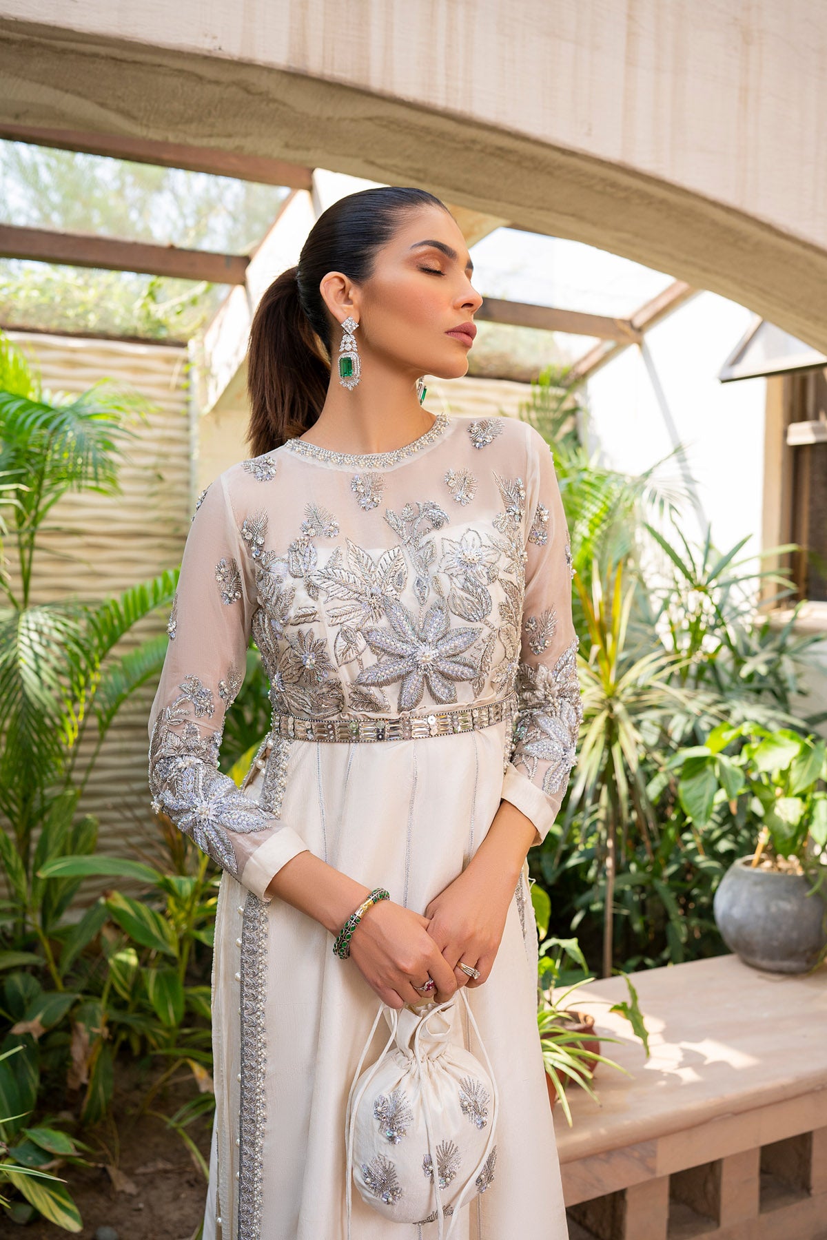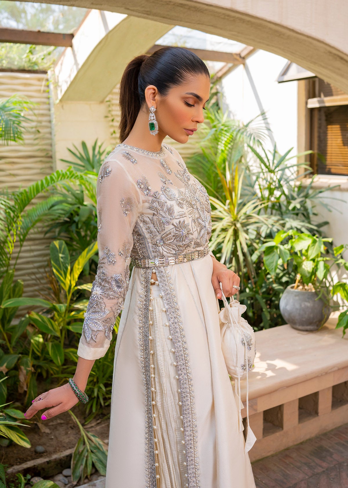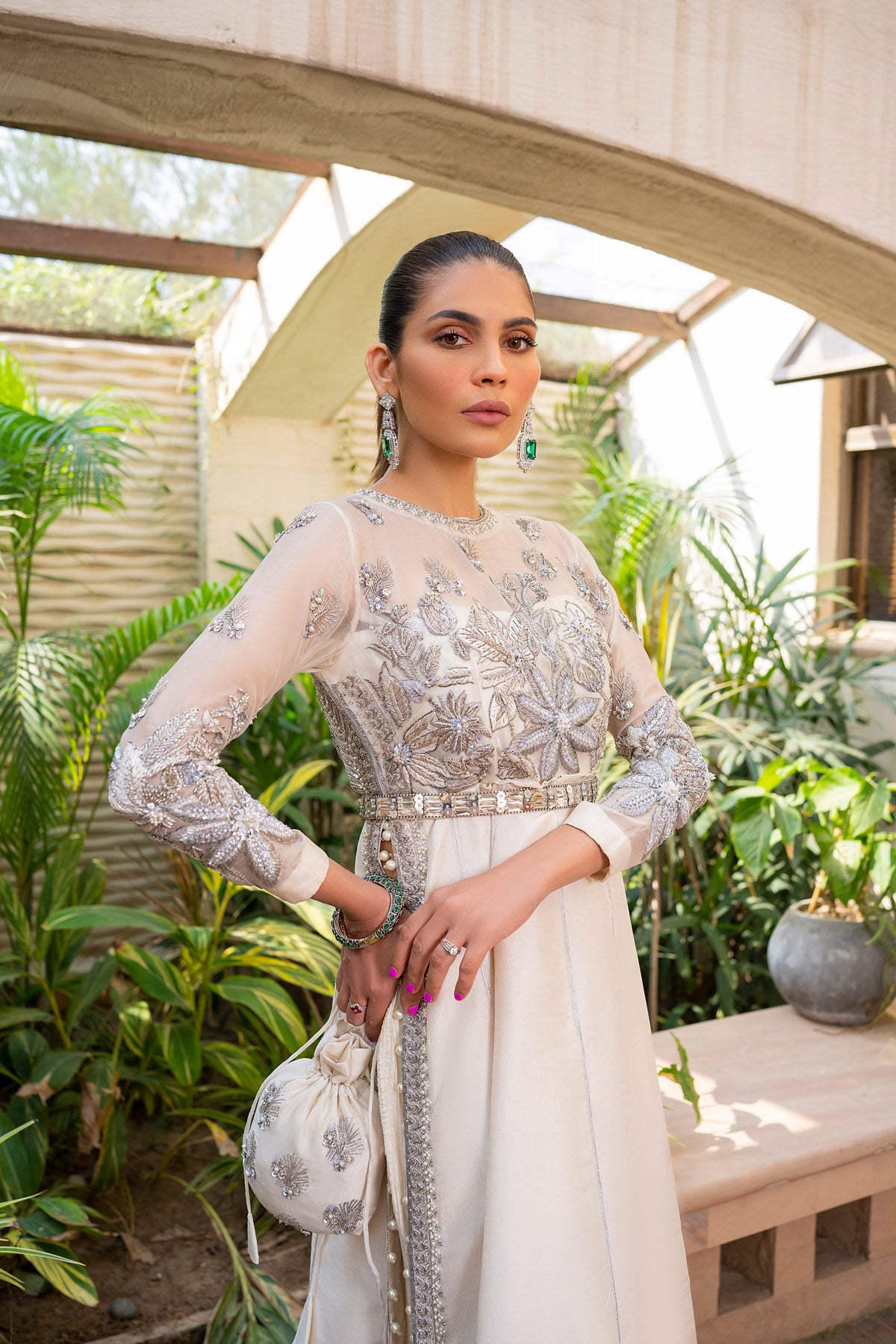 Description: The alluring canvas of white breeze basking in the glory of geometric cuts and intricate detailing.