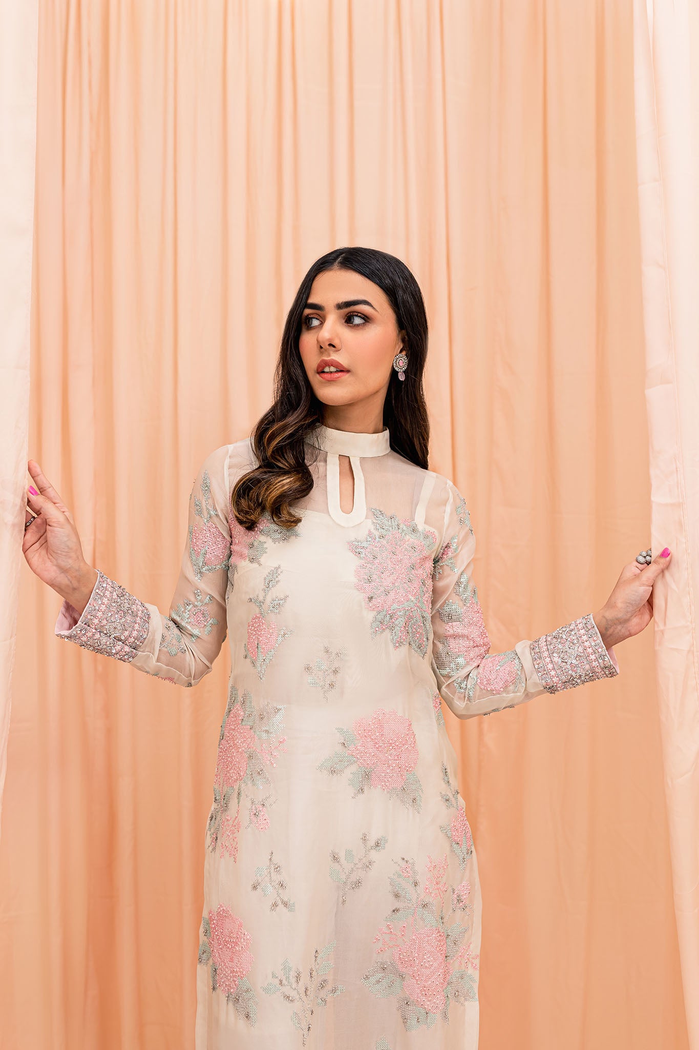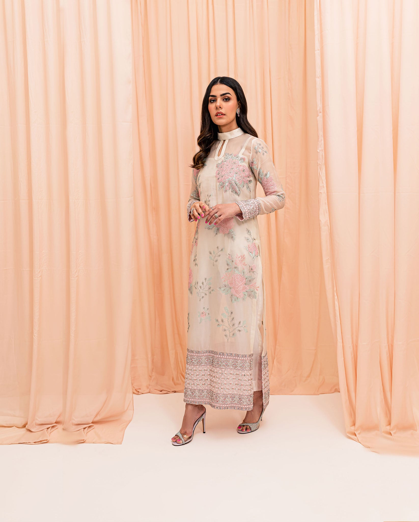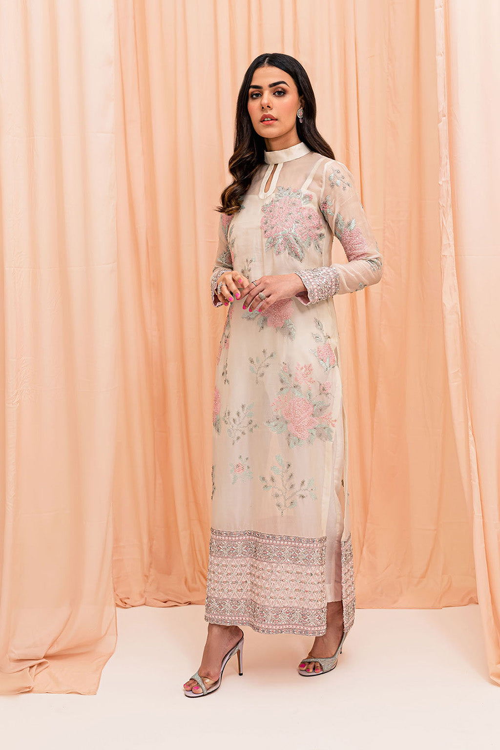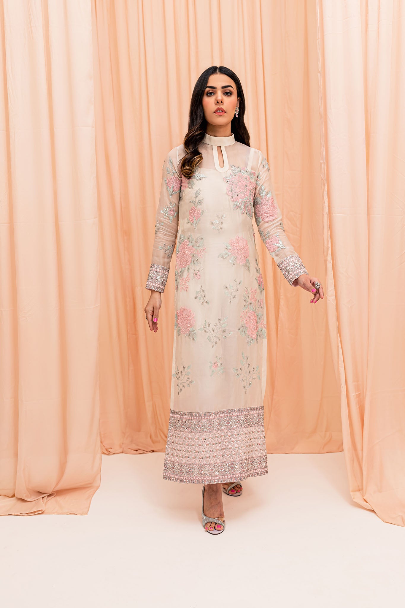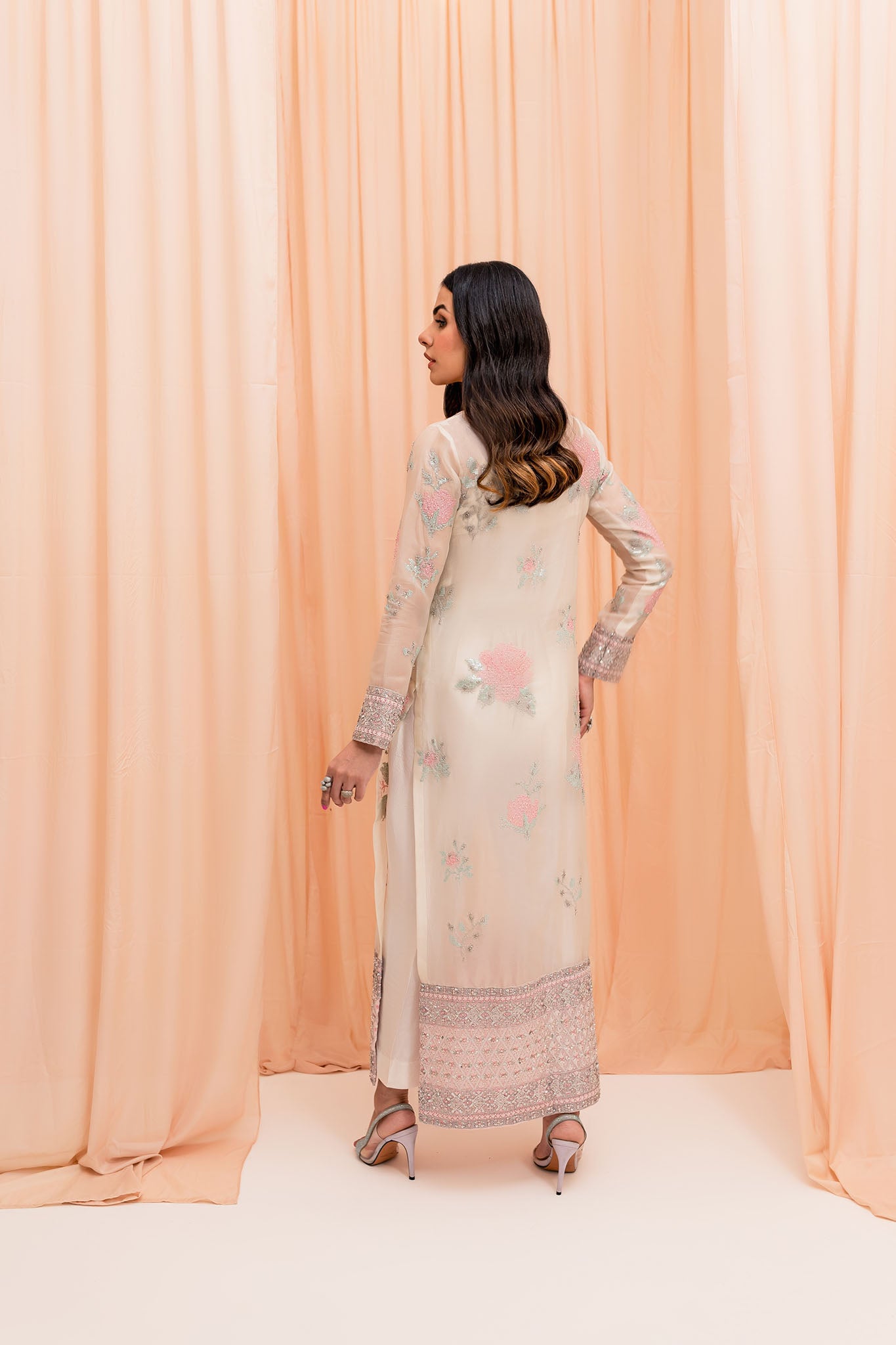 White pure organza long shirt made with sequins and embroided texture. Border of shirt is heavily embellished with silver decorations. Grip straight pants paired with this outfit It has a beautiful flowy organza dupatta with embellished pally on both sides.