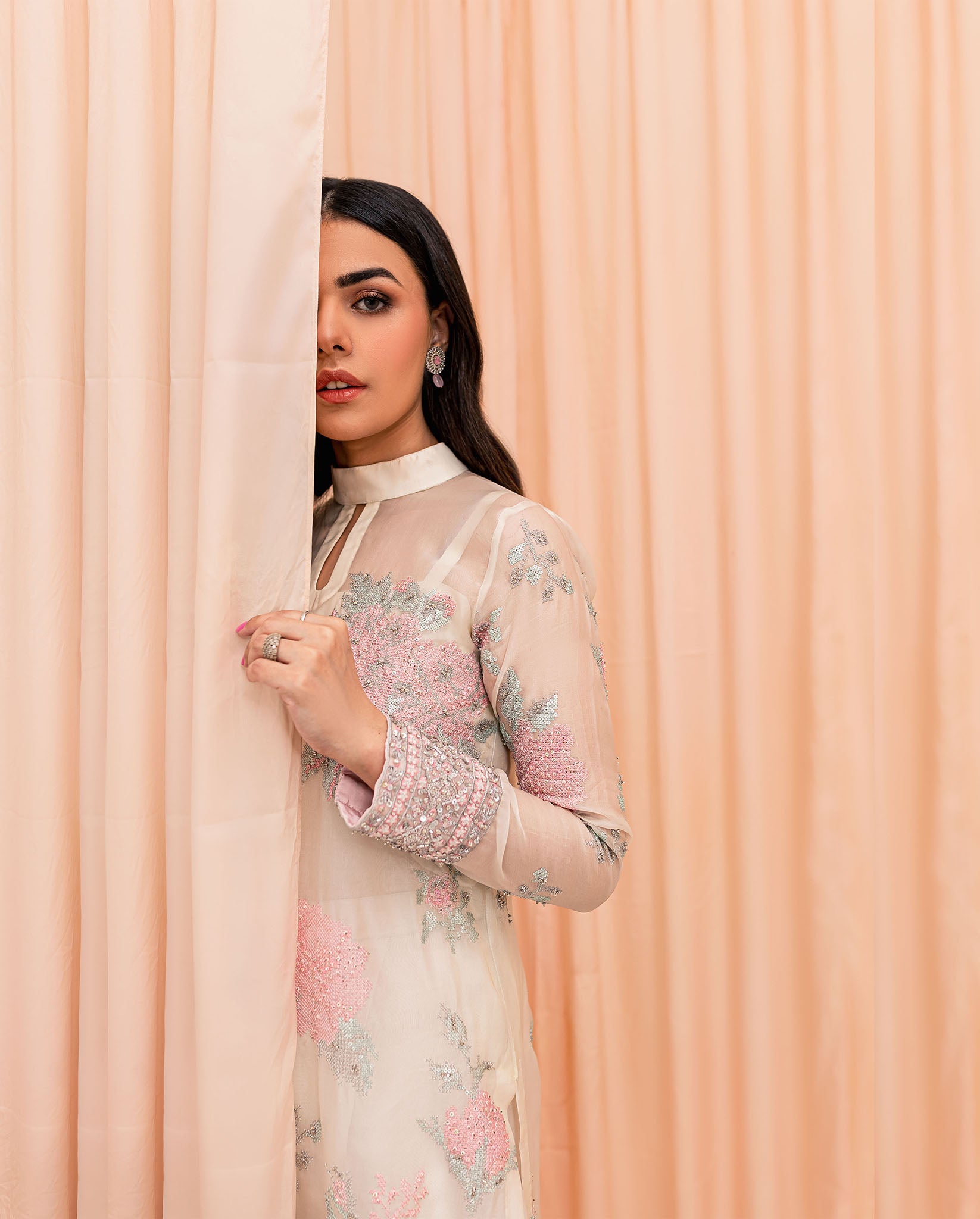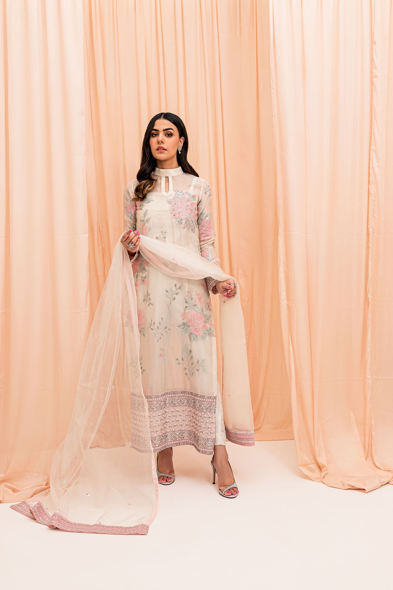 Dupatta is of Pure Organza with embellished Pallu and facing four sided border