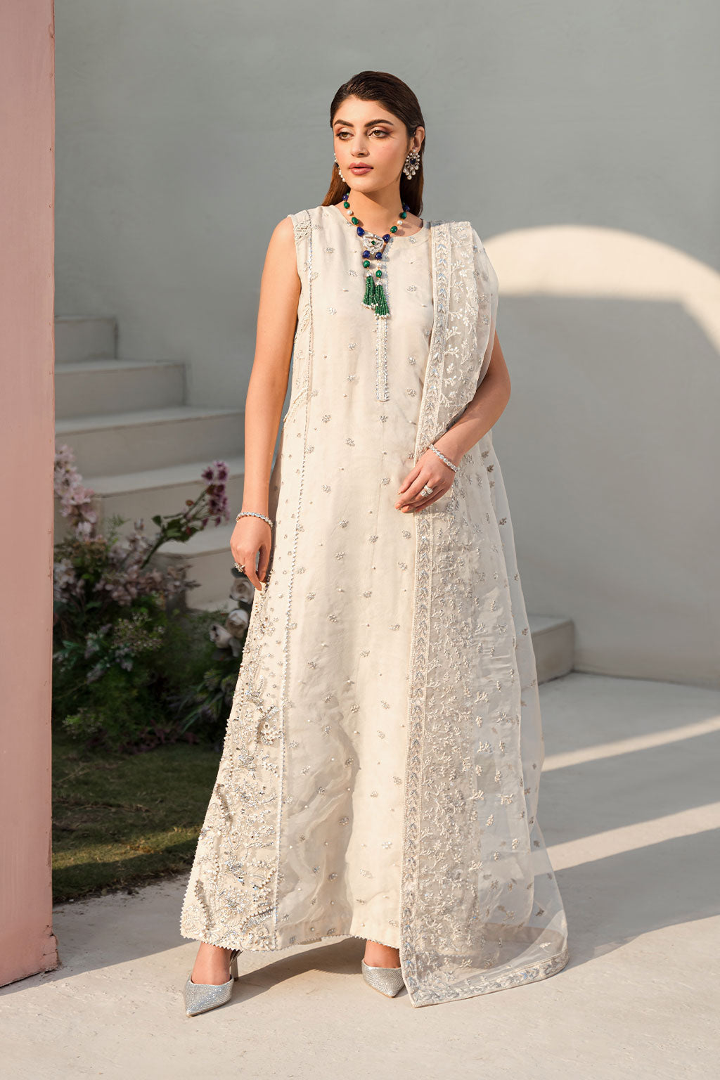 Description: This jaw-dropping ash-white ensemble beckons you into a realm of sheer elegance. The sleeveless shirt, crafted from organza fabric boasts intricate details and hand embellishments, accentuated by delicate lace detailing. It is complemented with tissue culotte pants and embroidered organza dupatta, inviting you to embrace the allure of timeless grace.