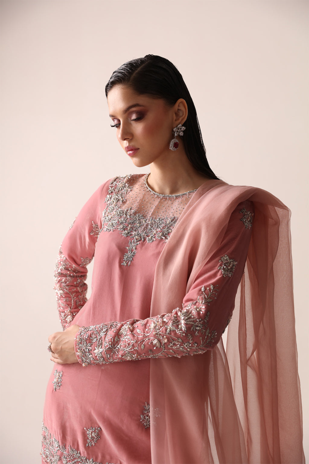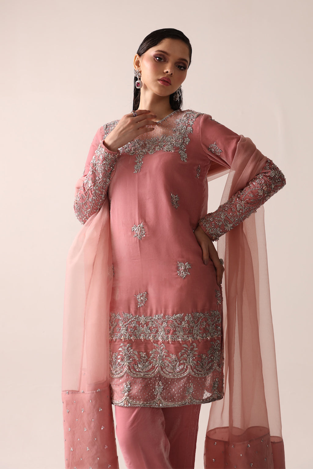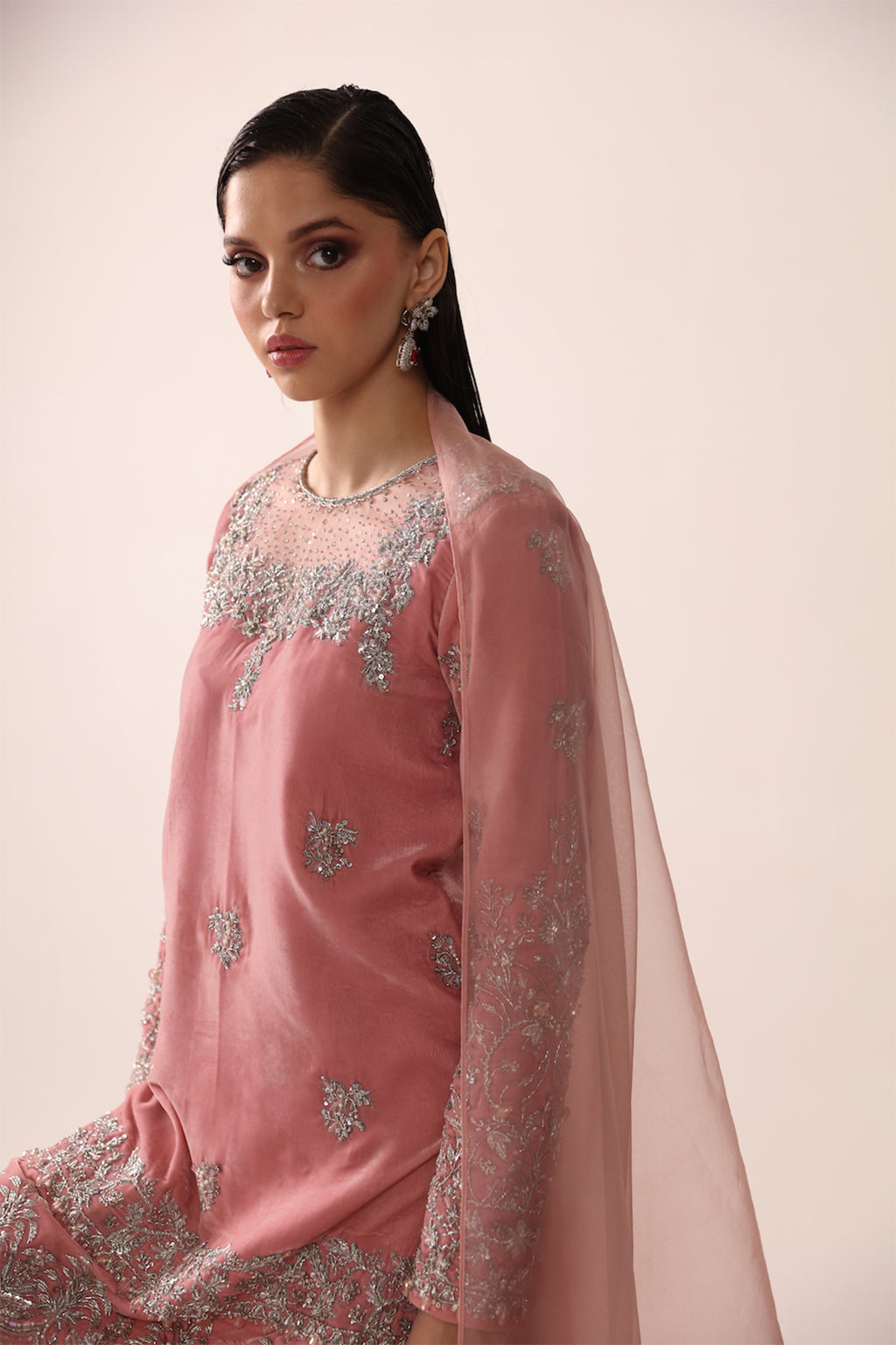 Description: Sparkle in style and make a lasting impression as you drape in ethereal charm of pink velvet outfit. The dazzling knee-length velvet shirt has stylish neckline and is lavishly bejewelled with silver embellishments that exudes timeless beauty and ethereal charm. Accompanied by velvet cigarette pants having silver adda work and organza dupatta featuring raw-silk borders with delicate spray.