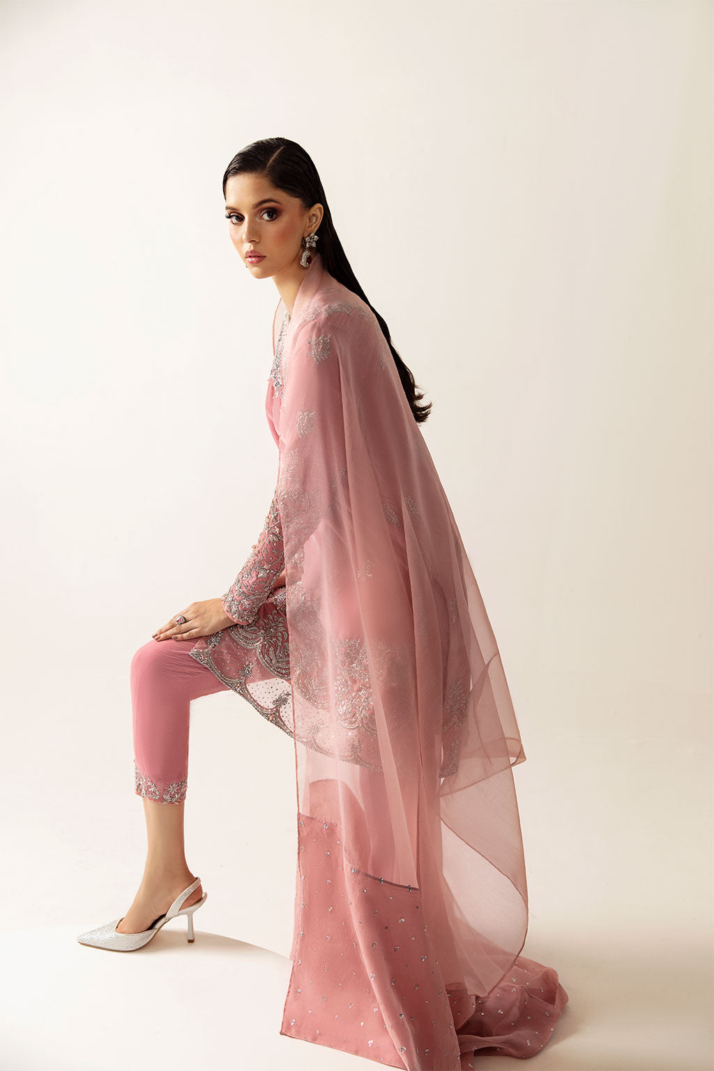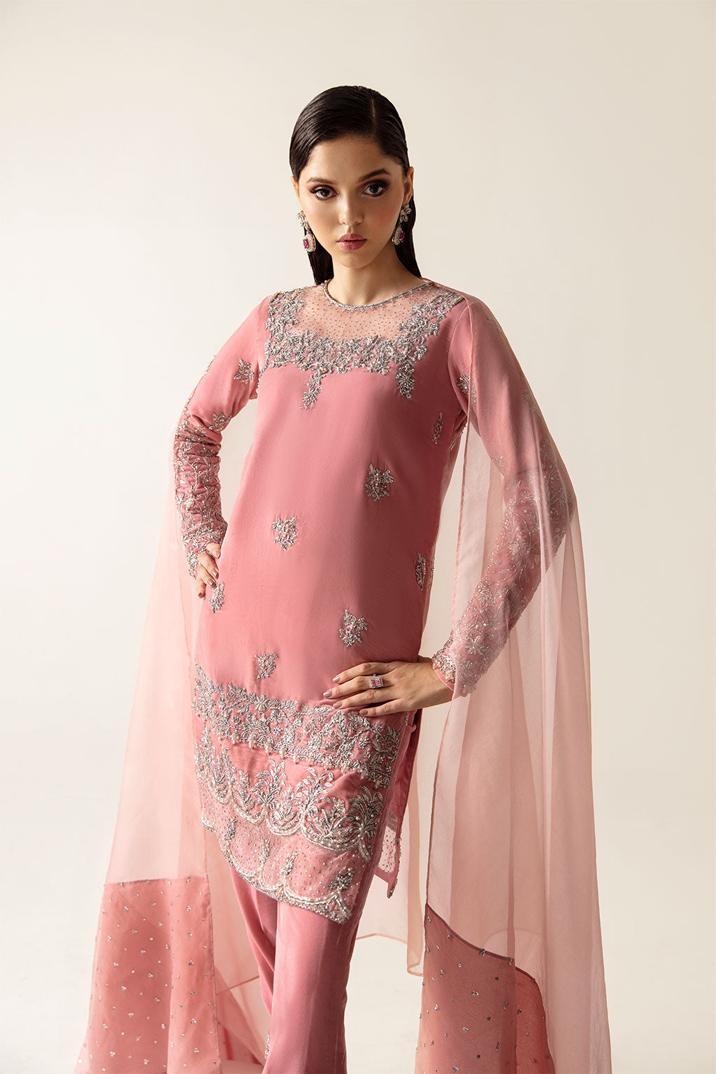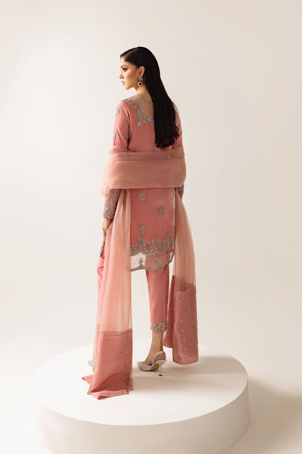 Description: Sparkle in style and make a lasting impression as you drape in ethereal charm of pink velvet outfit. The dazzling knee-length velvet shirt has stylish neckline and is lavishly bejewelled with silver embellishments that exudes timeless beauty and ethereal charm. Accompanied by velvet cigarette pants having silver adda work and organza dupatta featuring raw-silk borders with delicate spray.