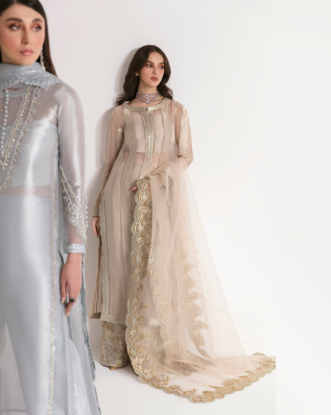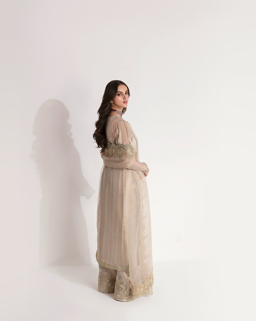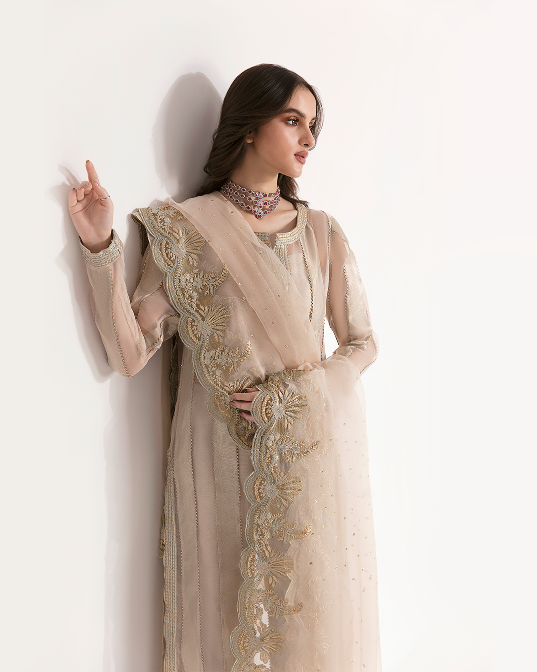 An enchanting creamy beige tissue and organza paneled shirt, crafted with delicate precision and bedecked with an intricately embroidered neckline border. Paired with Indian tissue wide-leg pants, fully embellished with a dazzling dull gold framework, this ensemble exudes an air of regal sophistication. The organza dupatta with an embroidered scalloped border and a fully sequinned spray add the perfect finishing touches to this opulent creation.