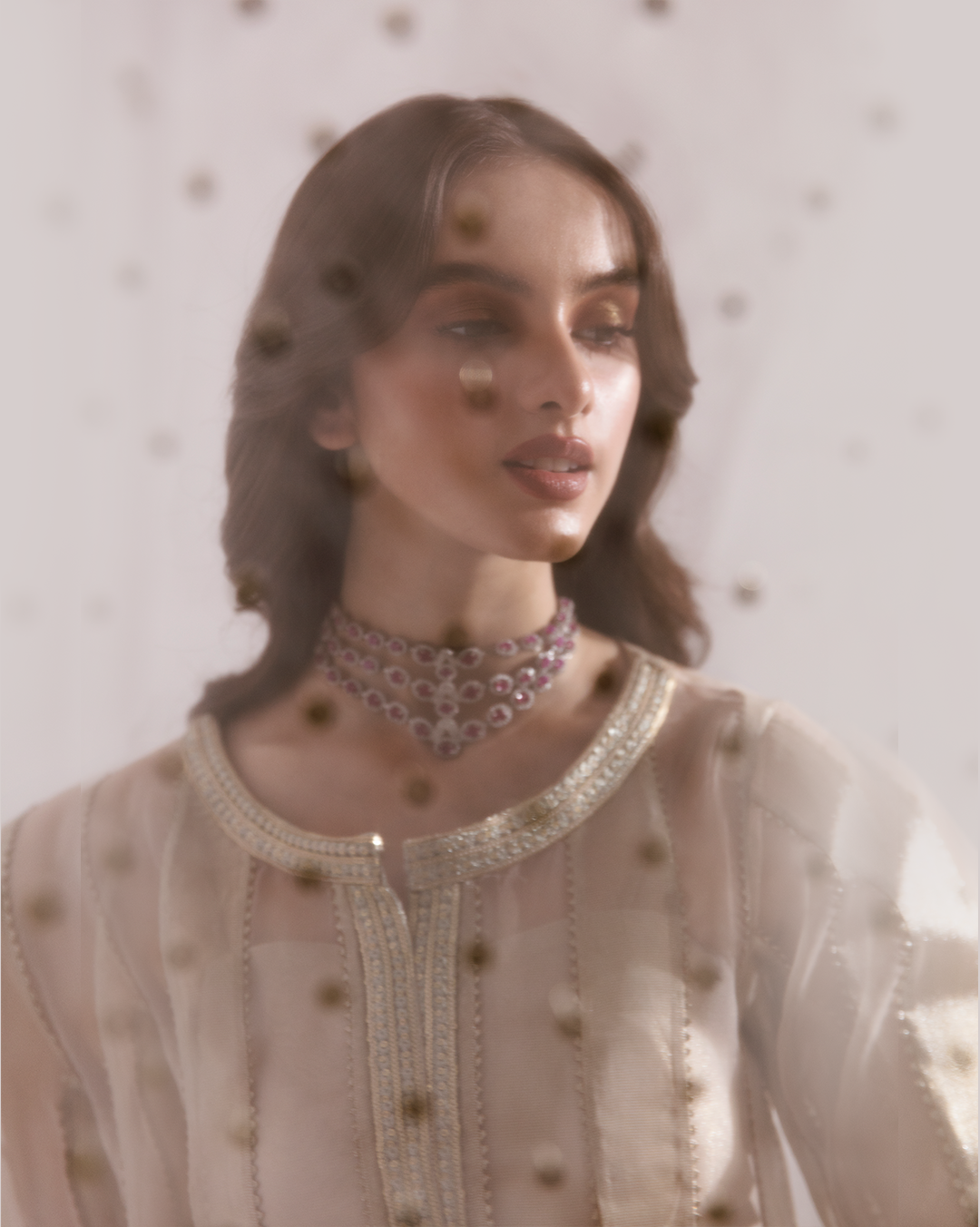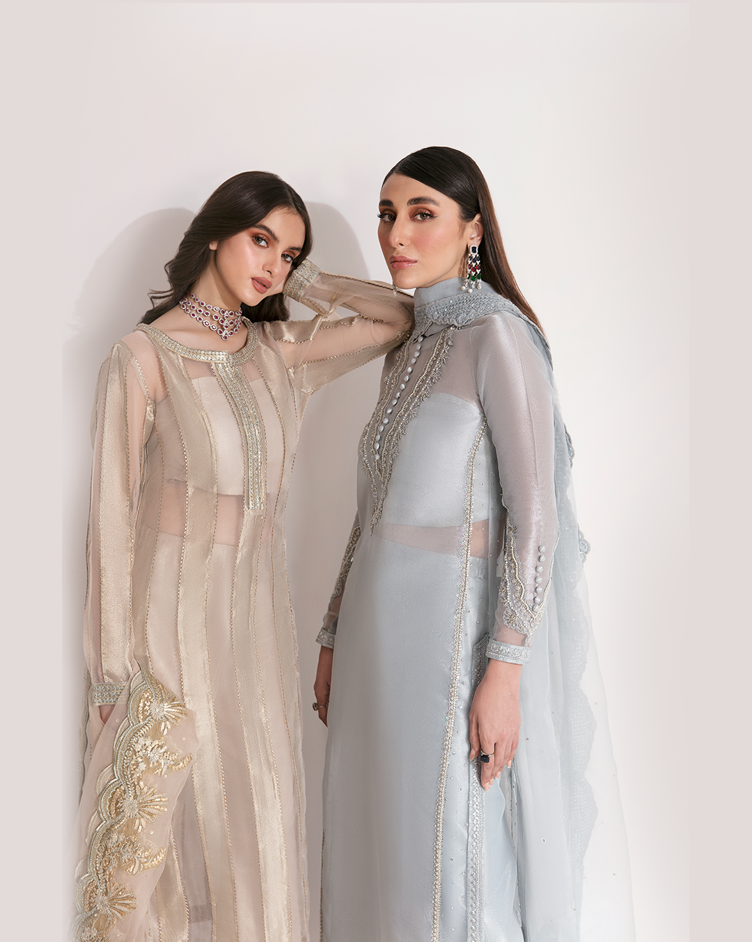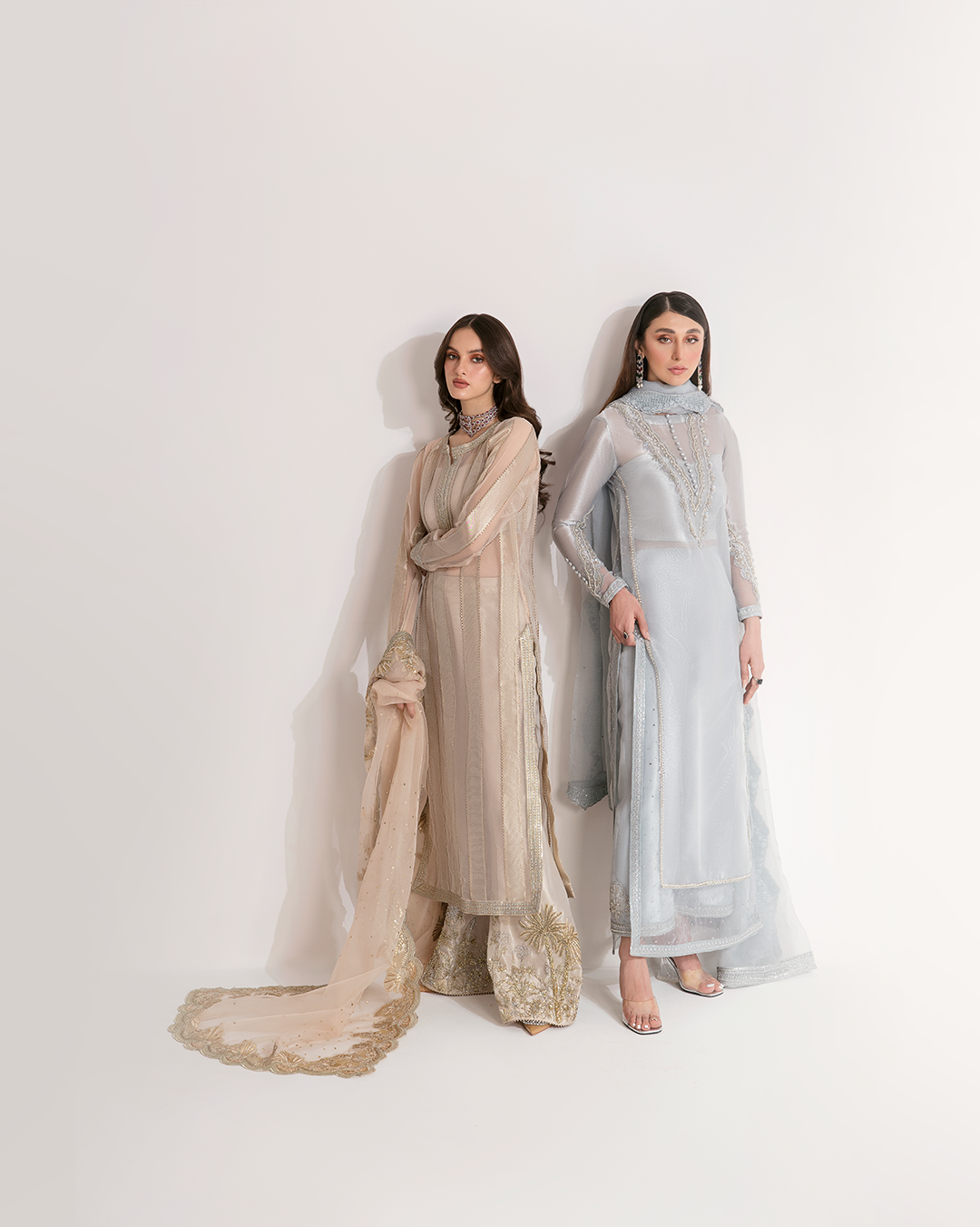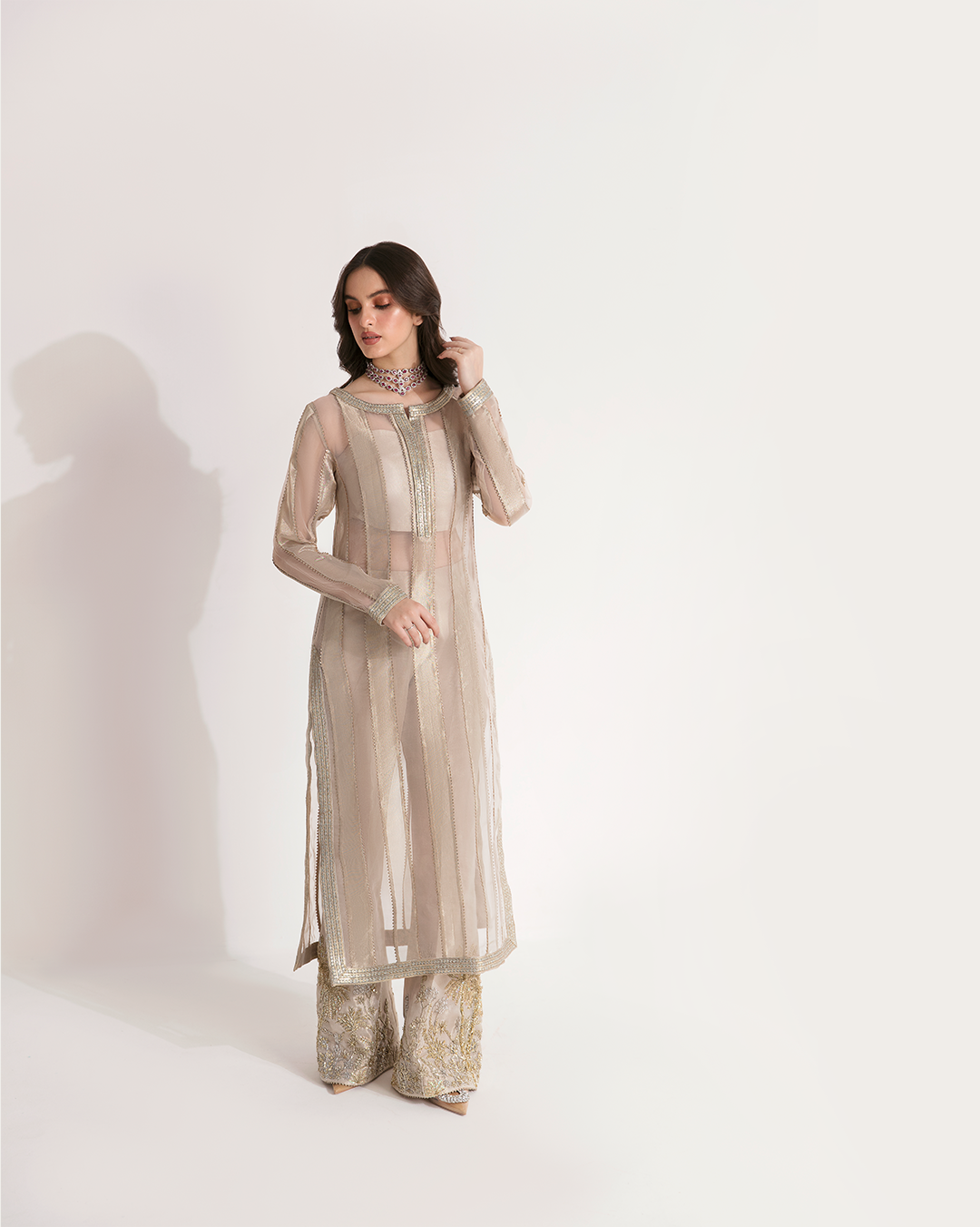 An enchanting creamy beige tissue and organza paneled shirt, crafted with delicate precision and bedecked with an intricately embroidered neckline border. Paired with Indian tissue wide-leg pants, fully embellished with a dazzling dull gold framework, this ensemble exudes an air of regal sophistication. The organza dupatta with an embroidered scalloped border and a fully sequinned spray add the perfect finishing touches to this opulent creation.