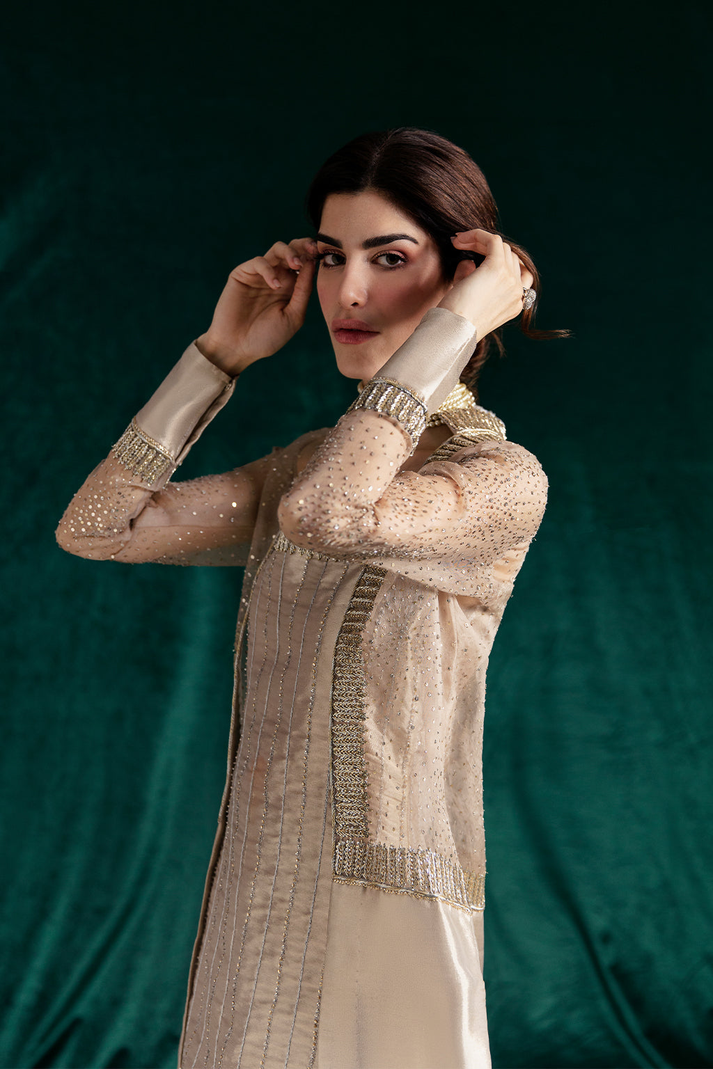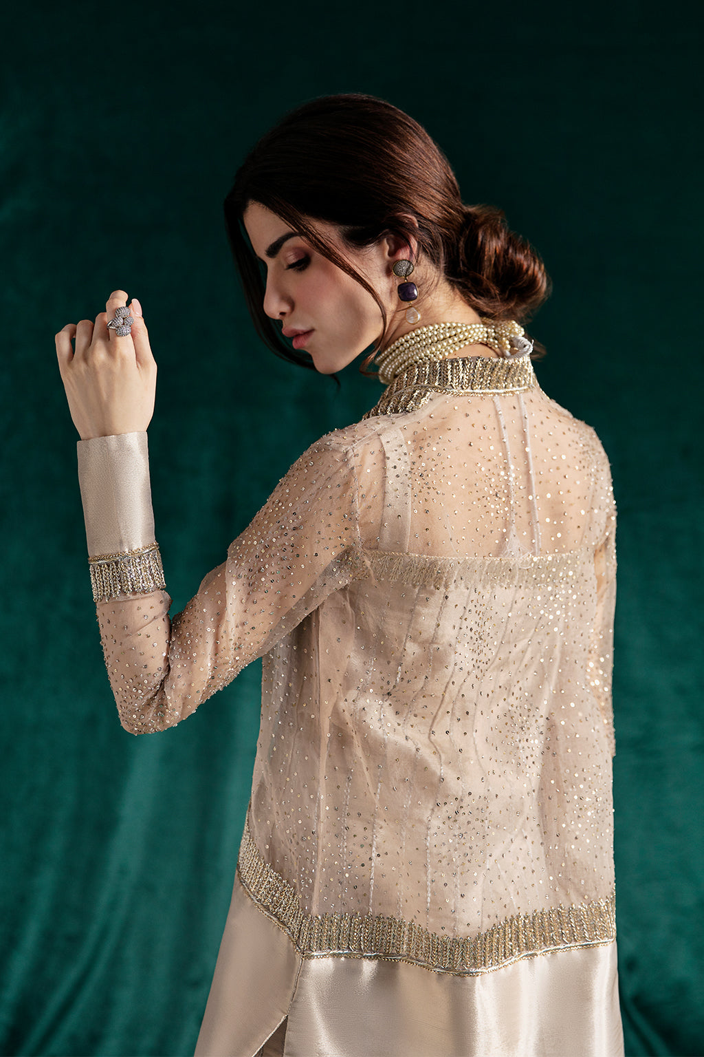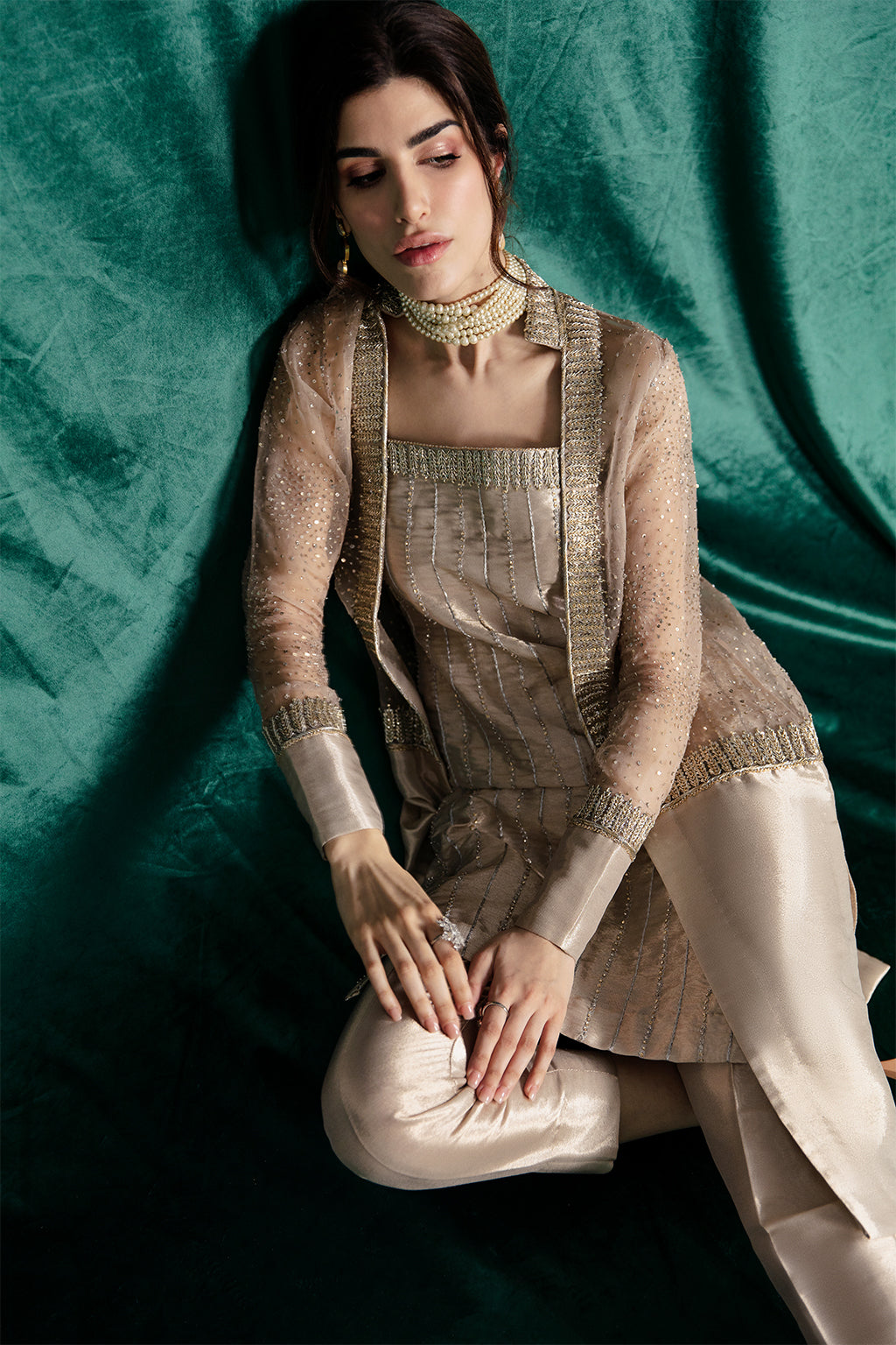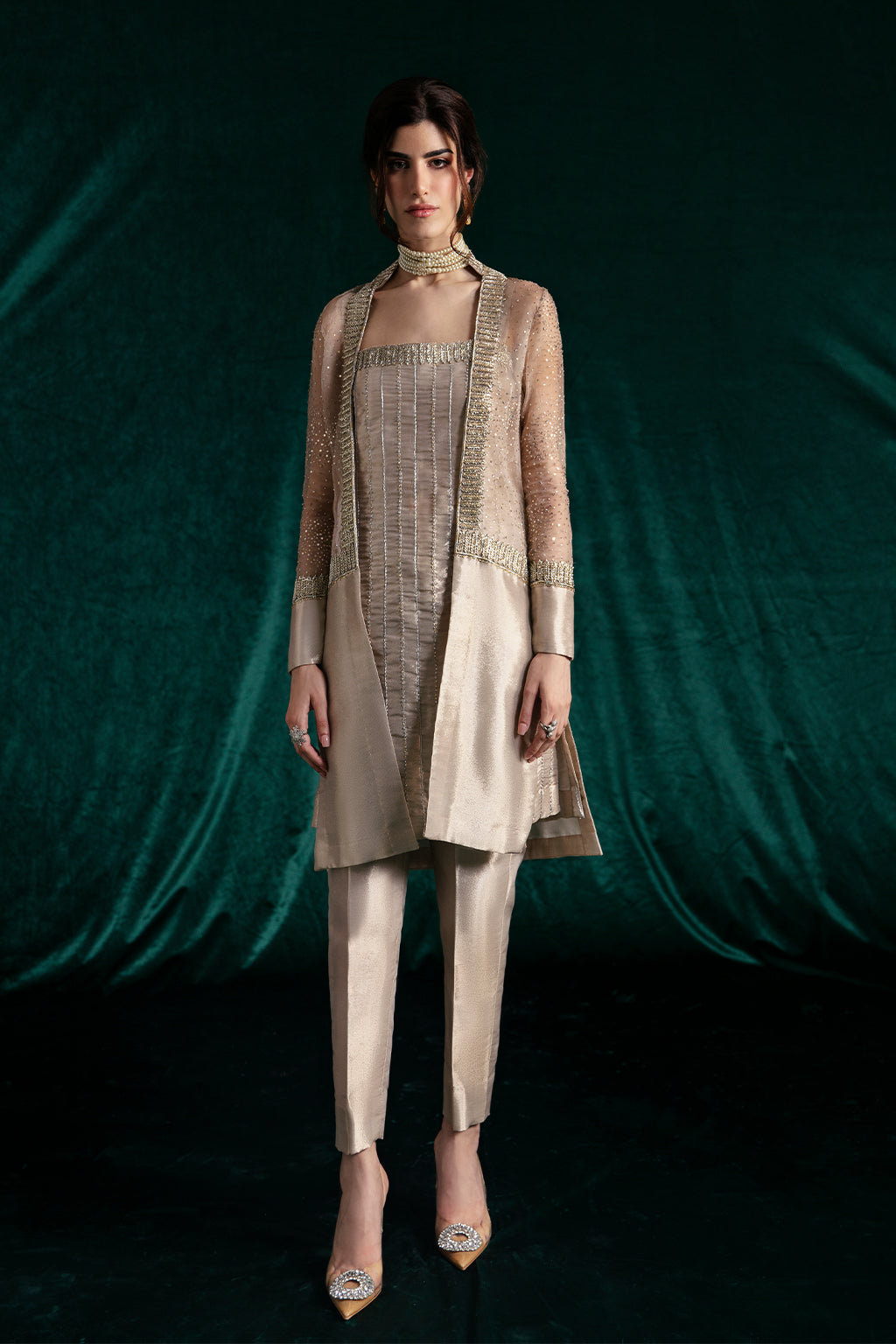 Description: Sparkle in style this season in a knee-length front open jacket paired with cigarette pants. A dainty dull gold front open jacket is made from a harmonic blend of luxurious organza and tissue fabric. It is bedecked with intricate silver and golden hand embellishments on the front, back and sleeves. Paired with a short undershirt and cigarette pants crafted on tissue fabric, which adds a touch of glamour and completes the look effortlessly.