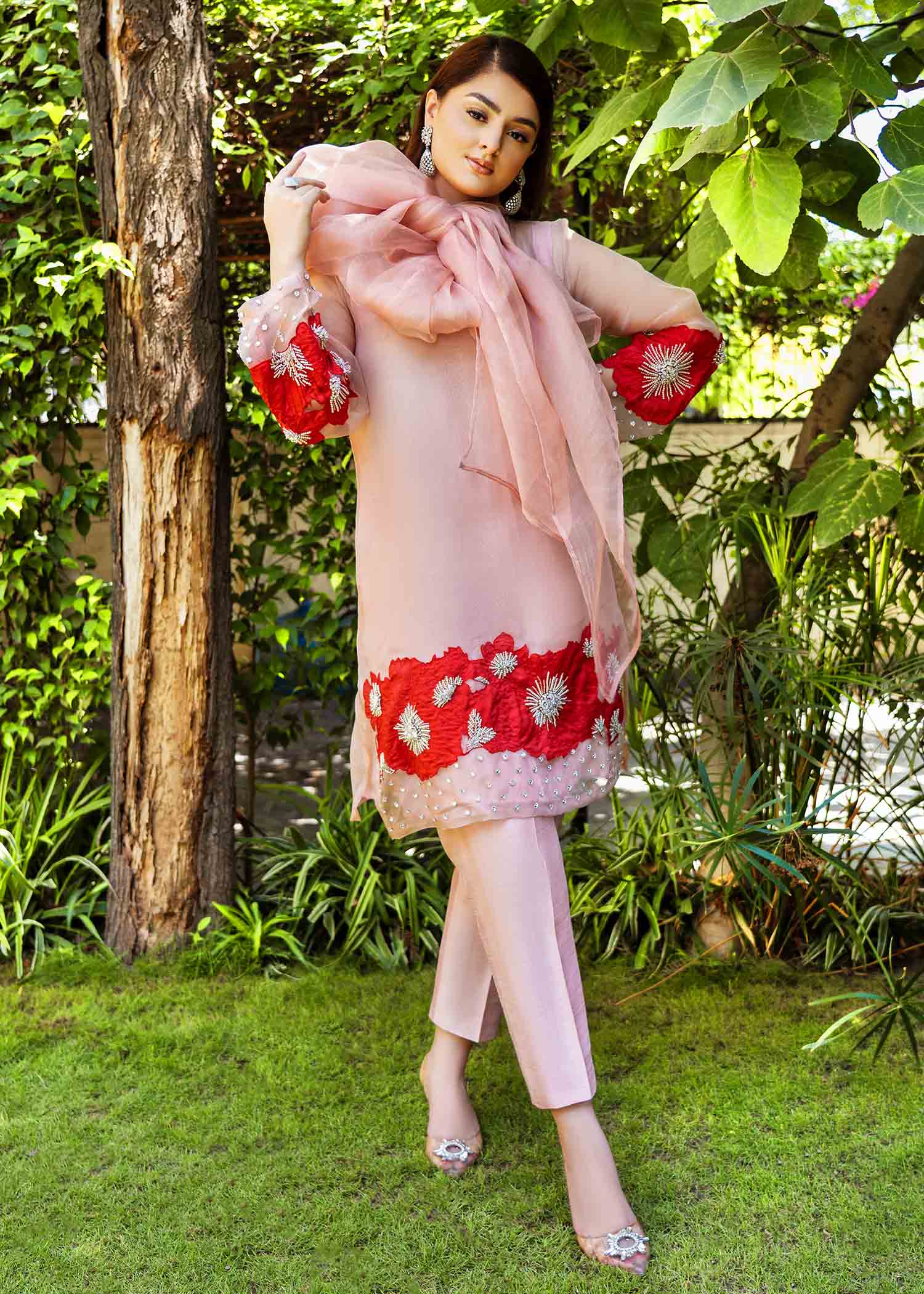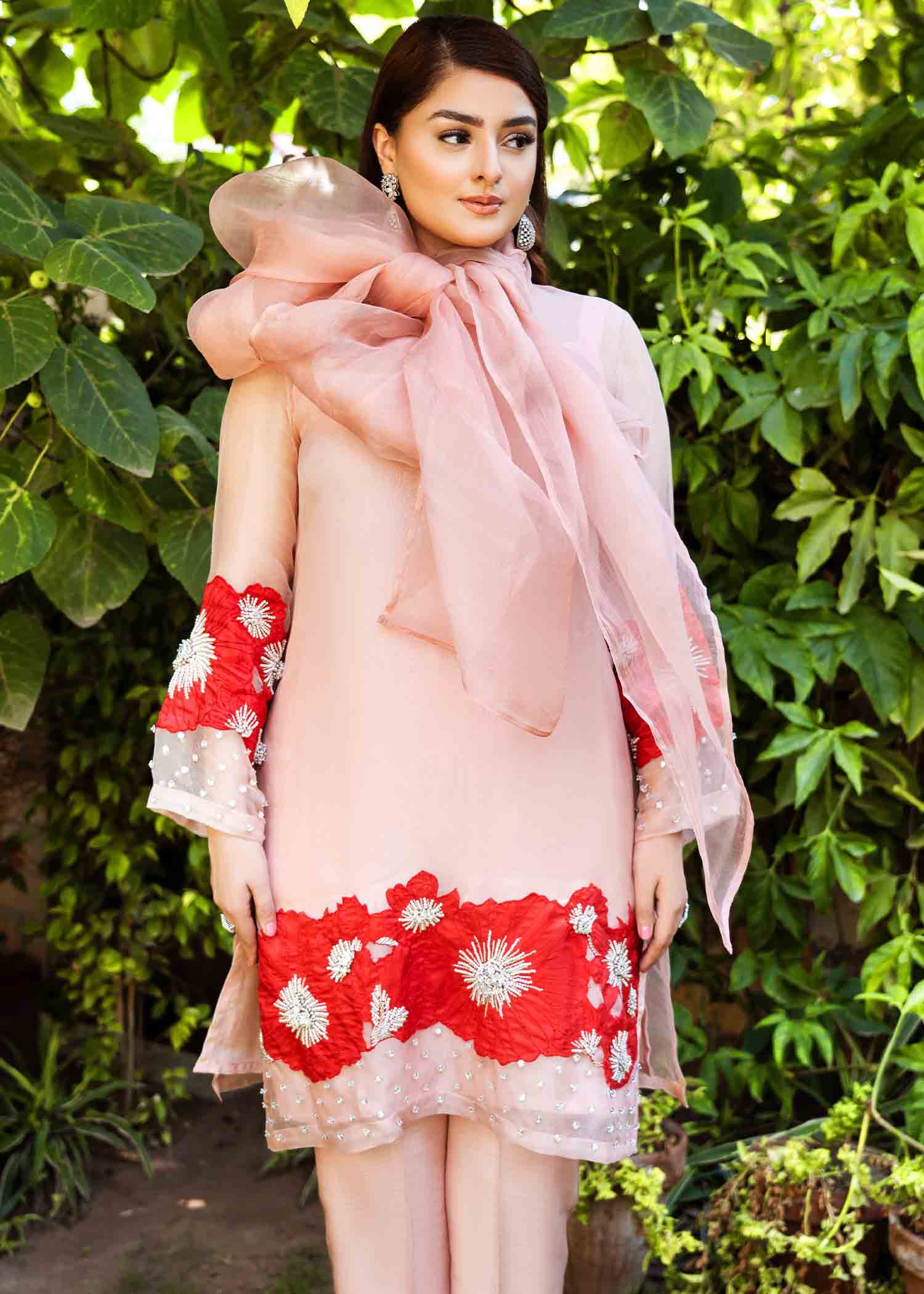 Description: Minimalist is the key to fashion statements. A subtle salmon shade complimented with melodic shades of burnt orange adds bliss to your scorching days. made in pure organza and grip silk pants totally hand embellishments.