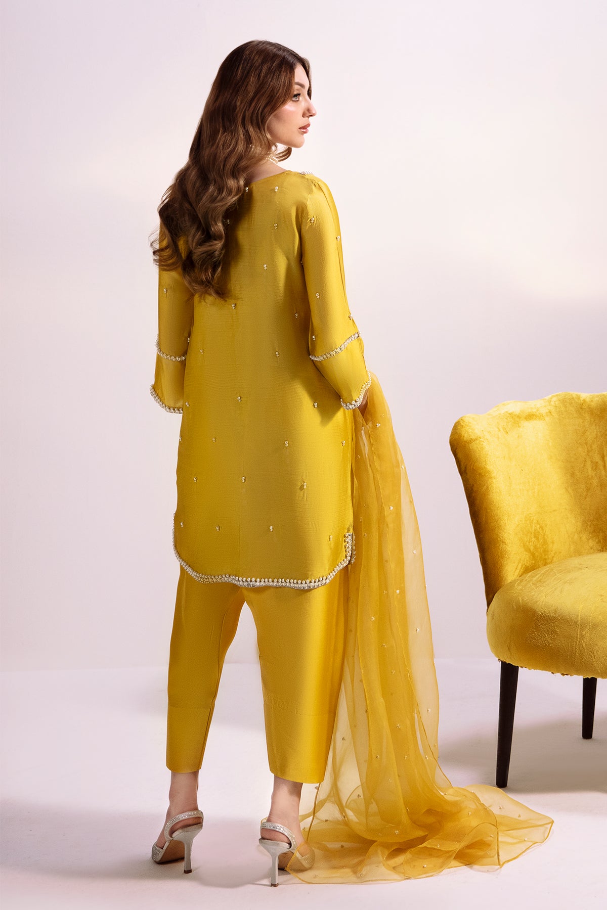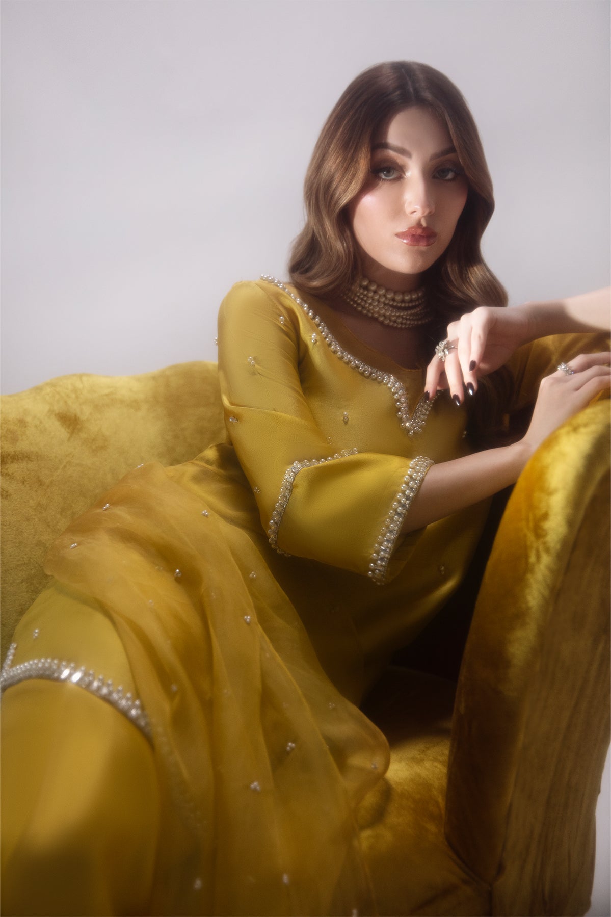 Description: Bask in the radiance of this resplendent yellow ensemble, a true masterpiece of grace and refinement. The signature ‘Mina’ cut kamez takes center stage, captivating with its uniquely sculpted neckline that exudes effortless elegance. This stunning piece is adorned with meticulous ada work of shimmering silver embellishments intertwined with luminous pearls and dazzling stones along the neckline, sleeves, and hem. A delicate pearl spray cascades across the shirt, creating an enchanting display of artistry. The look is completed with a skinny shalwar and an ethereal organza dupatta adorned withasoft pearl spray. Whether it’s a grand celebration or an intimate soirée, this ensemble ensures you radiate poise and charm with every step.