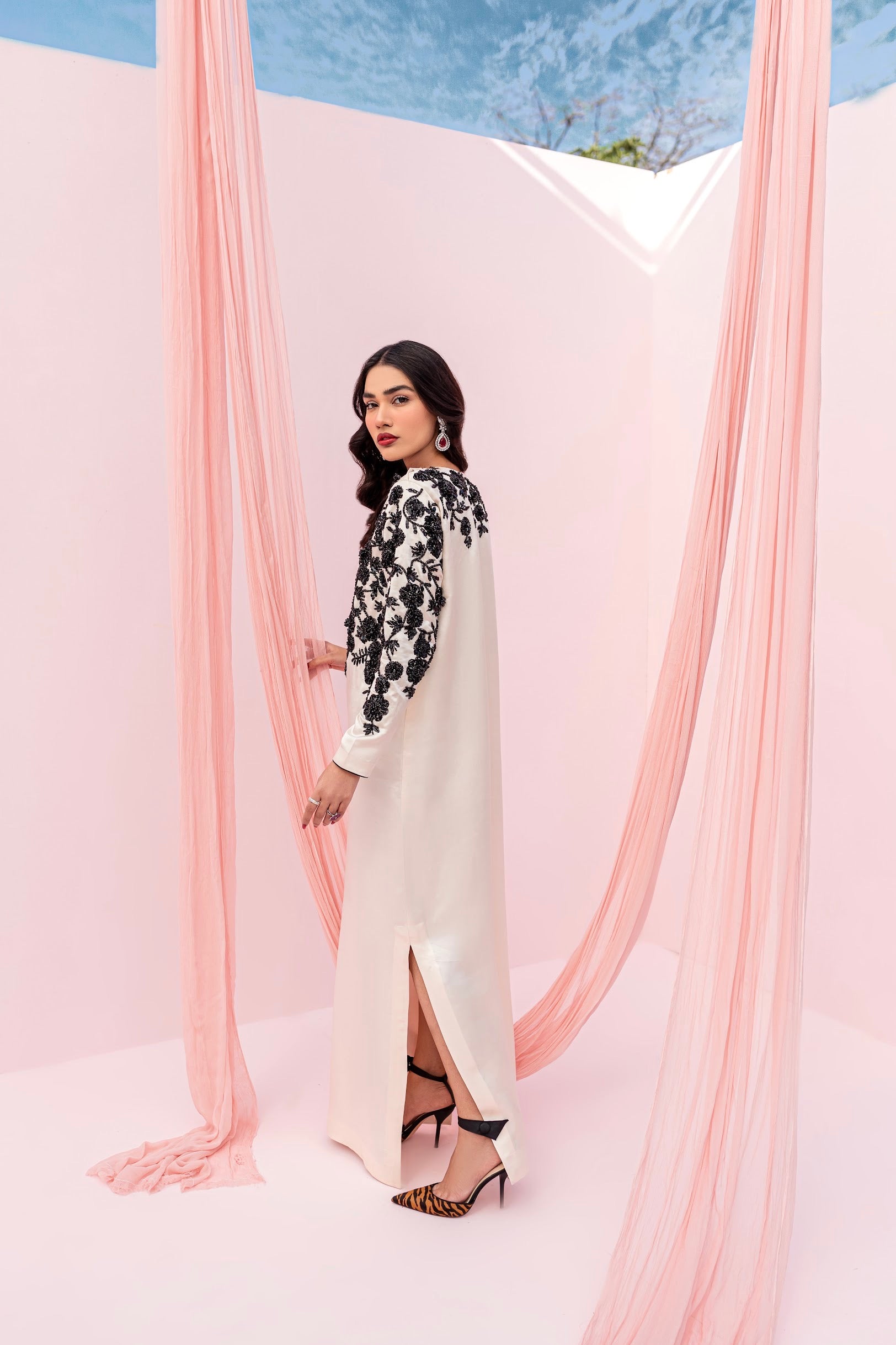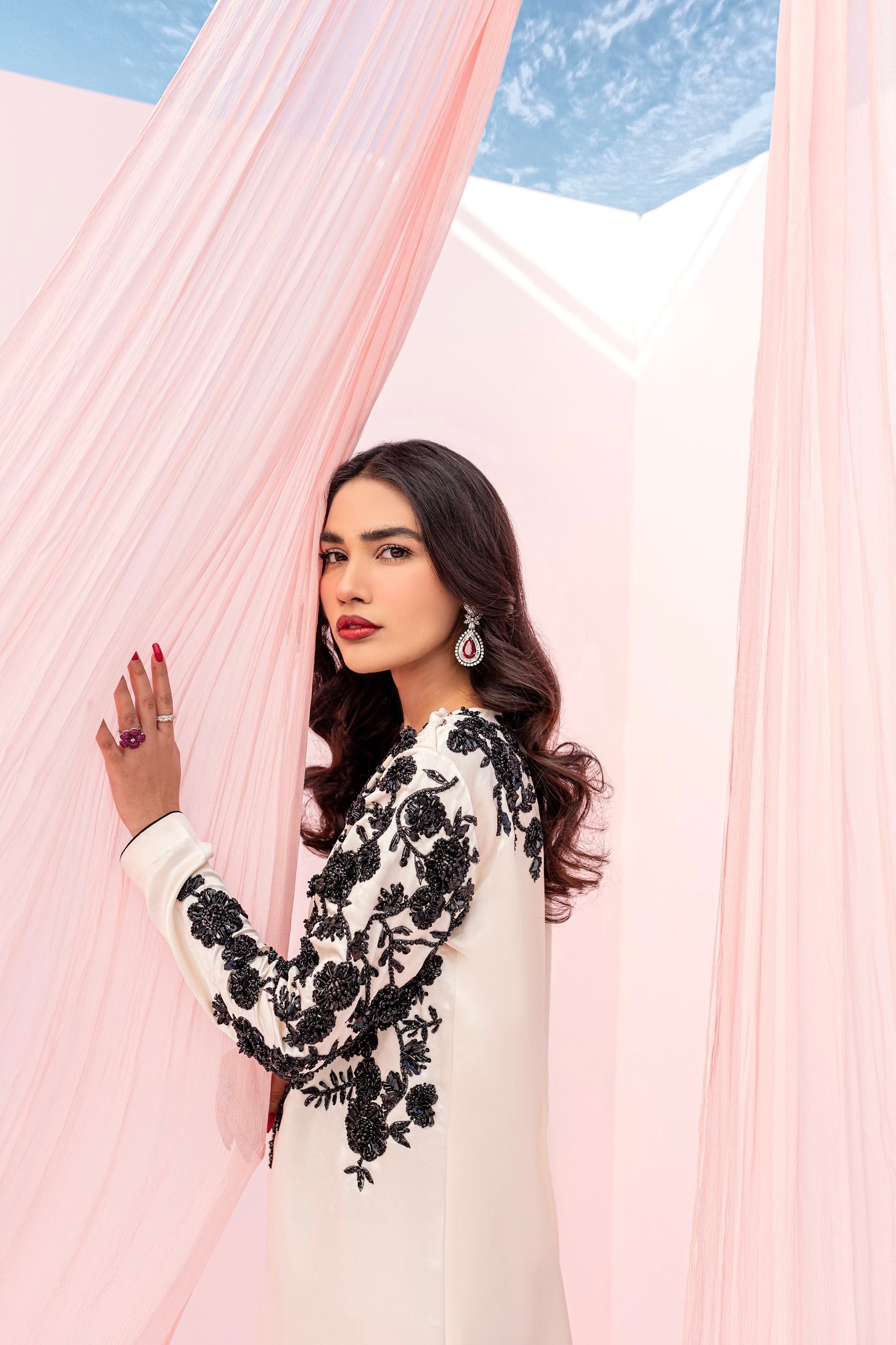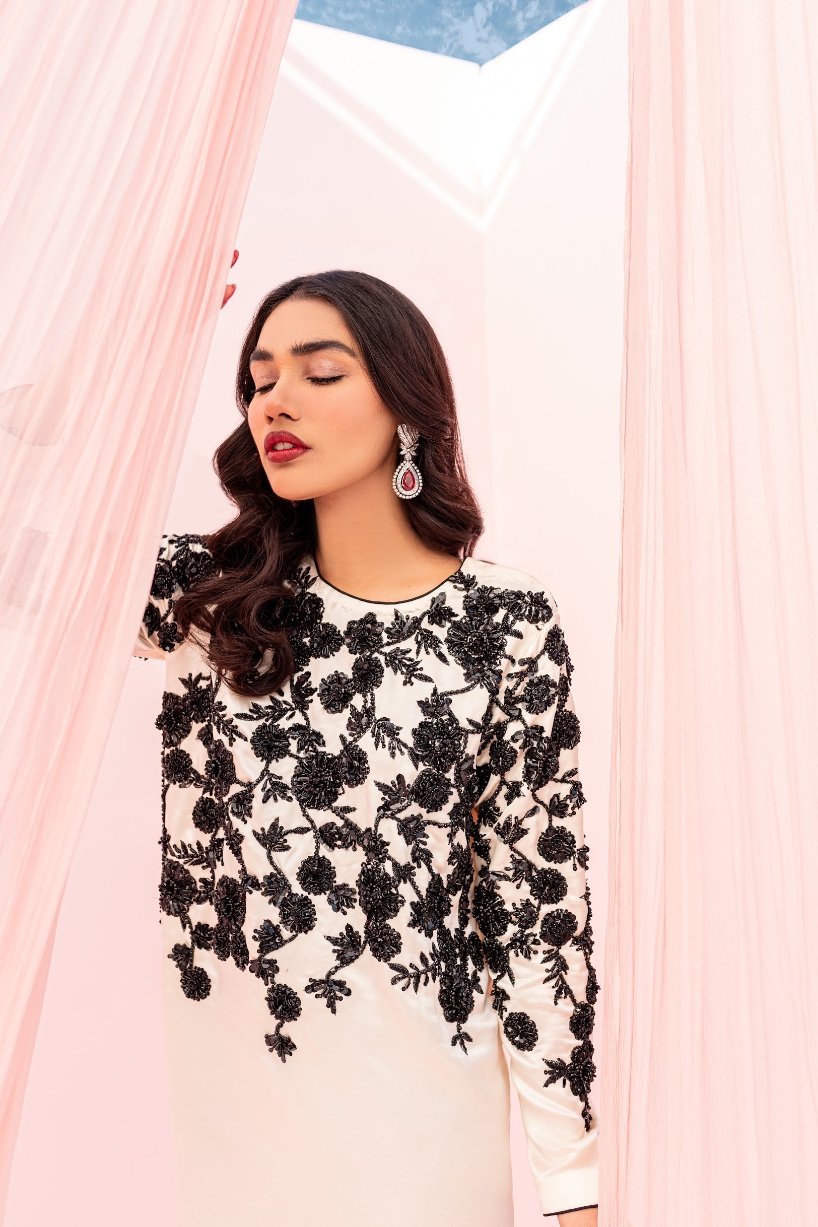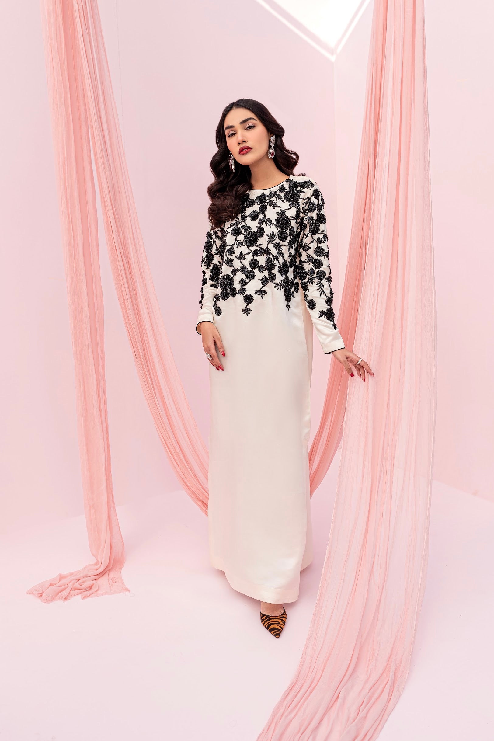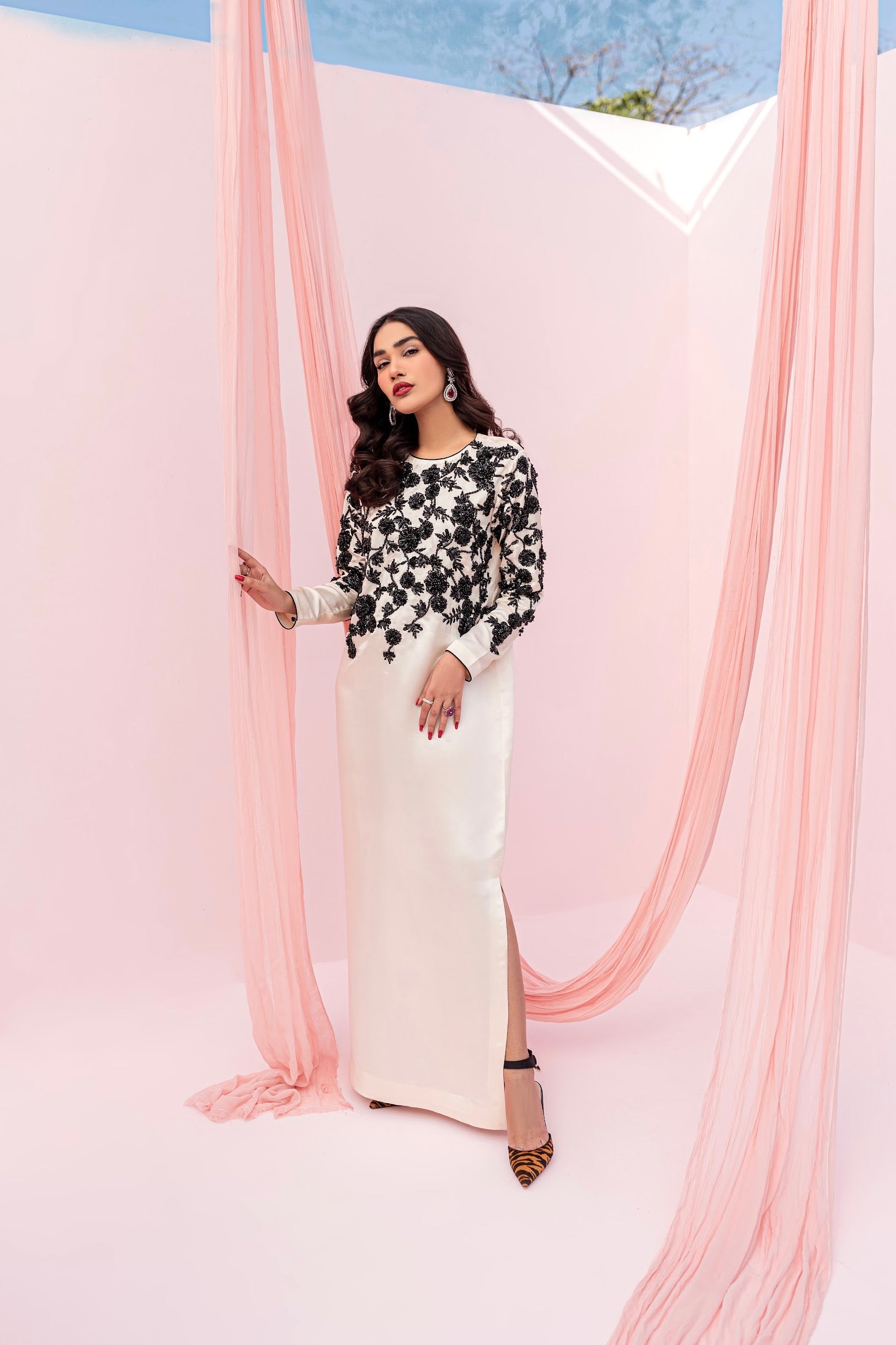 Description: Tullee - Breathing into new beginnings with an opulence personified outfit. Gracing this collection with a mesmerizing off-white gown encrusted with black handiwork by our finest craftsmen.