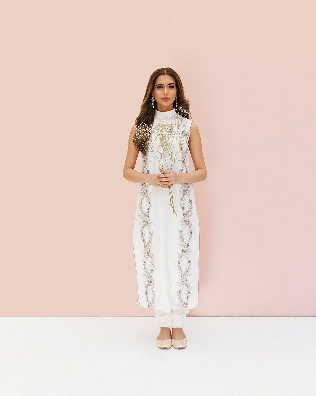 Description: A luxurious raw Silk shirt, adorned with exquisite hand, embellishments in shades of silver and lilac. Paired with chic wide-leg pants and organza dupatta with a delicate spray of sequins adds a touch of ethereal beauty to this captivating ensemble.