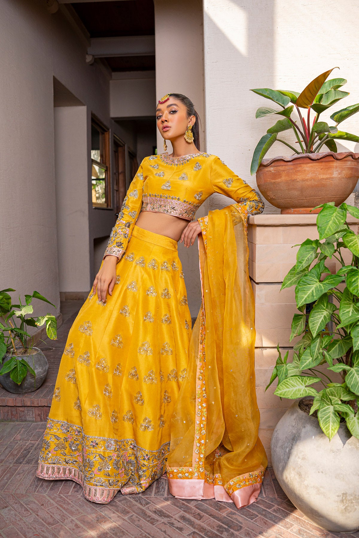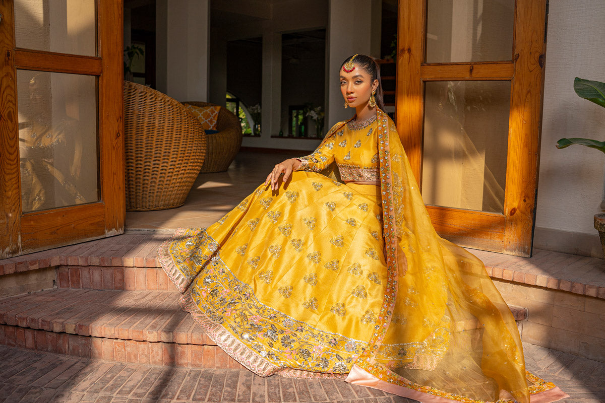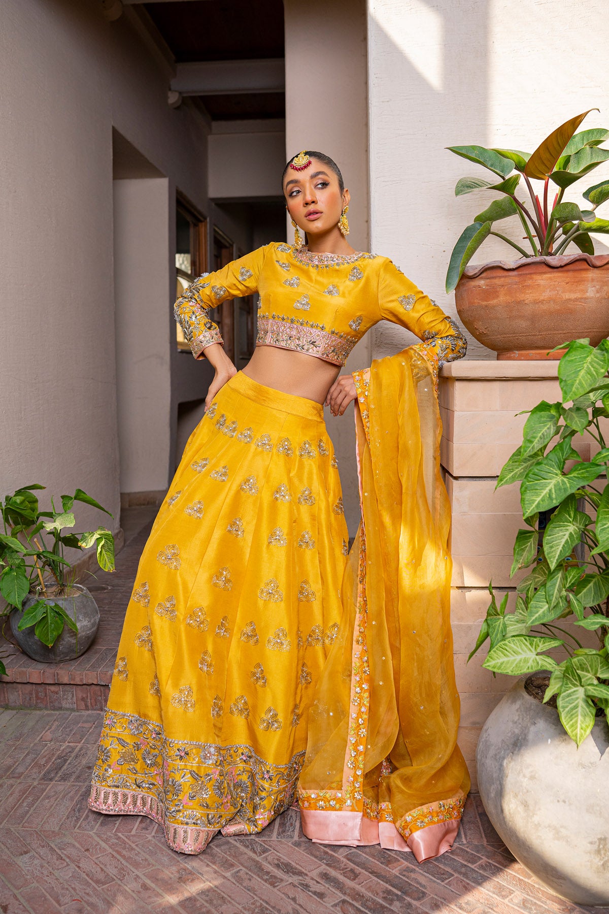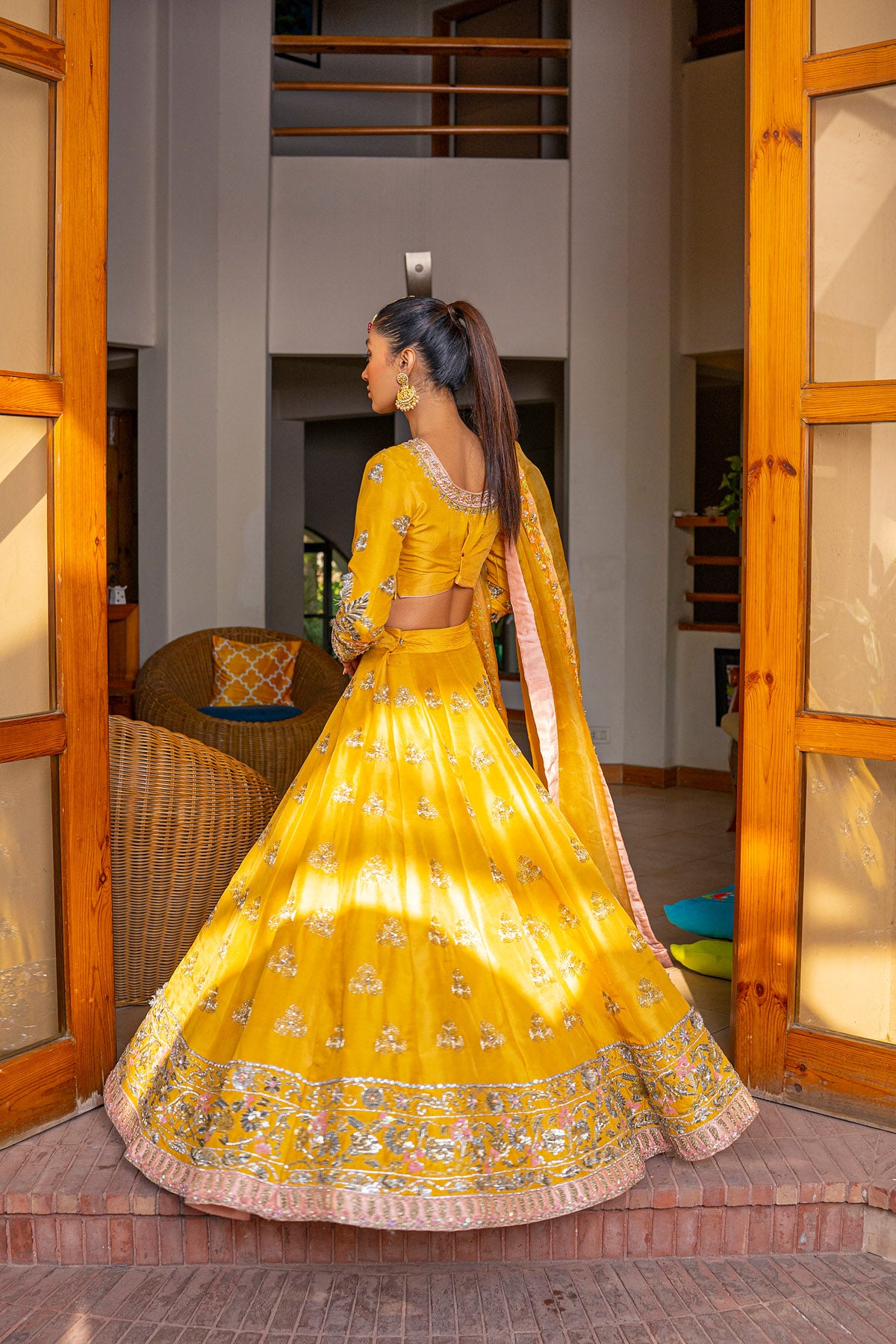 Description: Donned with the classic combination of sunshine yellow and vibrant silver, this majestic ensemble casts ab ethereal look for your special day. CHOLI IS IN PURE 80 GMS RAW SILK. LEHNGA IS MADE IN RAW SILK 80 GMS WITH TOTALLY HAND EMBELLISHMENTS, AND THE DUPATTA IS TOTALLY HAND EMBELLISHED WITH 4 SIDED BORDER.