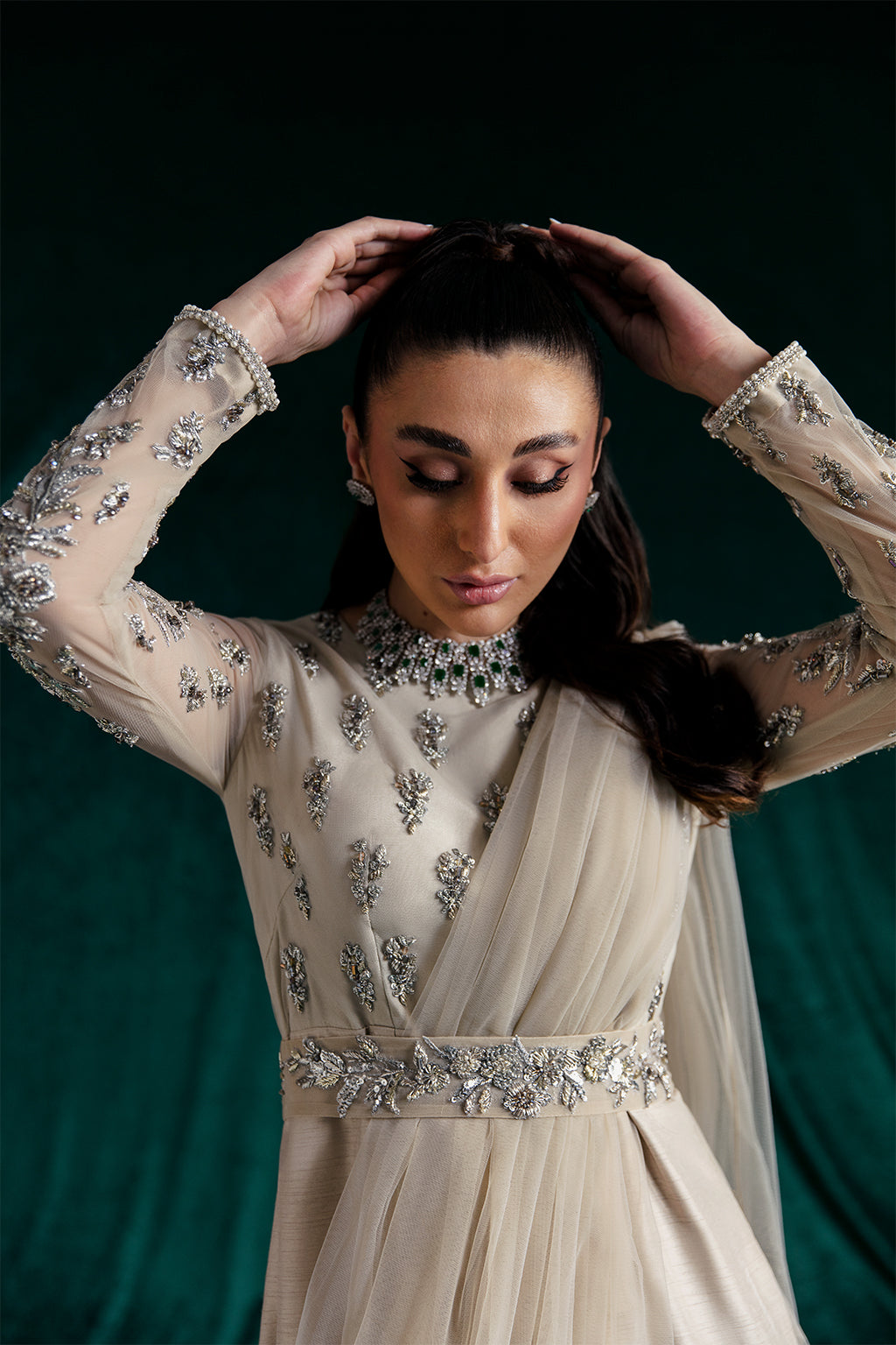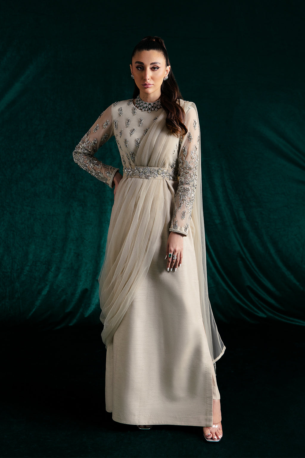 Description: Emanate an air of regal elegance and unparalleled style in a draped saree. Featuring beige draped saree – a harmonious blend of modernity and haute fashion. The net blouse is intricately bejewelled with silver and golden adda work whereas the net drape and satin silk flare make it a statement of enduring style. Completing this masterpiece are the matching satin silk pants, adding a contemporary touch to the outfit's timeless charm.