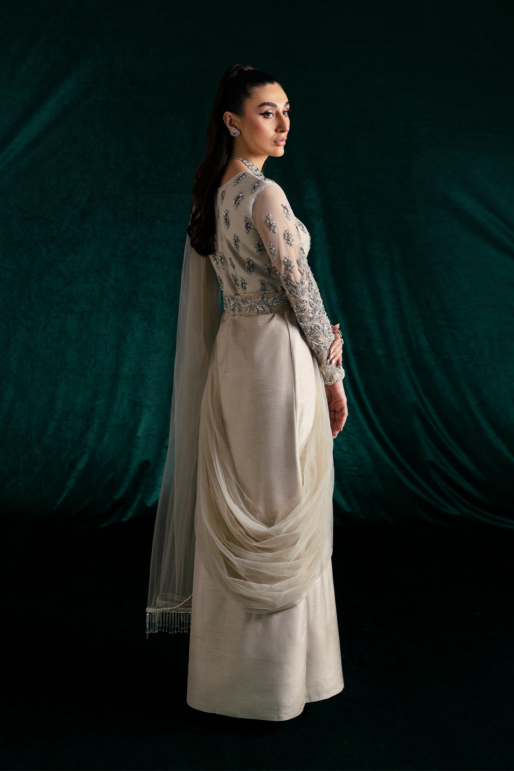Fabric: Net blouse, Net drape, Satin silk flare, Satin silk pants